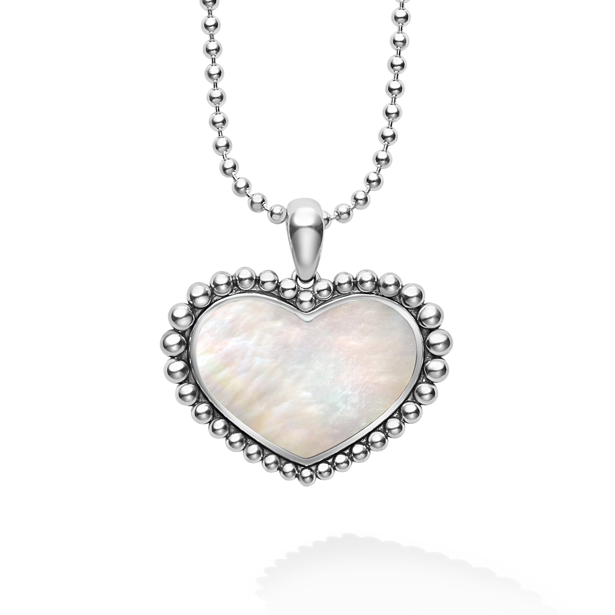 A white mother of pearl gemstone pendant framed by sterling silver Caviar beading in the shape of a heart finished on a ball chain necklace.