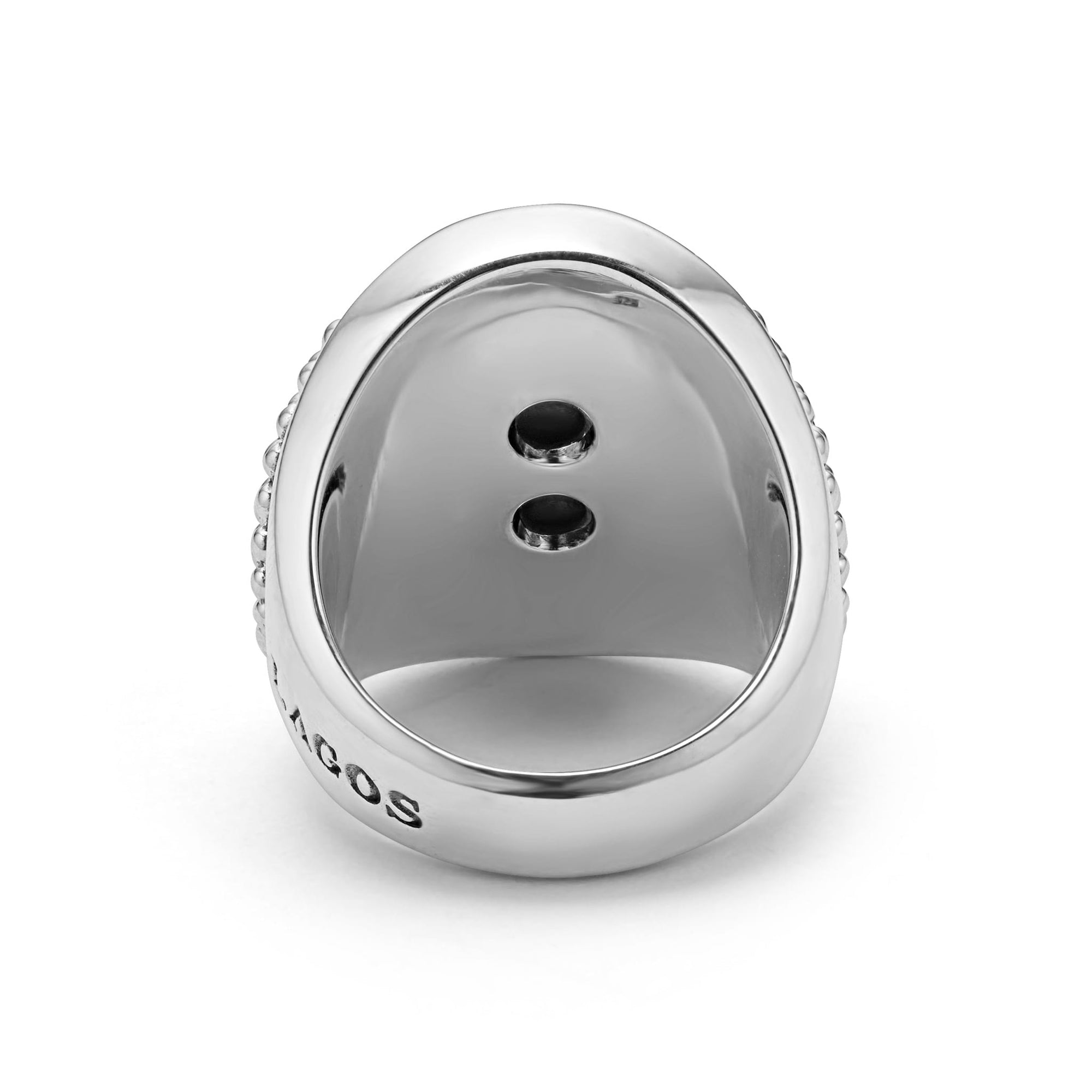 Black agate gemstone and sterling silver Caviar beading form this oval band ring.