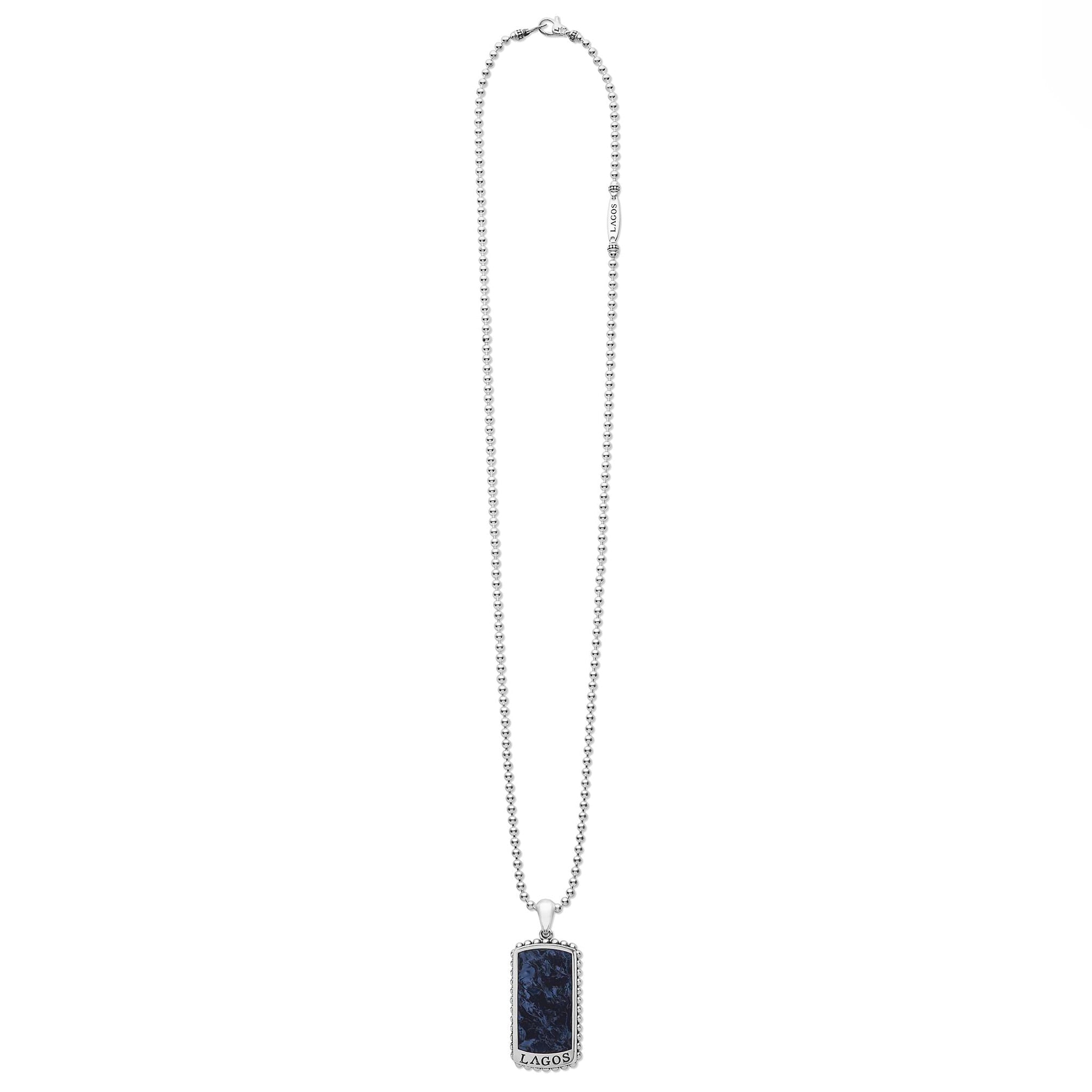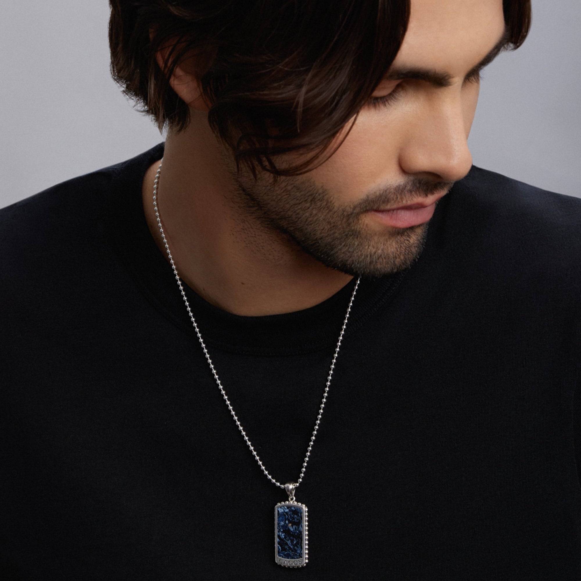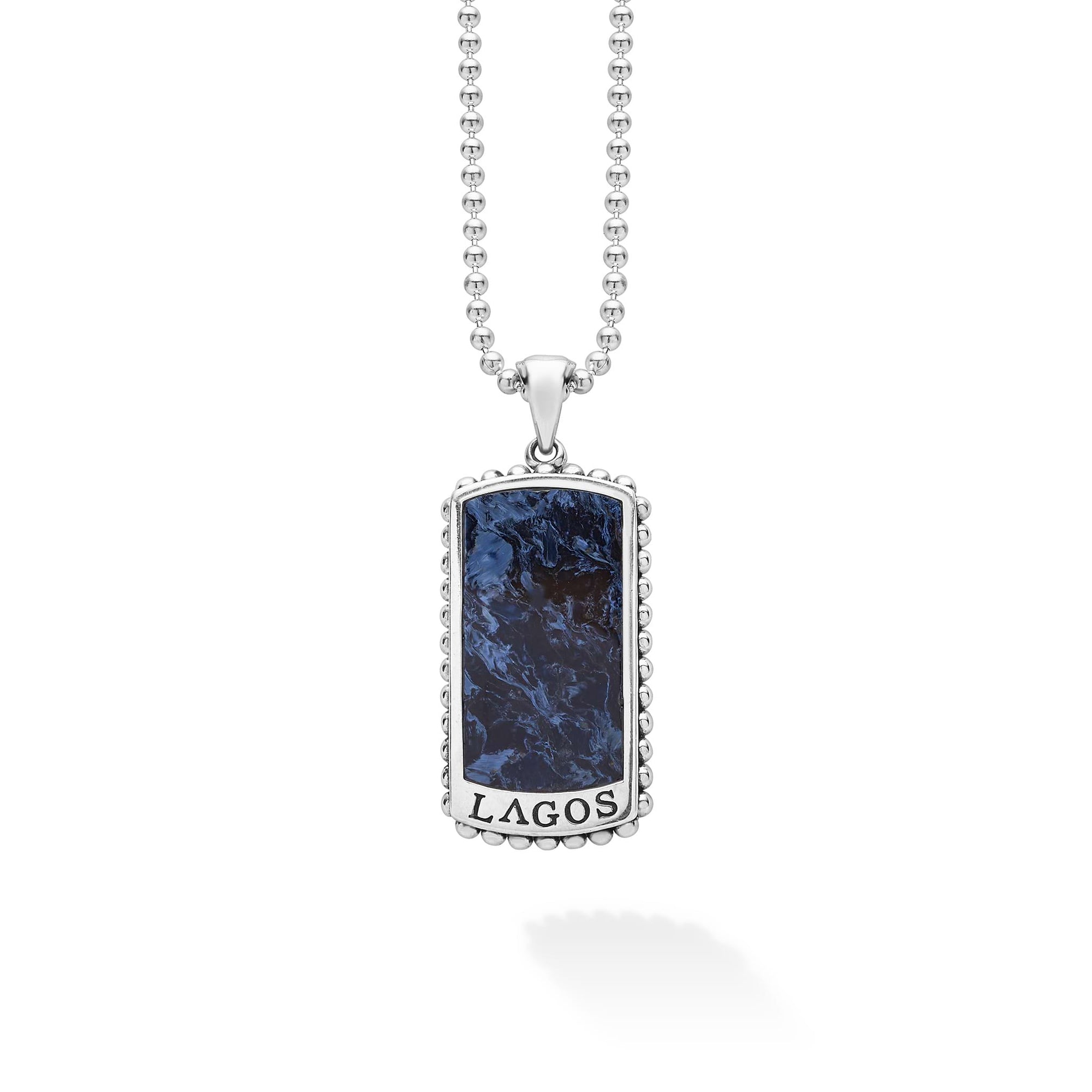 Pietersite accented by sterling silver Caviar beading forms this statement tag amulet featuring a Krunch emblem. Finished on a sterling silver ball chain necklace.