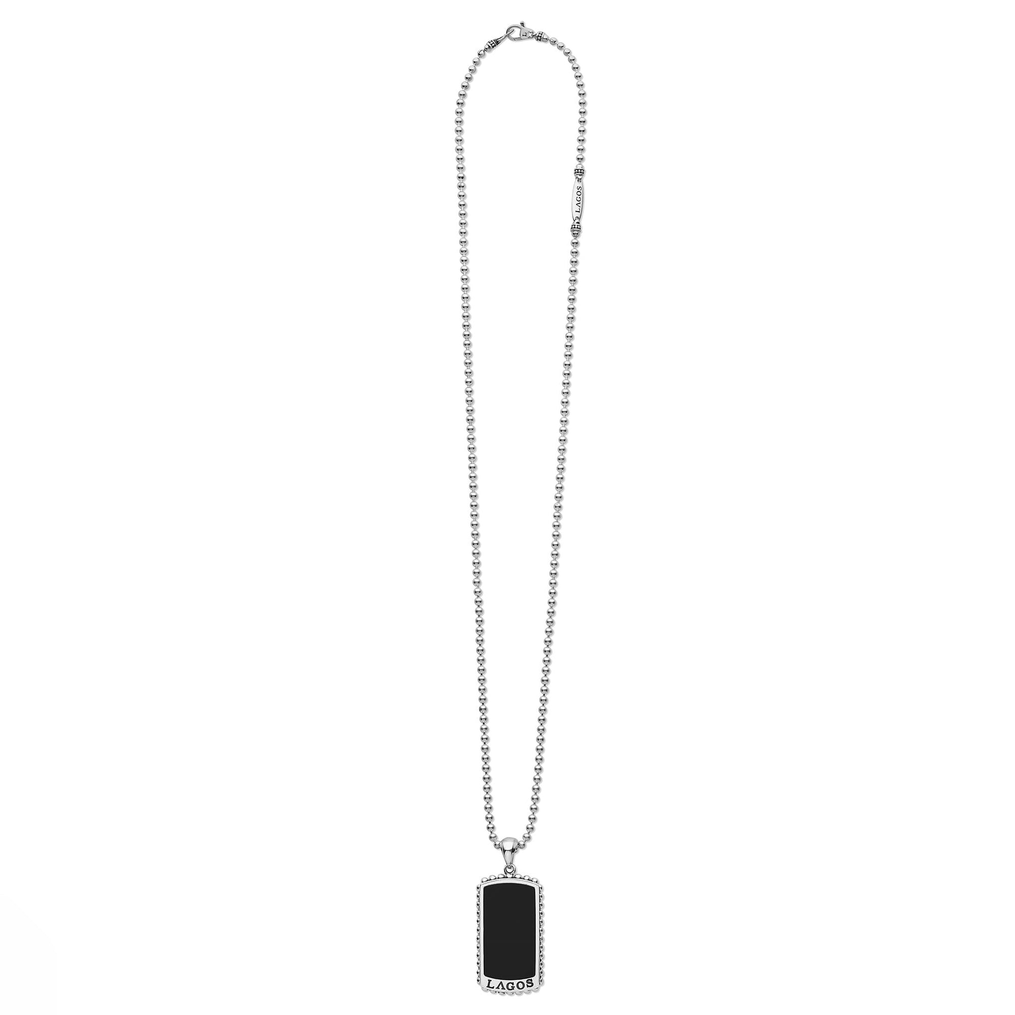 Black agate accented by sterling silver Caviar beading forms this statement tag amulet featuring a Krunch emblem. Finished on a sterling silver ball chain necklace.