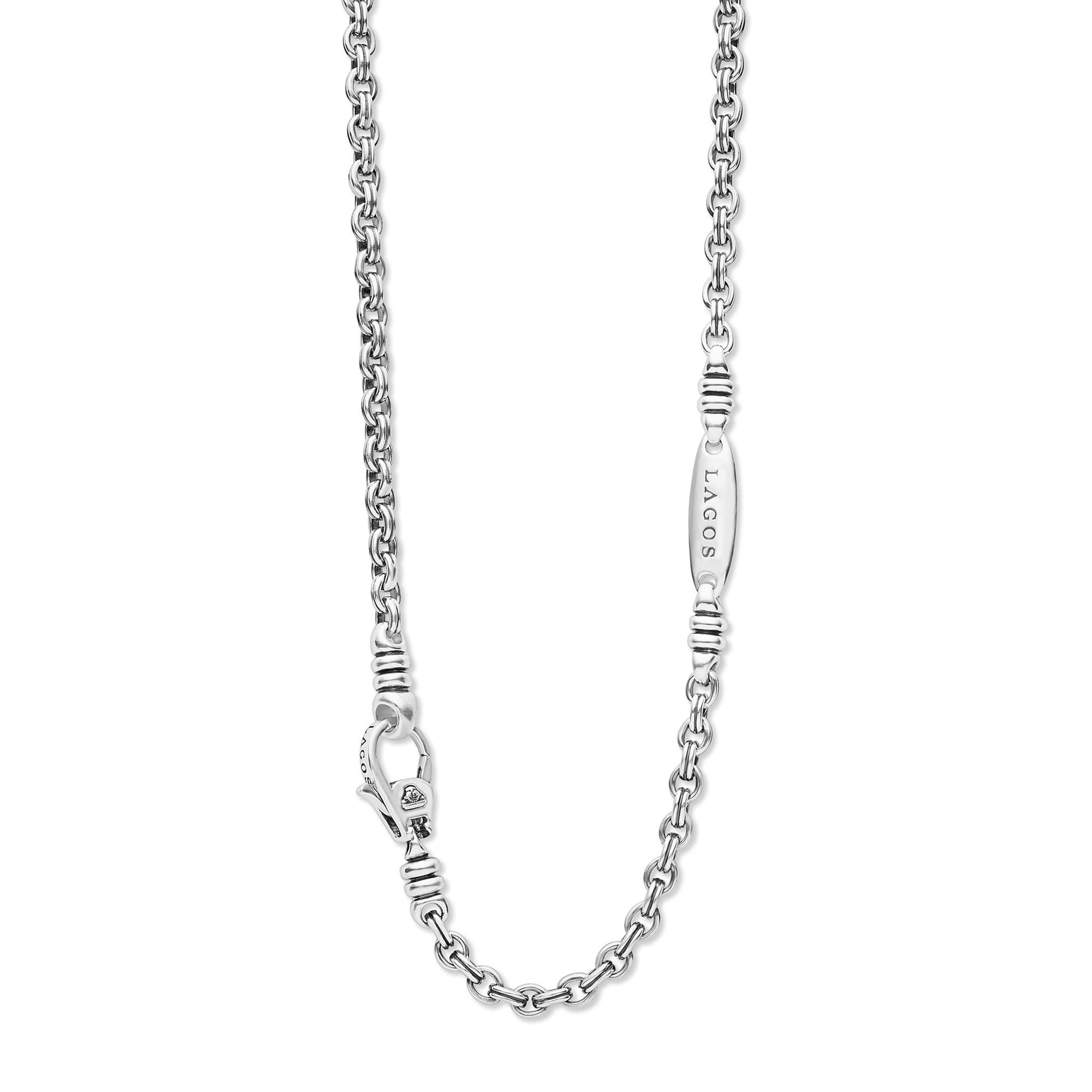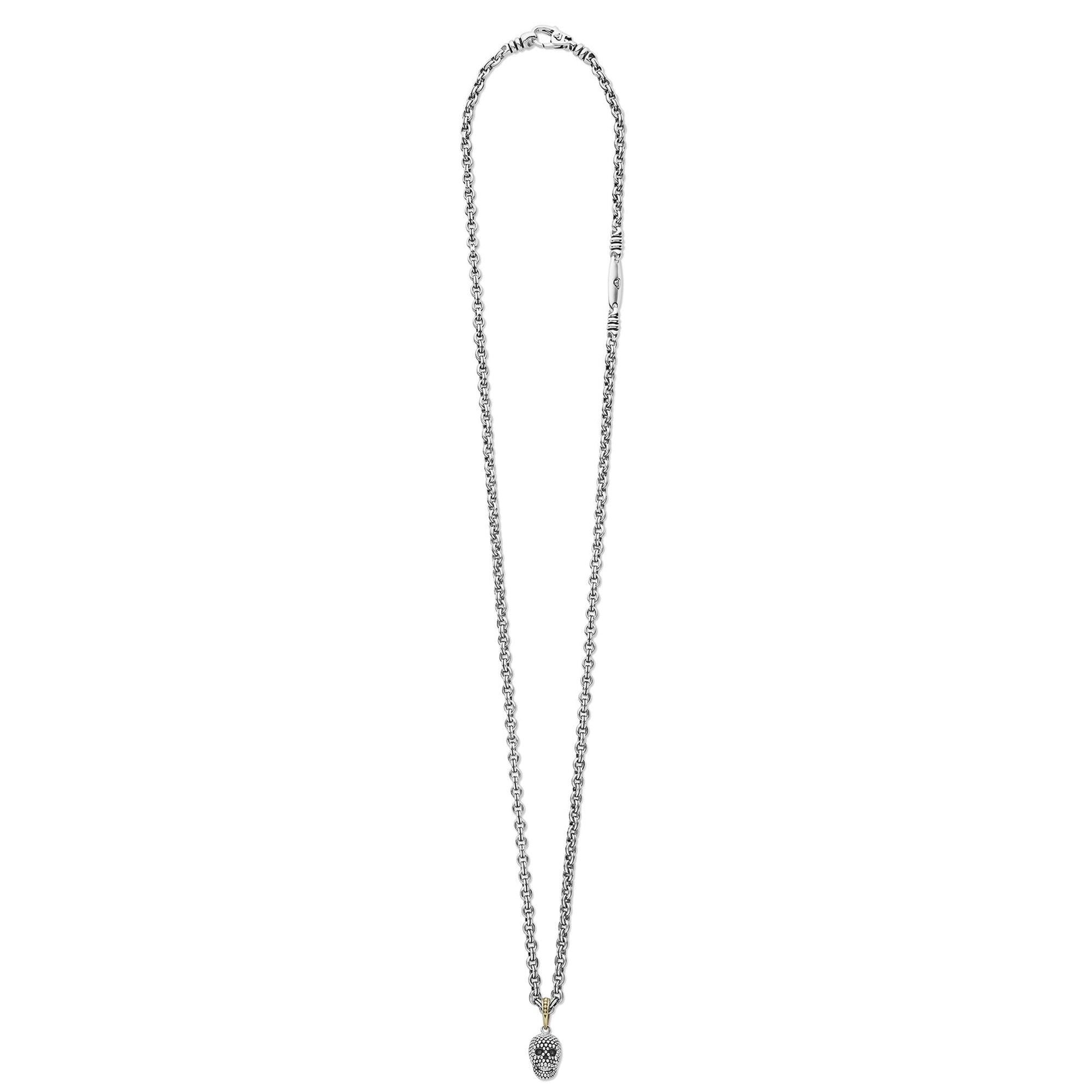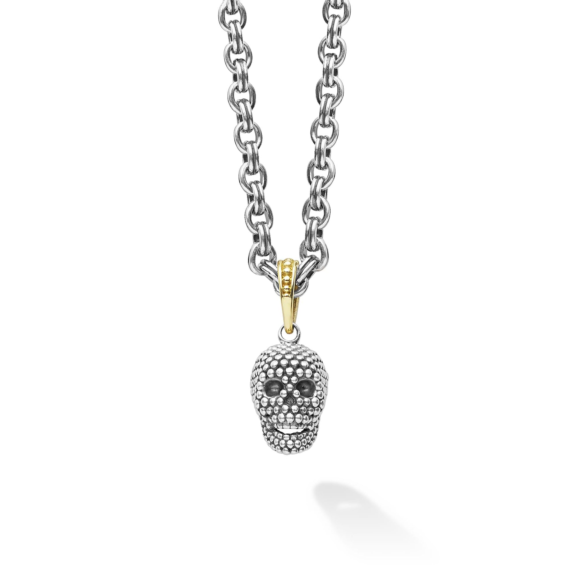 Artfully crafted skull amulet made of sterling silver Caviar beading. Finished on a 3mm double link chain necklace.