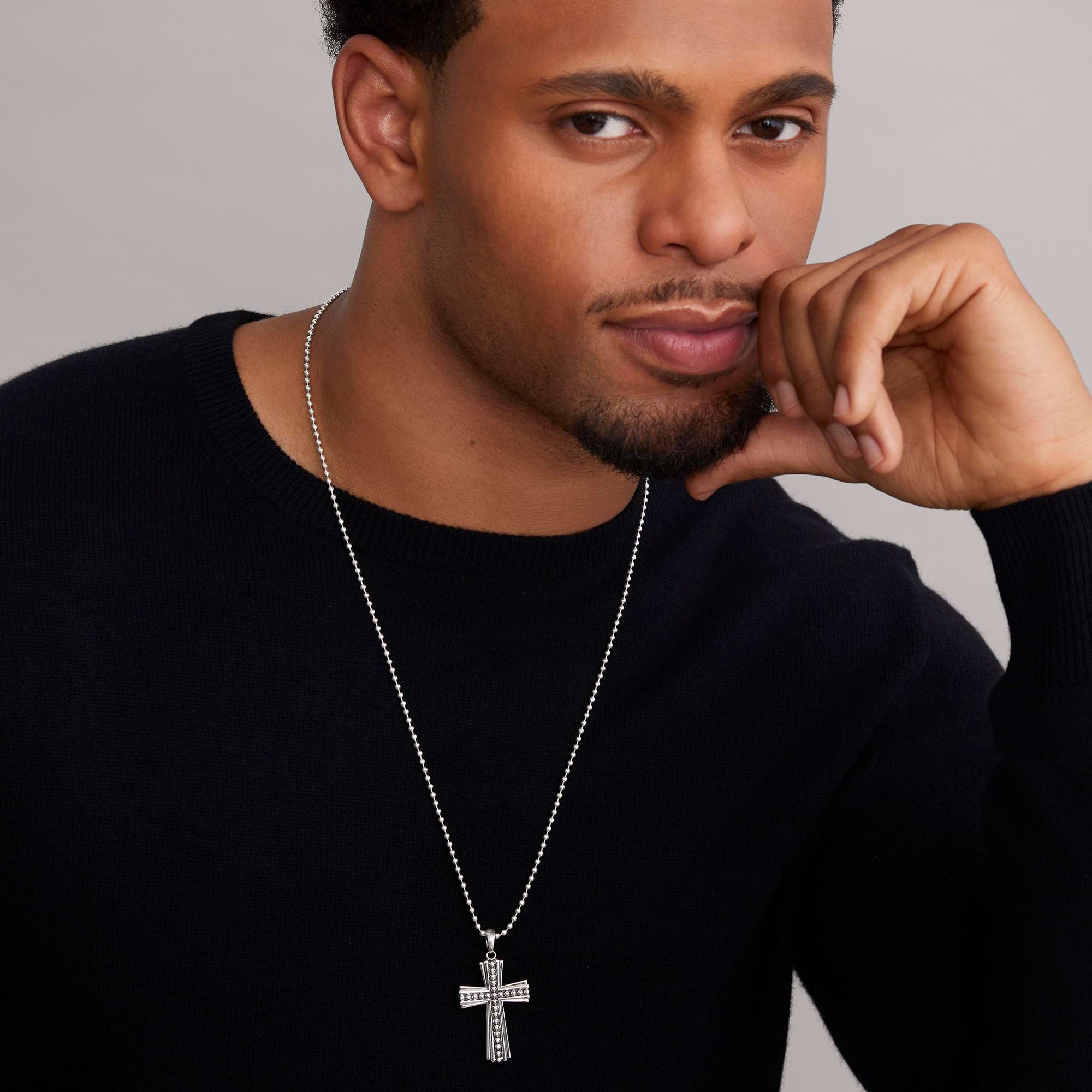 Signature Caviar beads accentuated by highly polished sterling silver form this cross amulet.