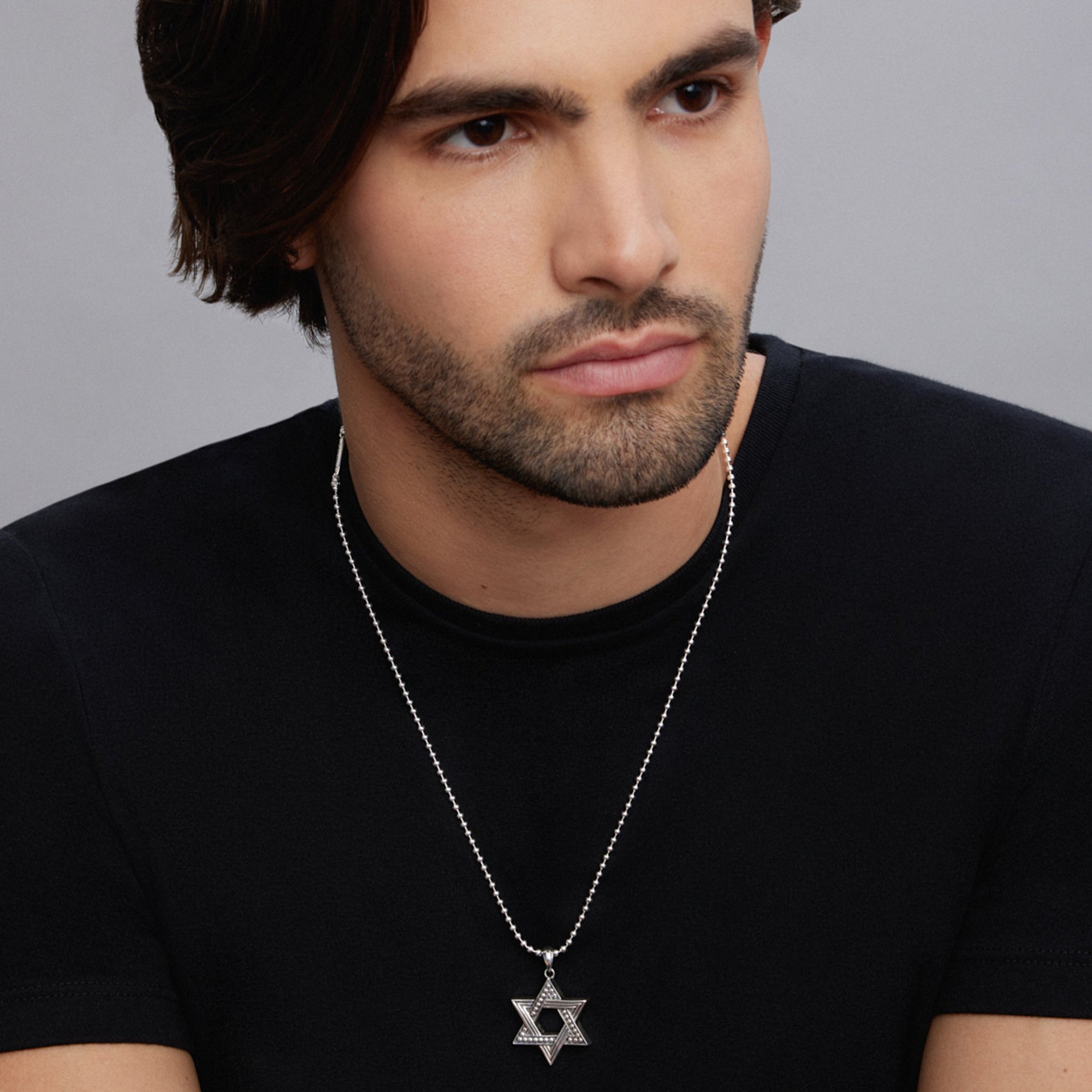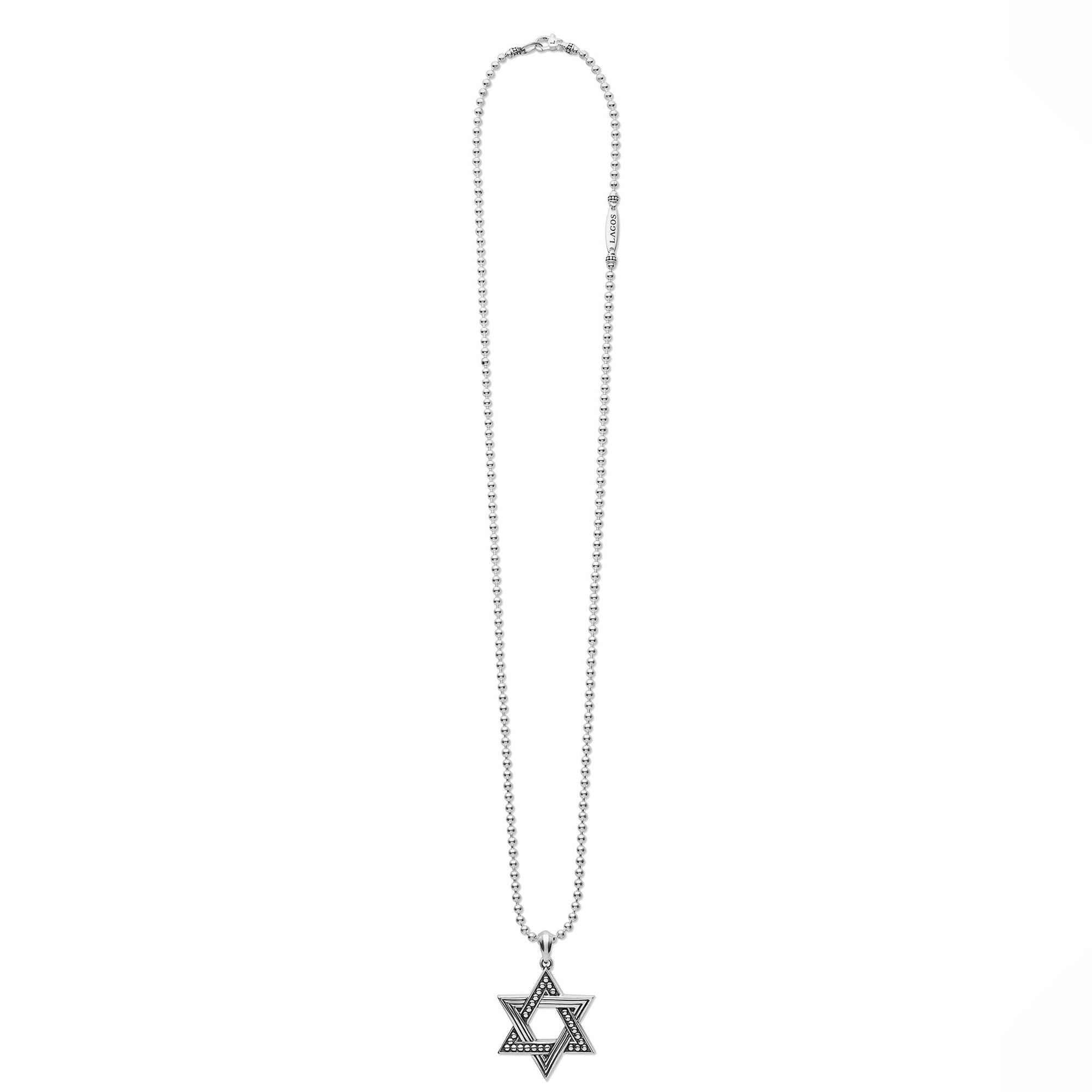 Sterling silver in a star motif forms this Star of David amulet. Finished on a sterling silver ball chain necklace.