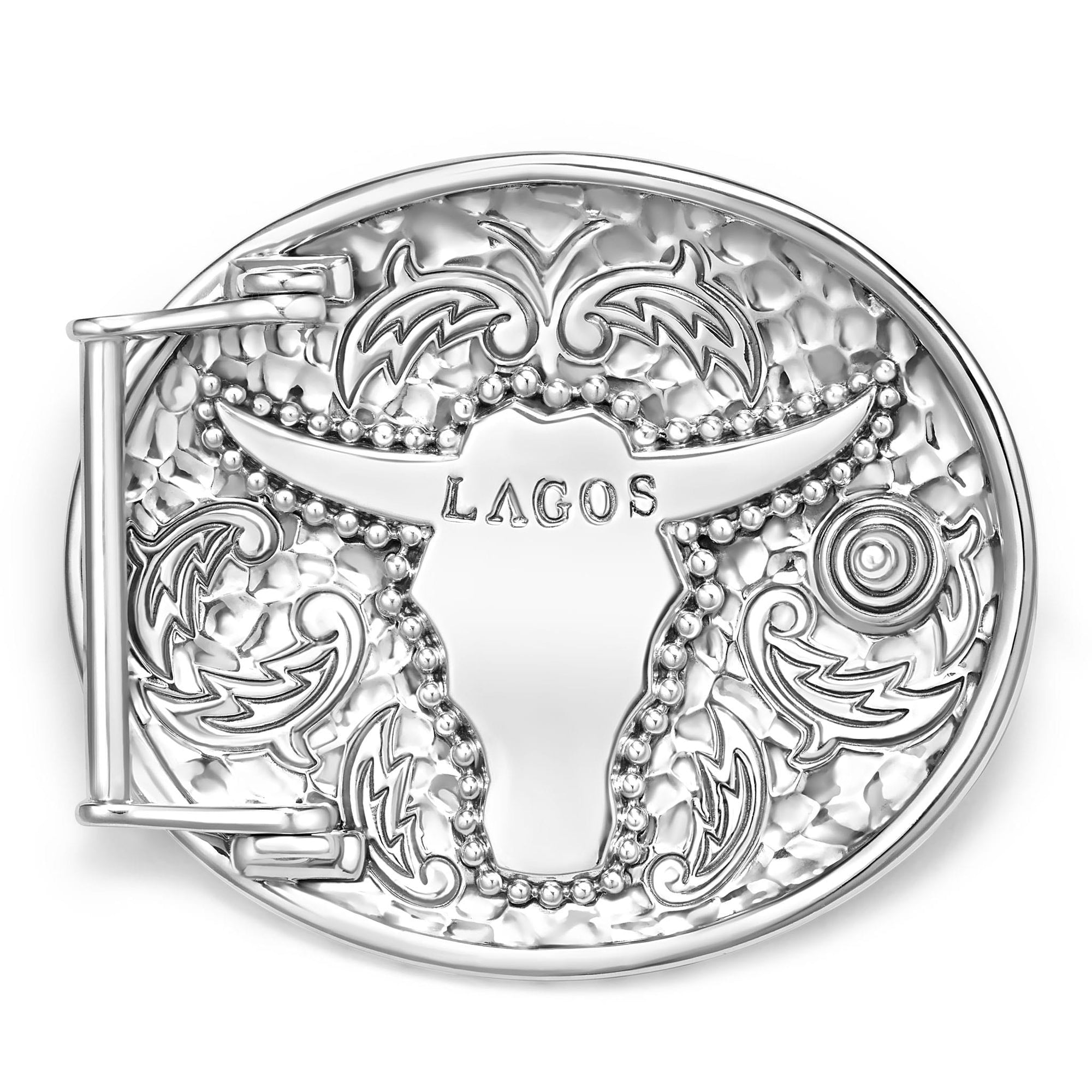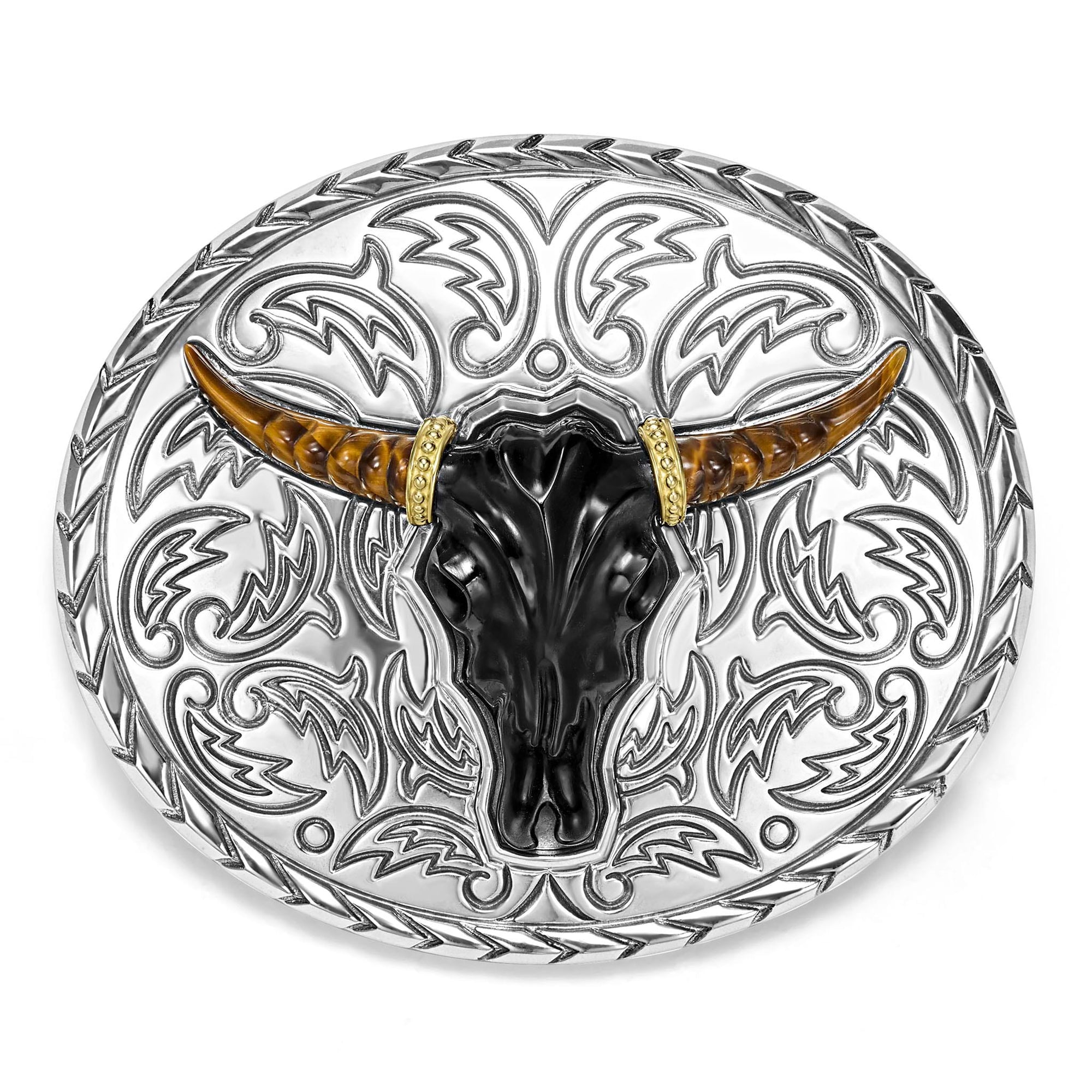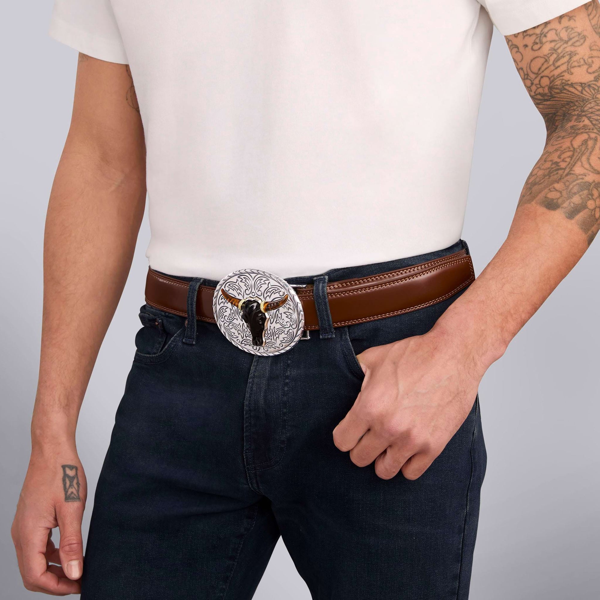 Intricately crafted black agate gemstone and 18K gold surrounded by sterling silver form this bull motif belt buckle.