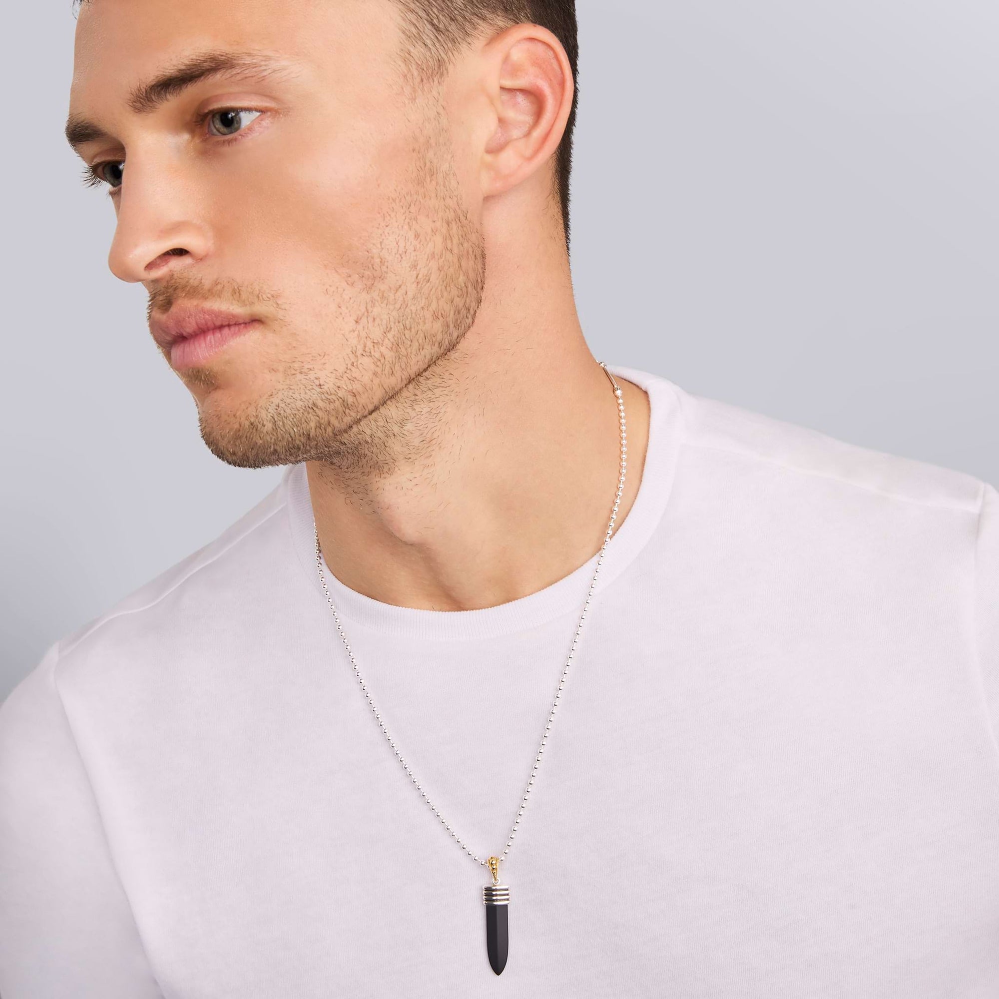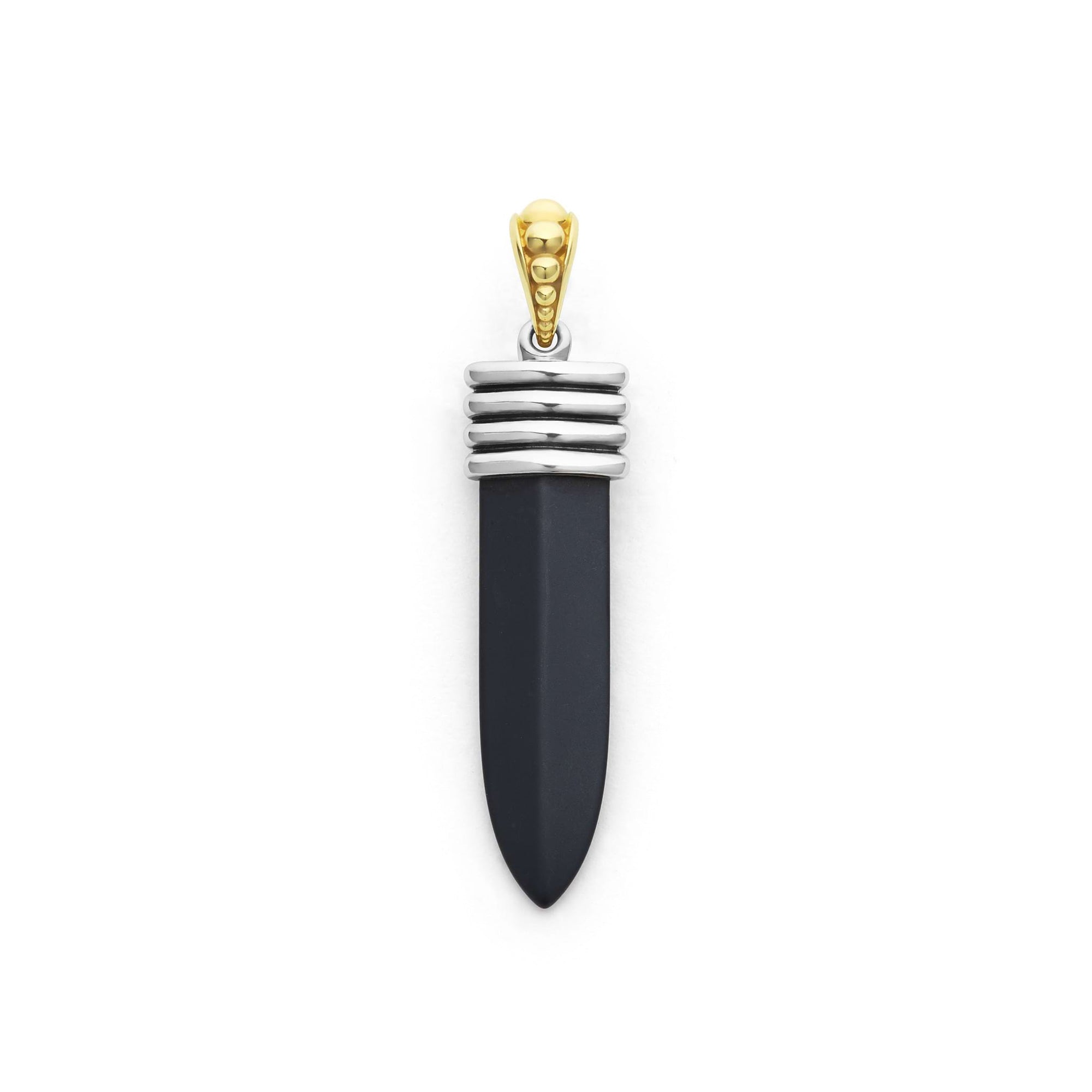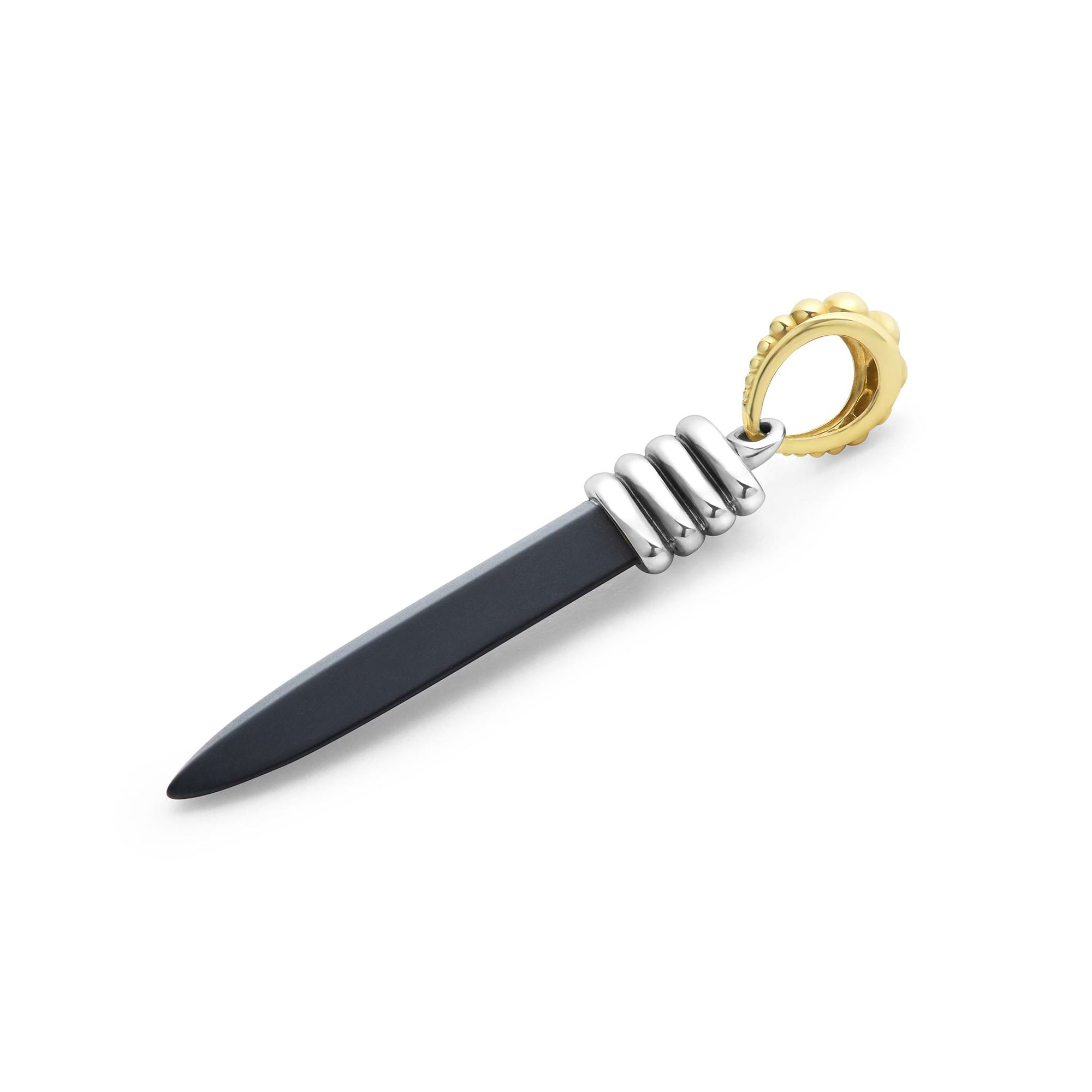 Matte black ceramic, sterling silver, and 18K gold form this blade motif amulet.