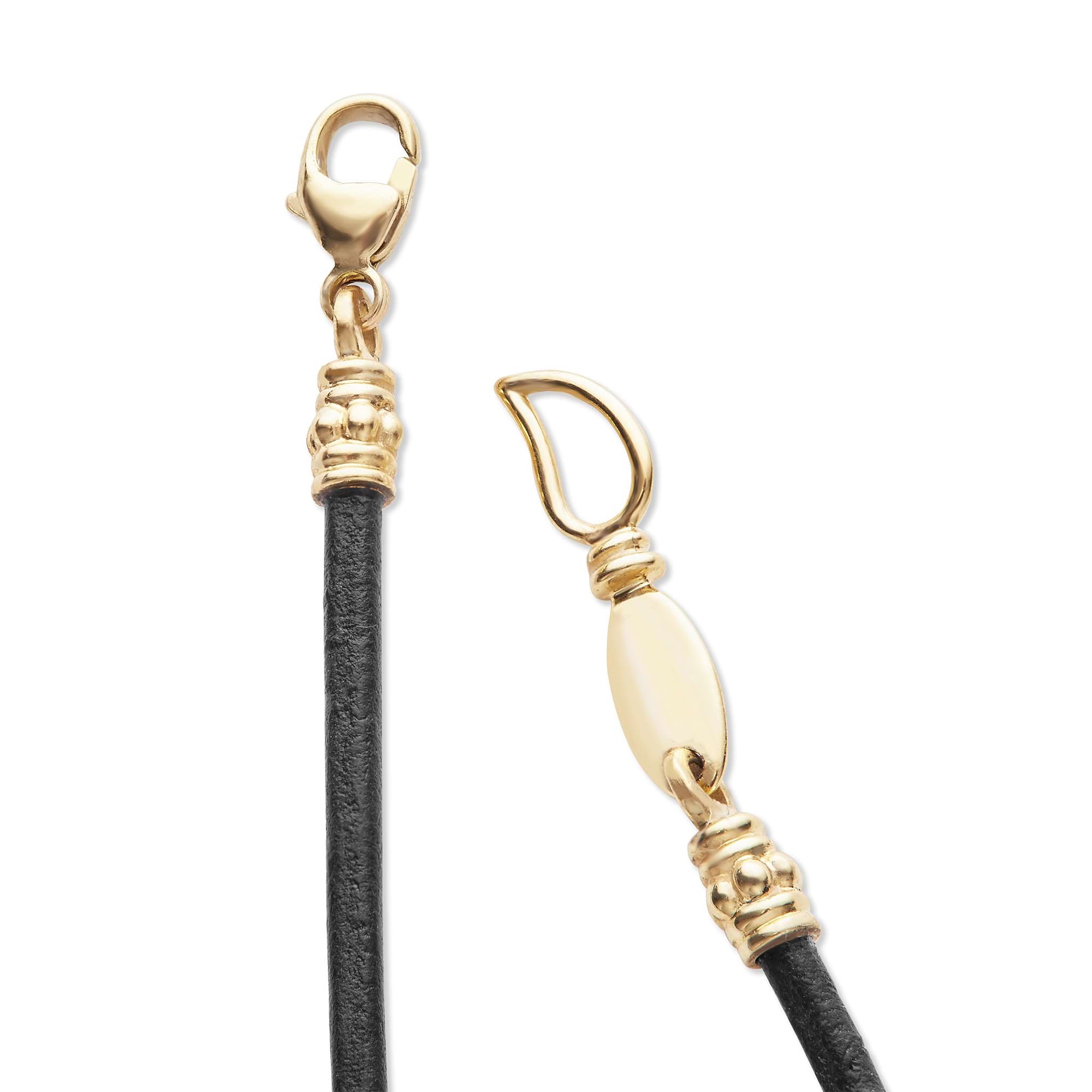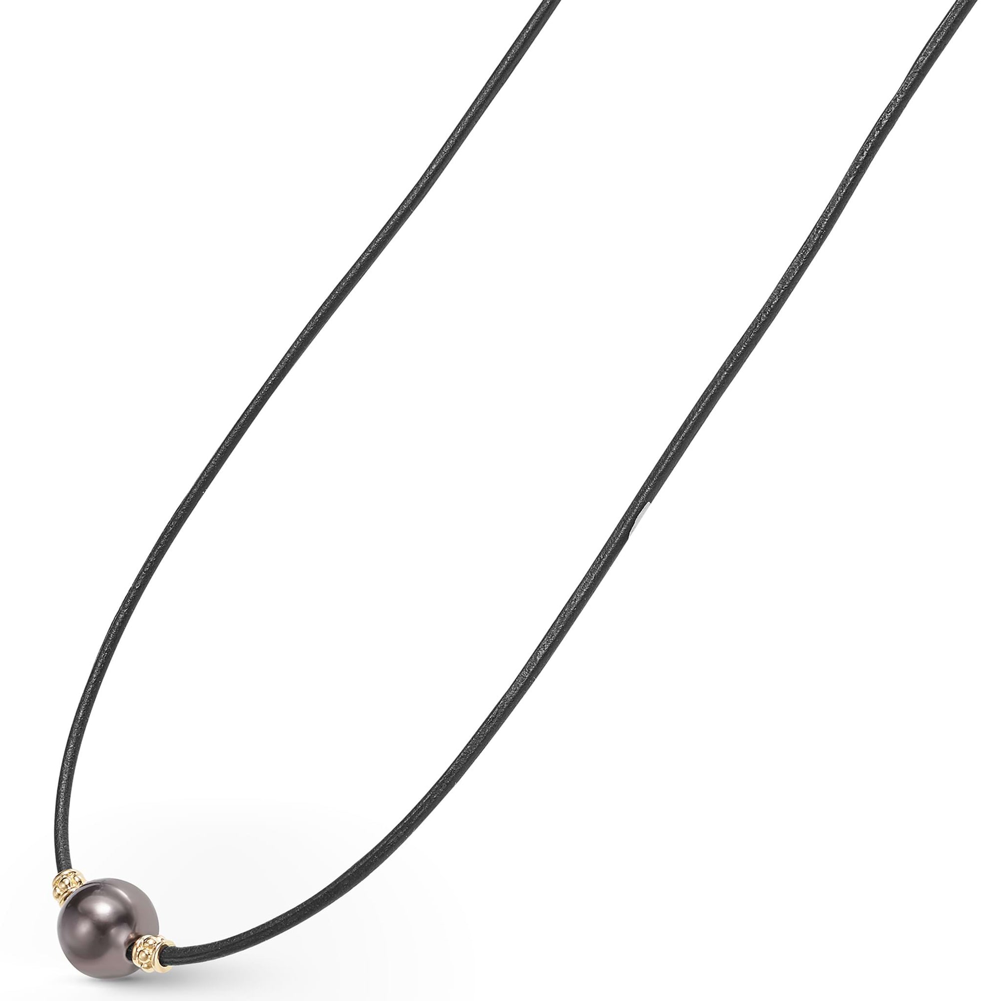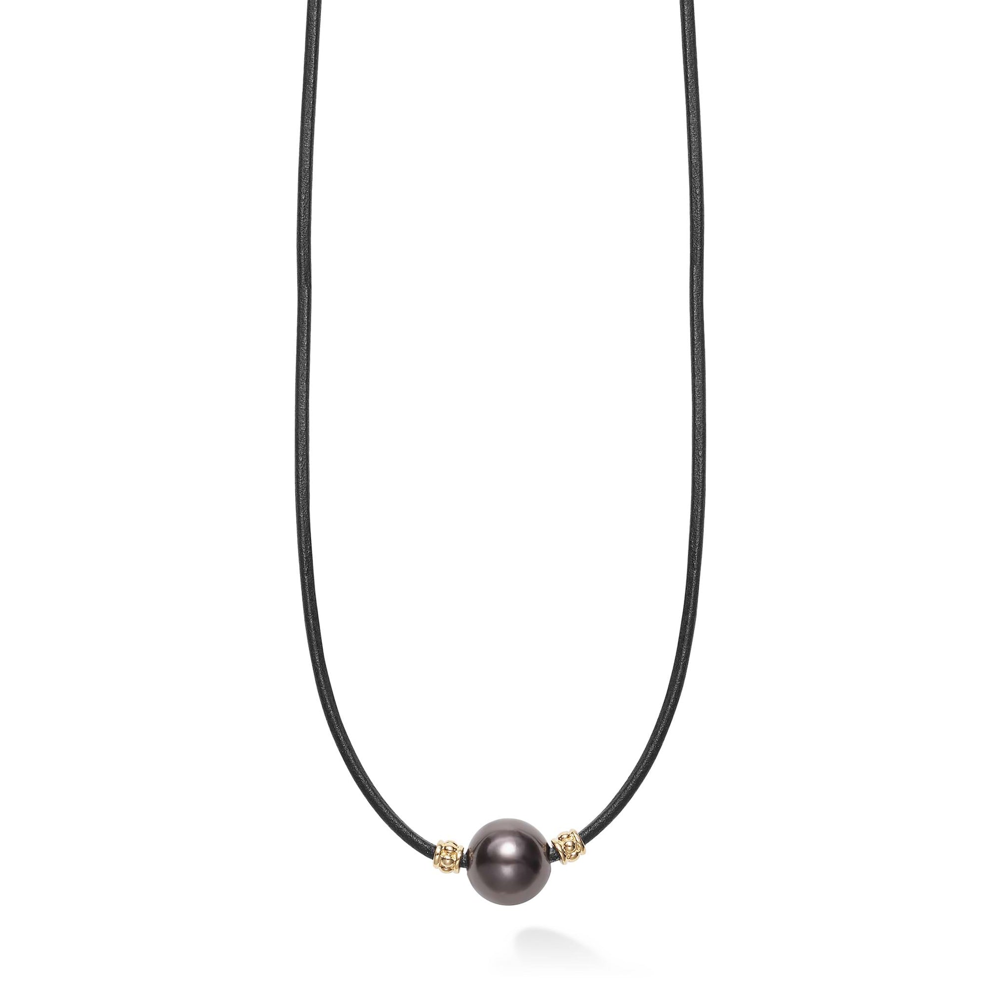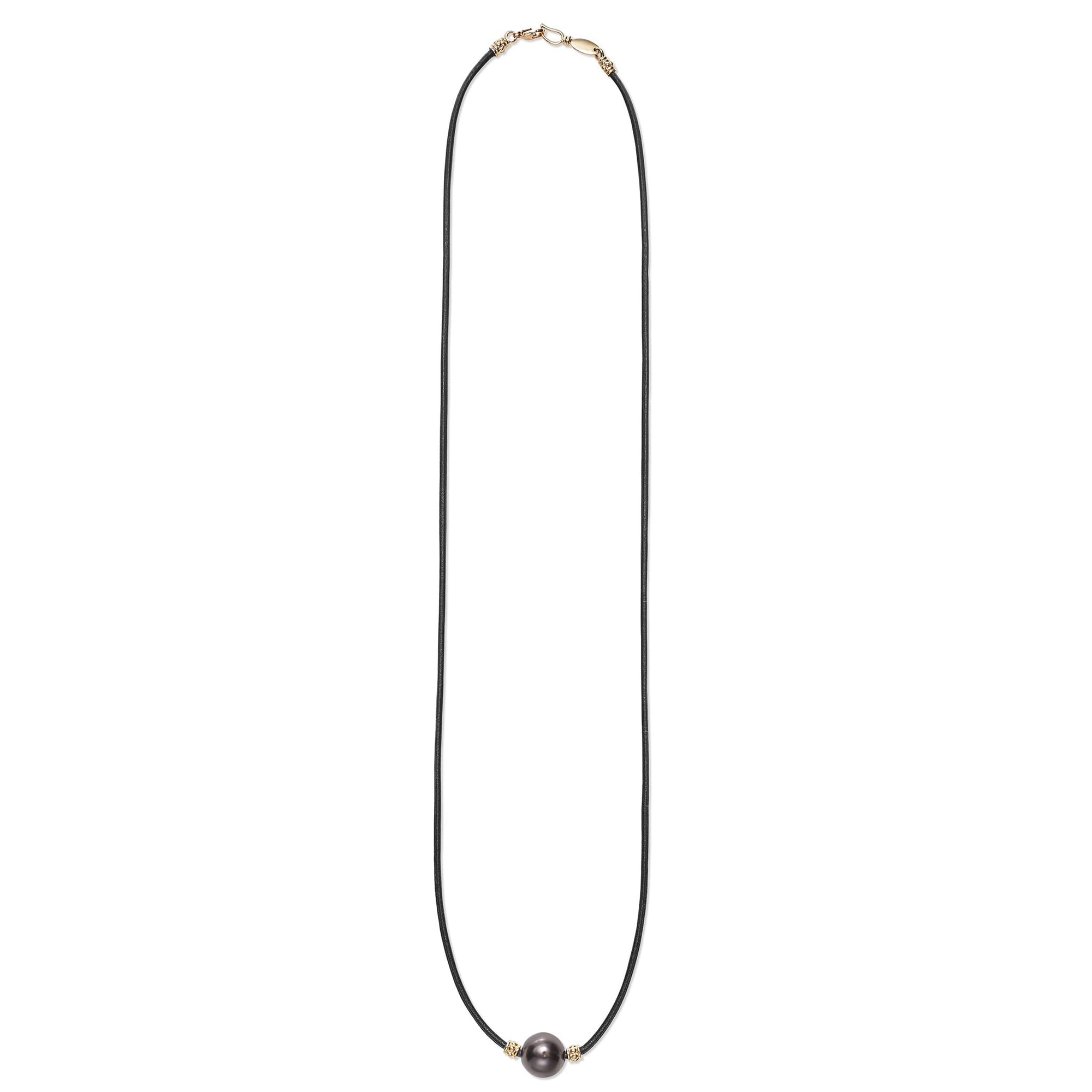A single tahitian black pearl station accented by 18K gold finished on a 20 inch cord necklace.