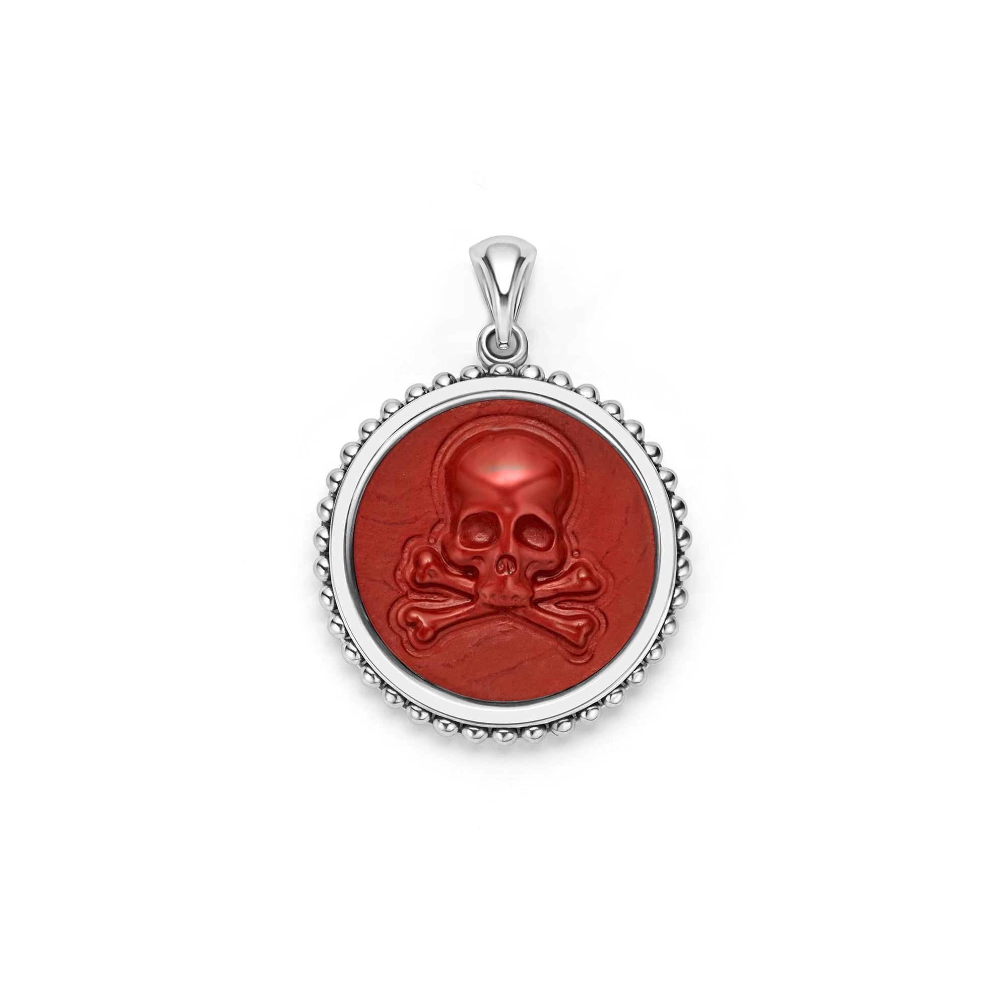 Red jasper gemstone surrounded by sterling silver Caviar beading form this crossbone emblem amulet.