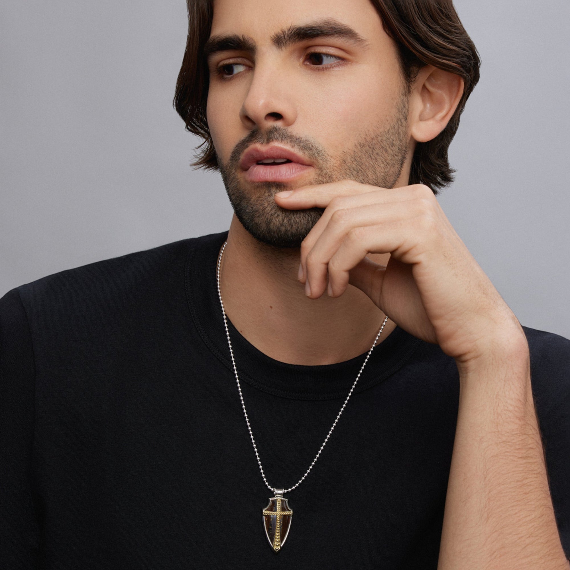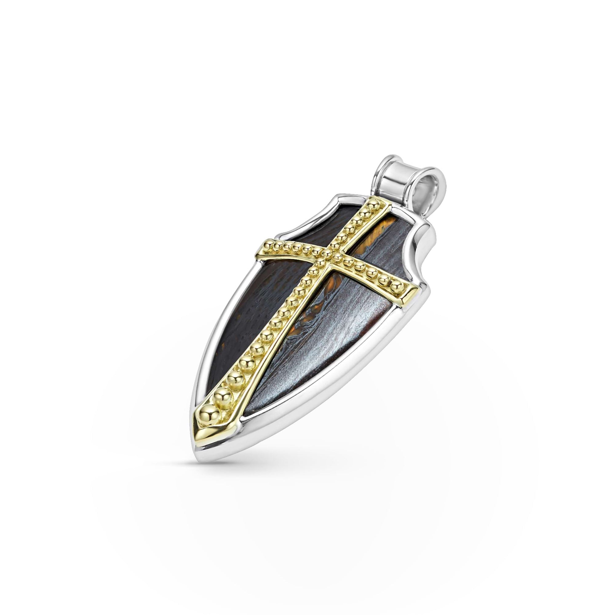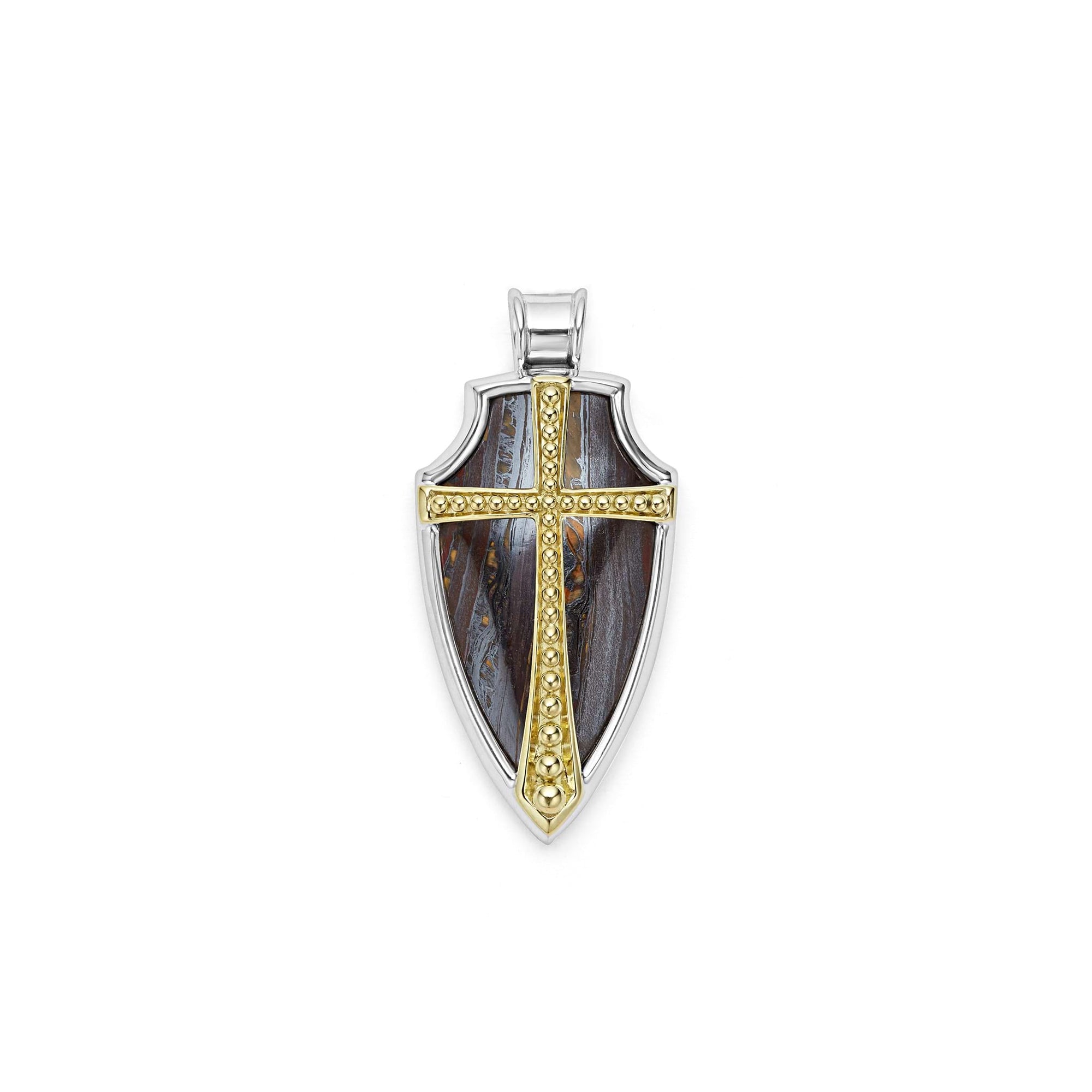 Tiger iron gemstone accented by sterling silver and 18K gold Caviar beading form this shield amulet.