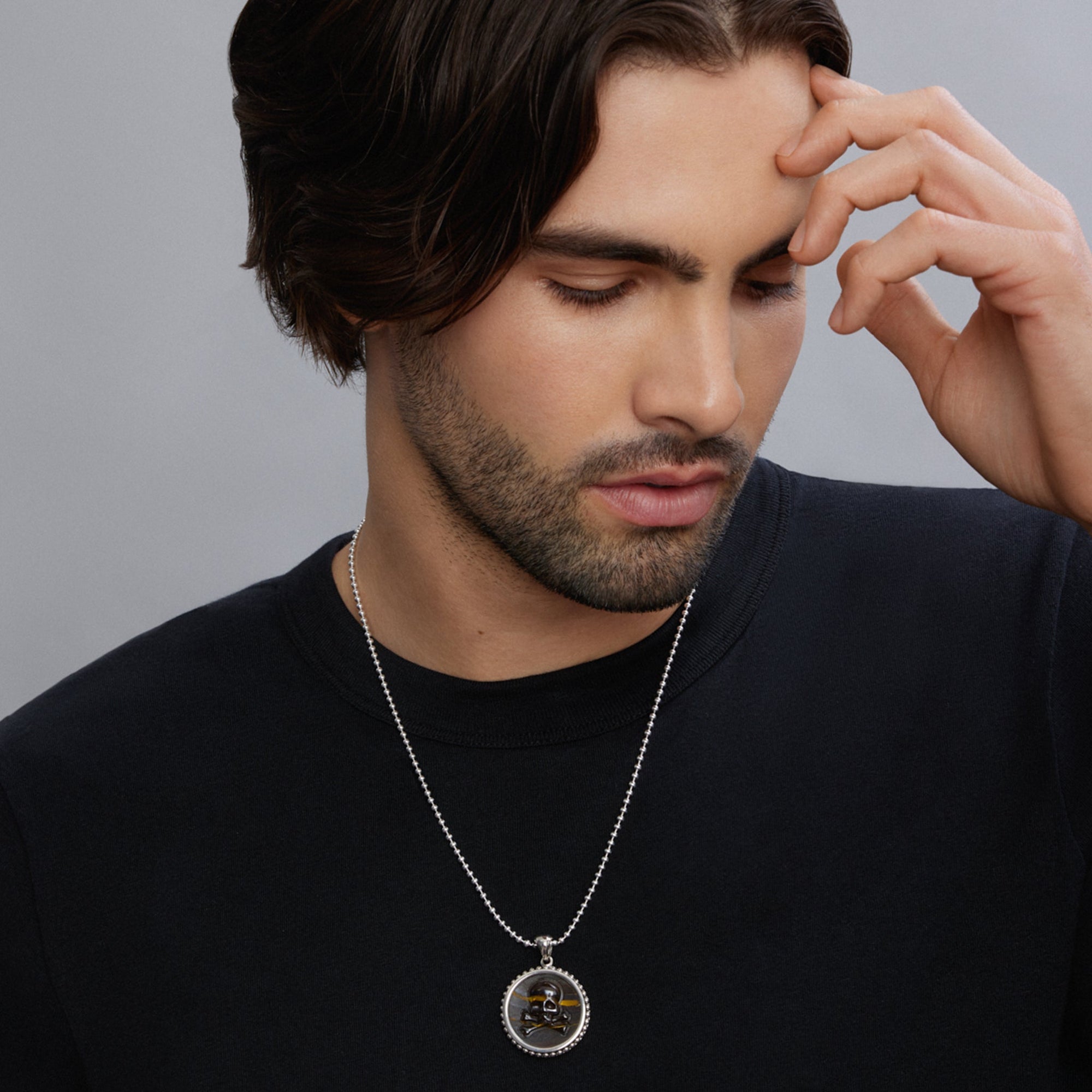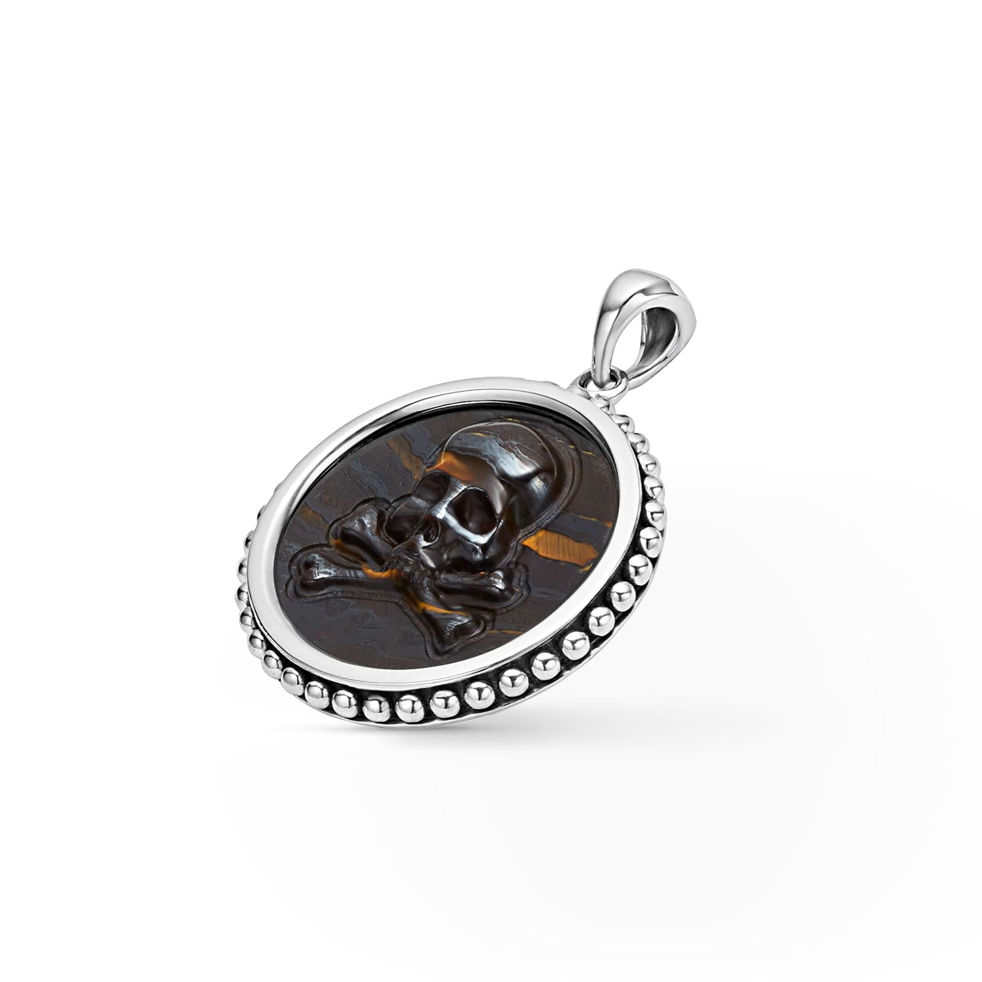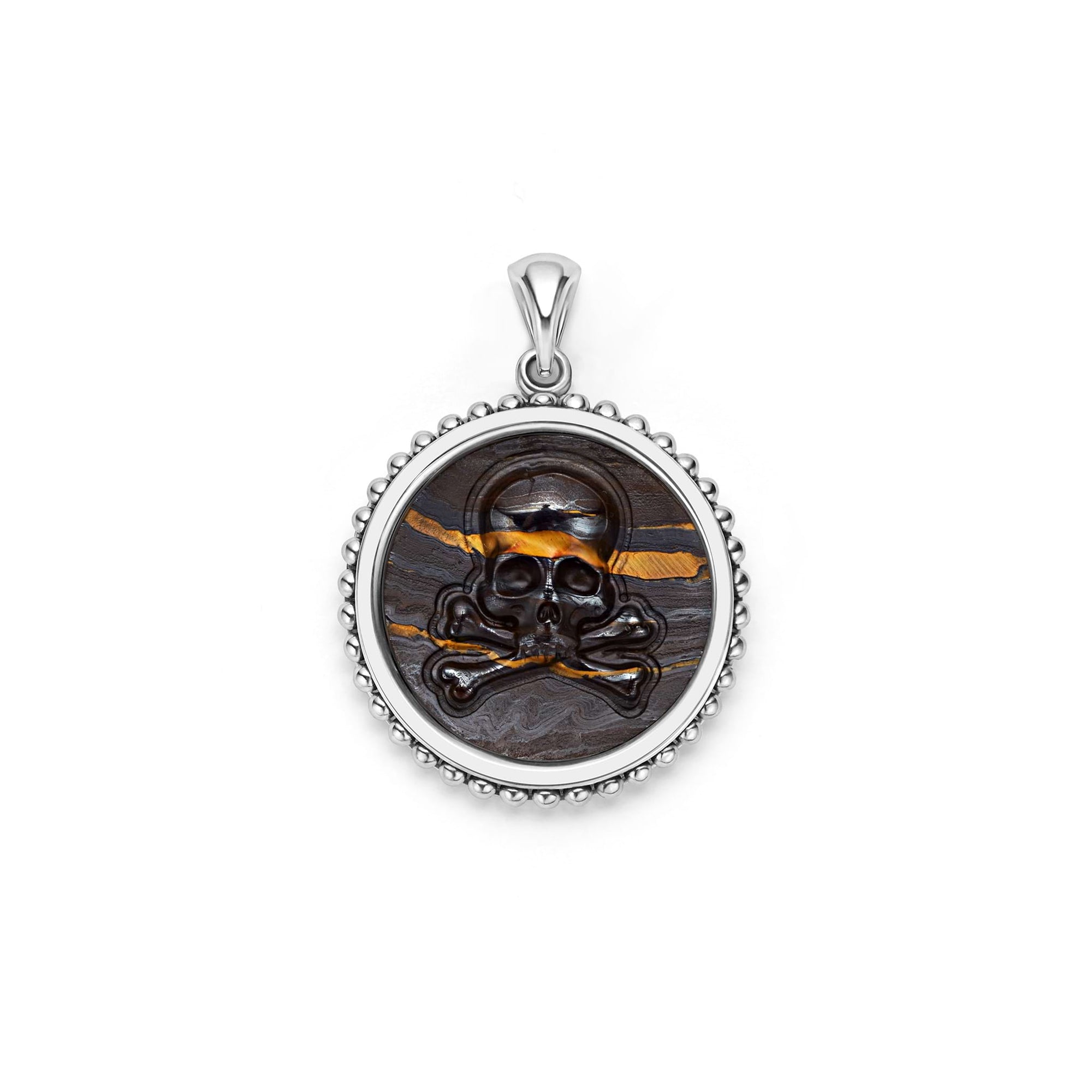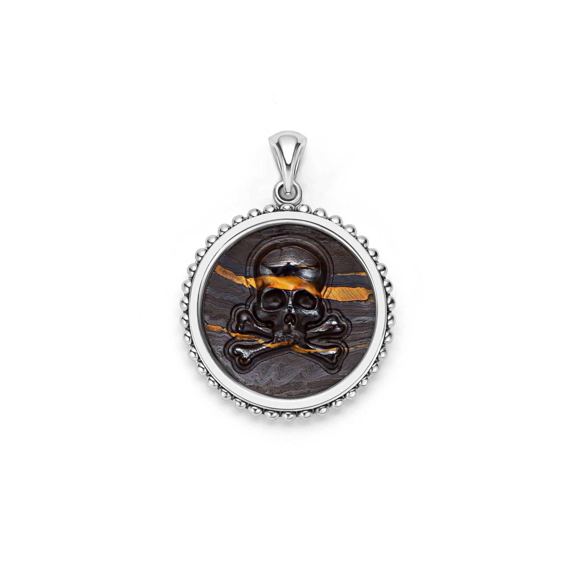 Tiger iron gemstone surrounded by sterling silver Caviar beading form this crossbone emblem amulet.