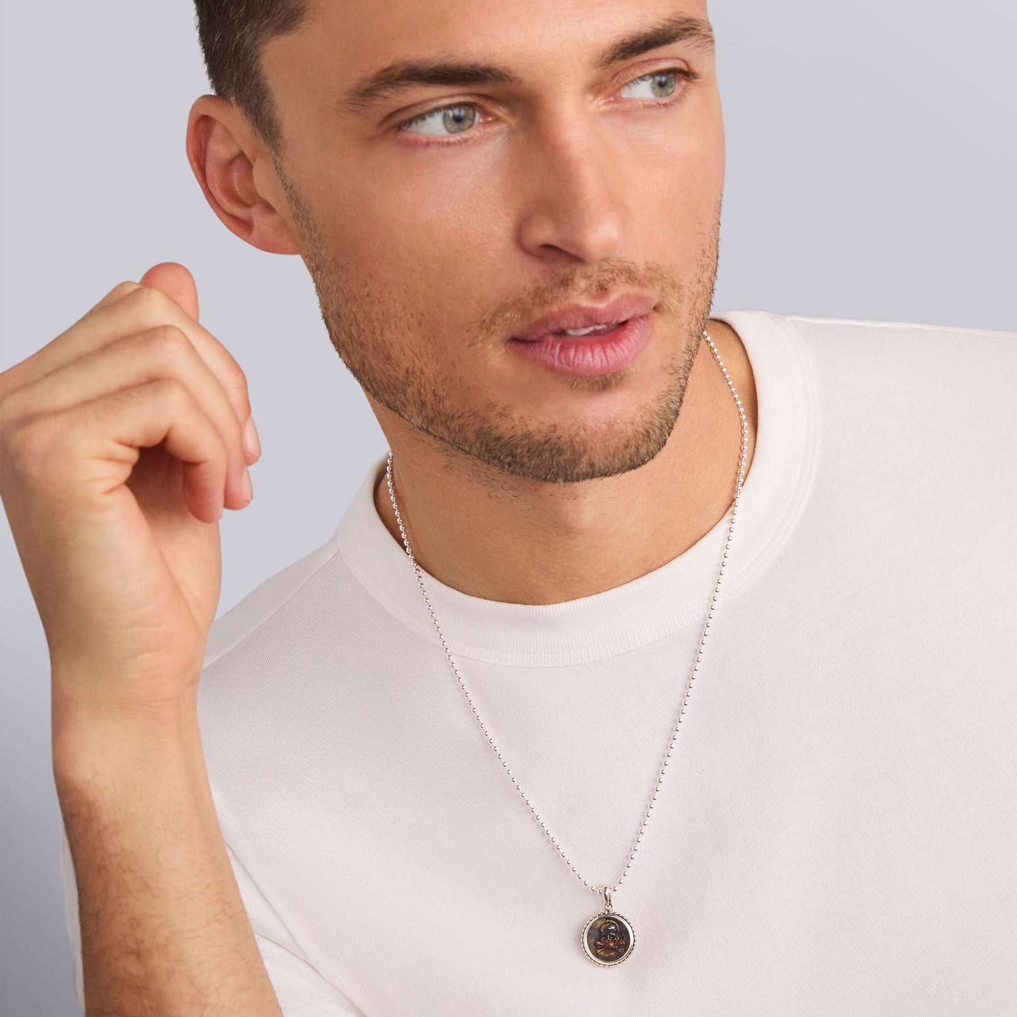 Tiger Iron gemstone surrounded by sterling silver Caviar beading form this crossbone emblem amulet.