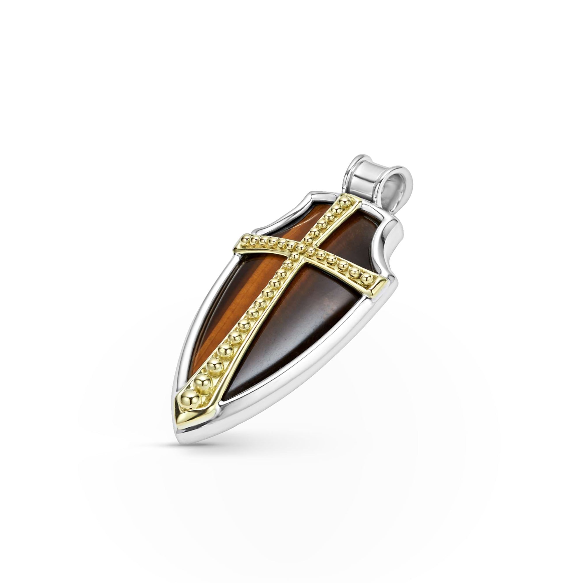 Tiger eye gemstone accented by sterling silver and 18K gold Caviar beading form this shield amulet.