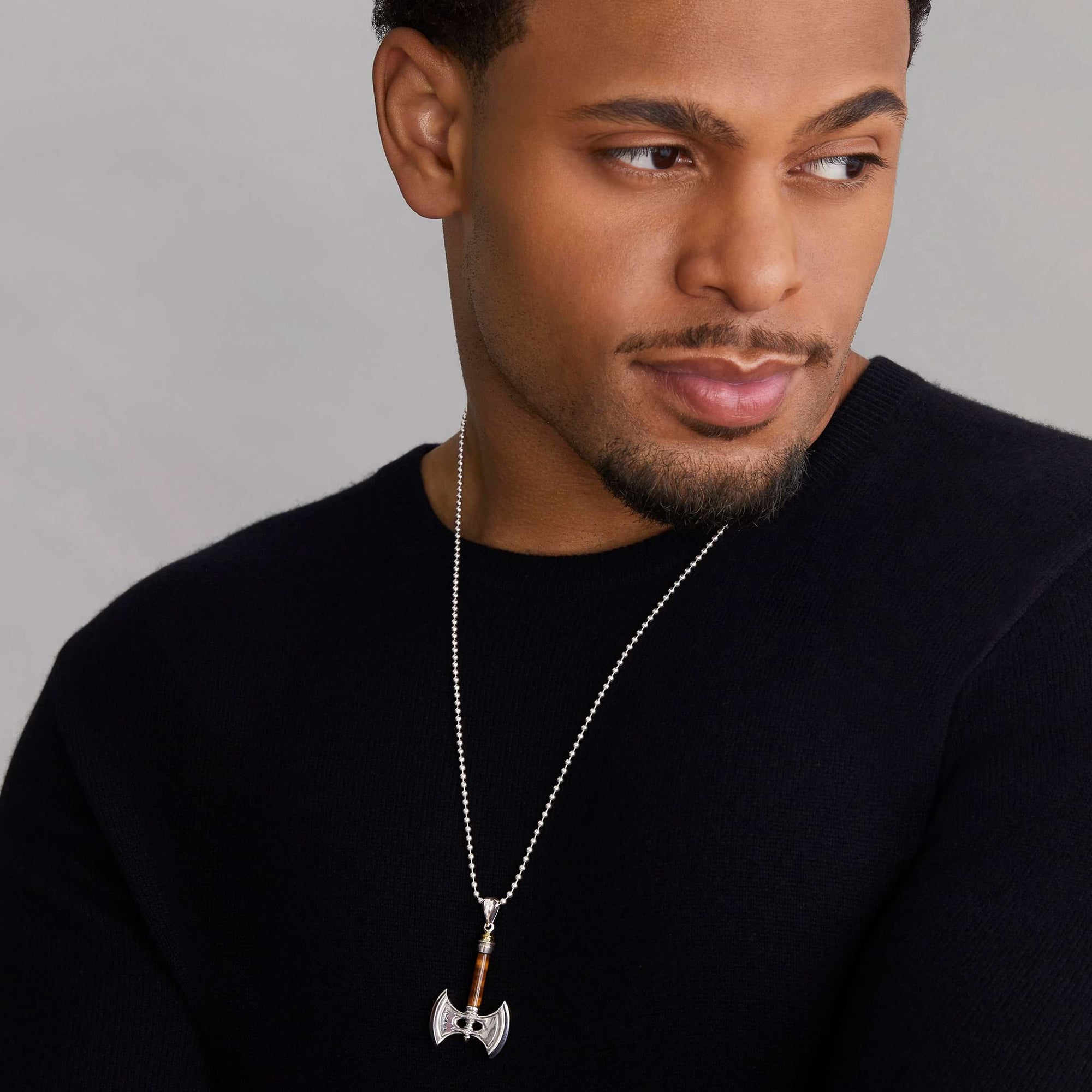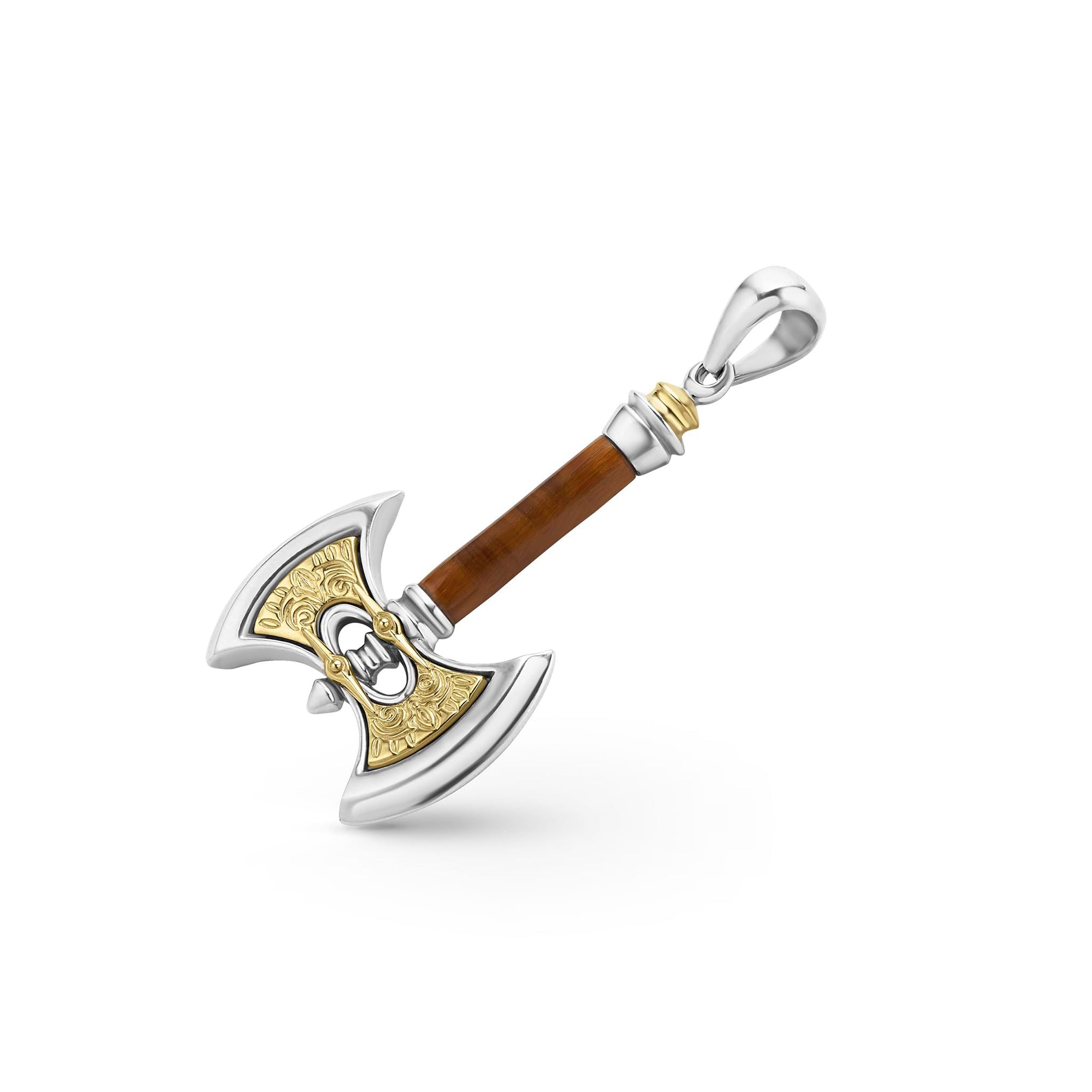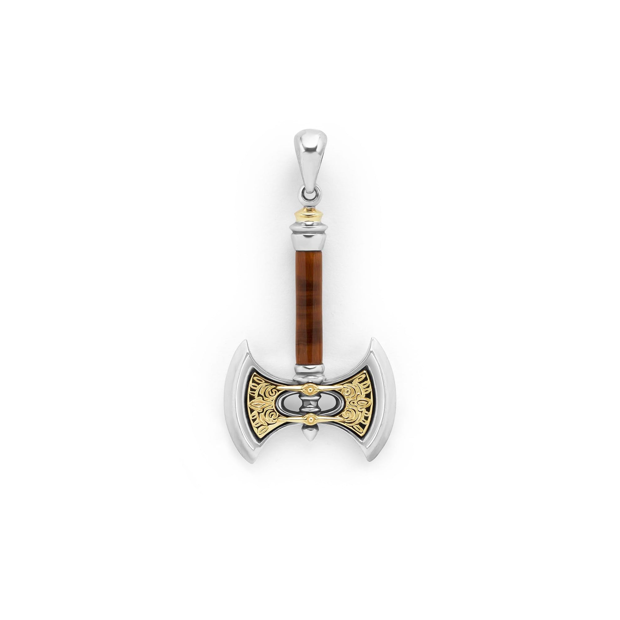 Tigereye gemstone, 18K gold, and sterling silver form this axe amulet.