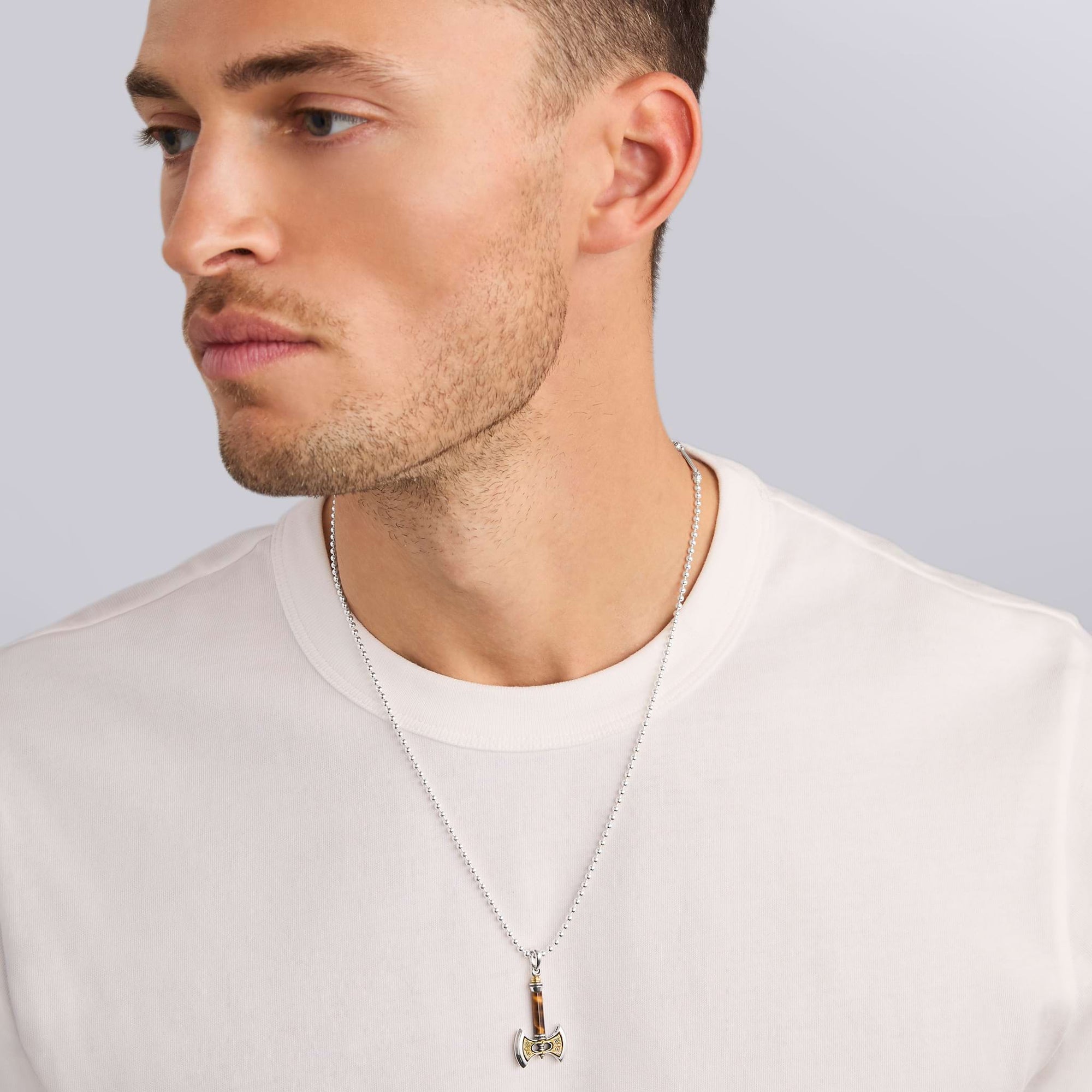Tigereye gemstone, 18K gold, and sterling silver form this axe amulet.