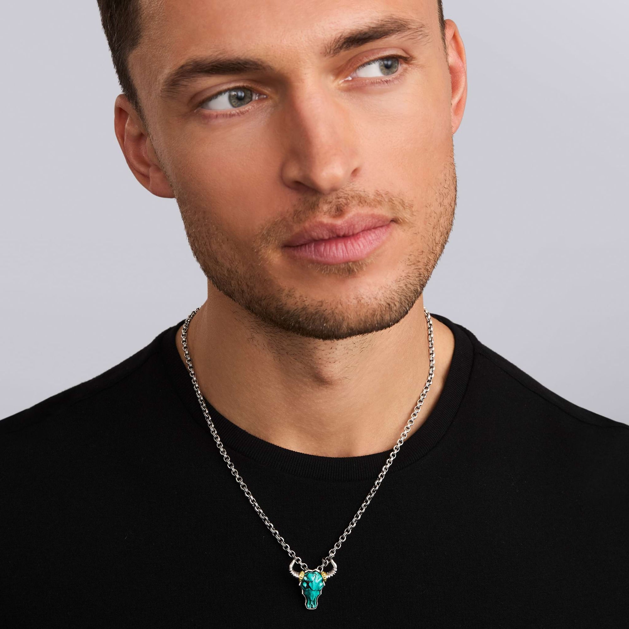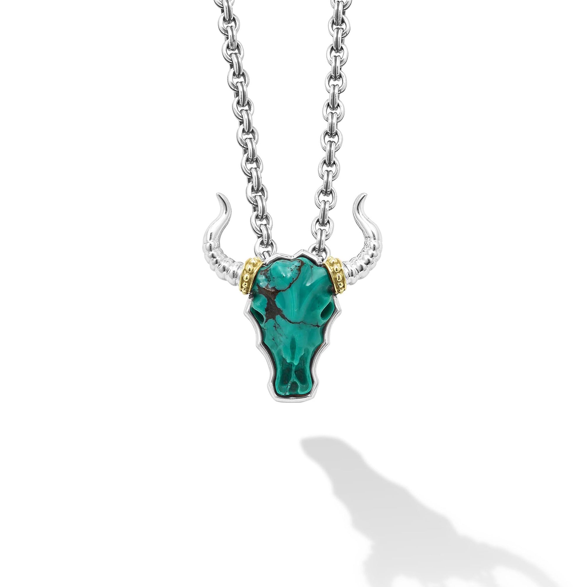 Intricately crafted turquoise gemstone and 18K gold bull motif pendant surrounded by sterling silver.