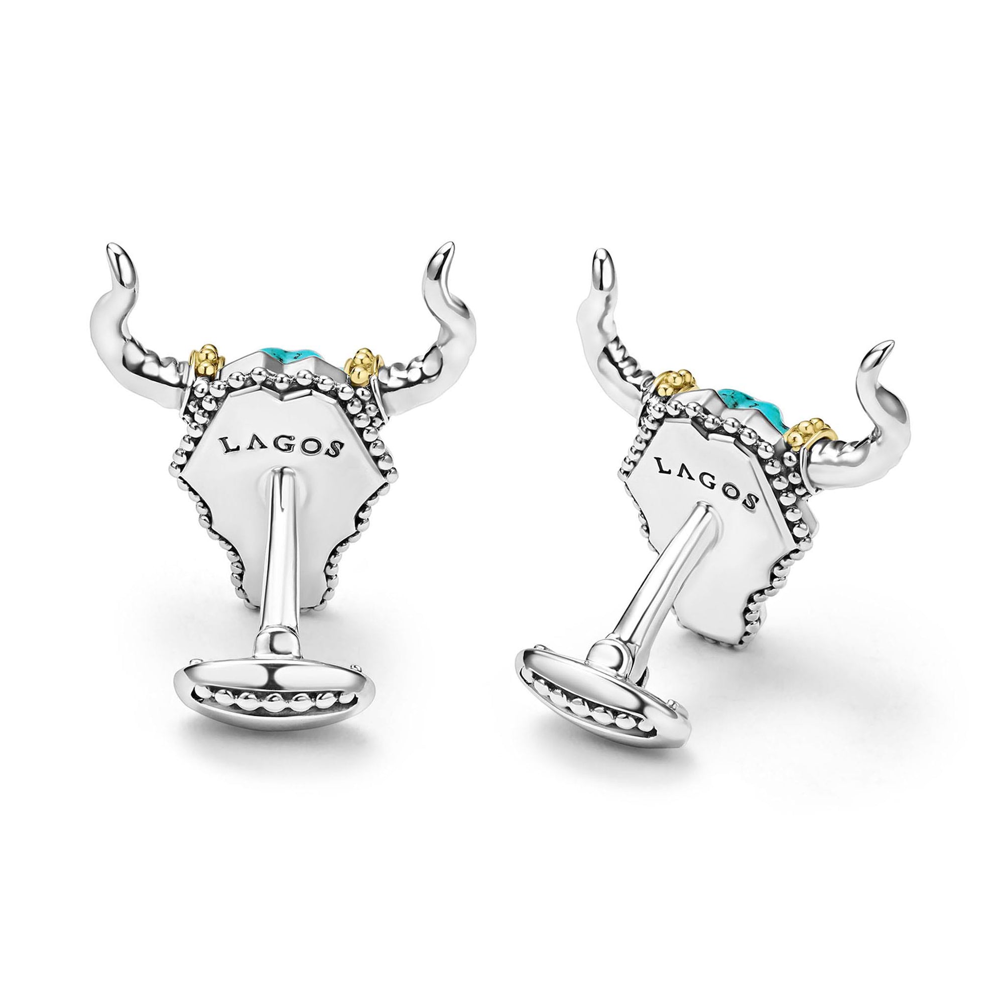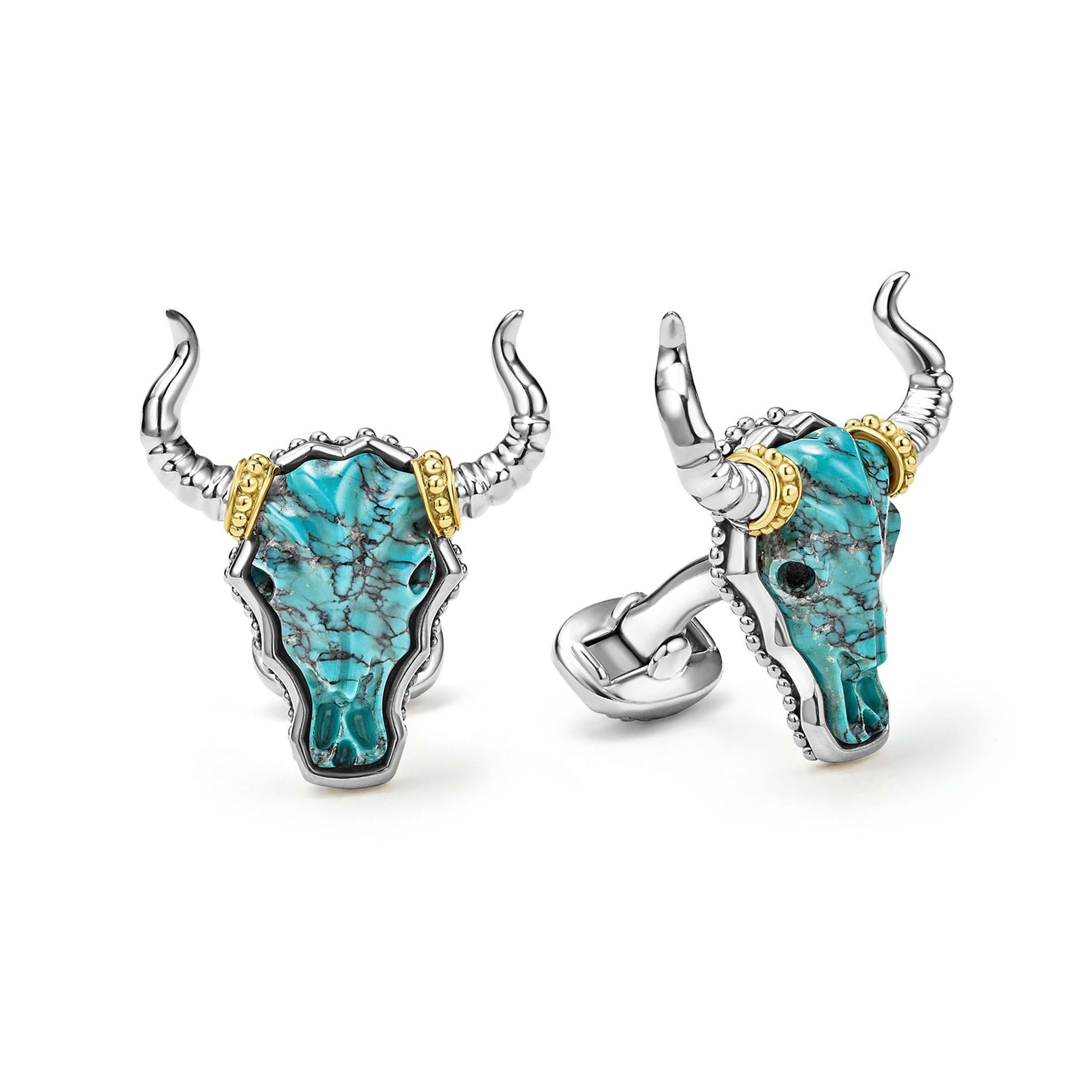Turquoise gemstone accented by sterling silver and 18K gold Caviar beading forms these bull motif cuff links.