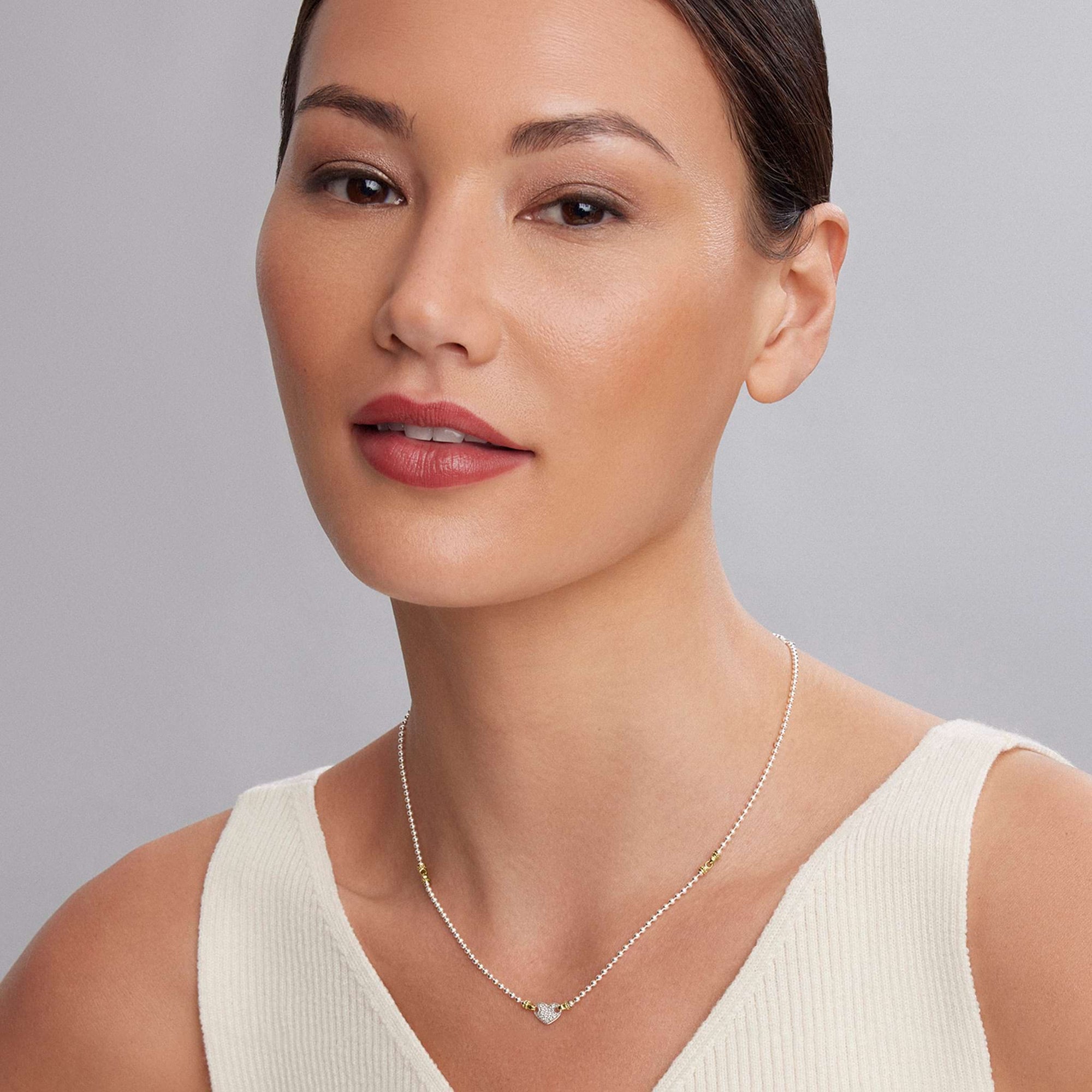 Diamonds and sterling silver form this heart pendant with 18K gold beading on an adjustable ball chain necklace. LAGOS diamonds are the highest quality natural stones.