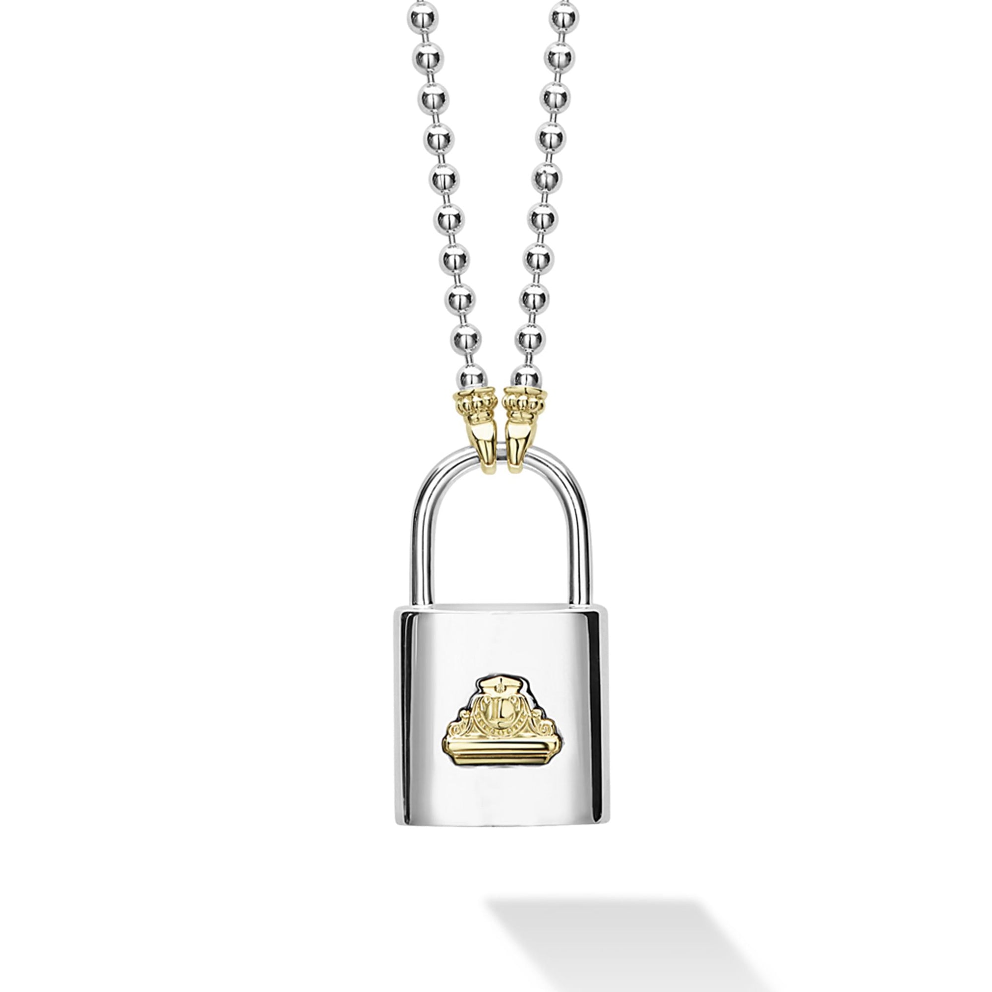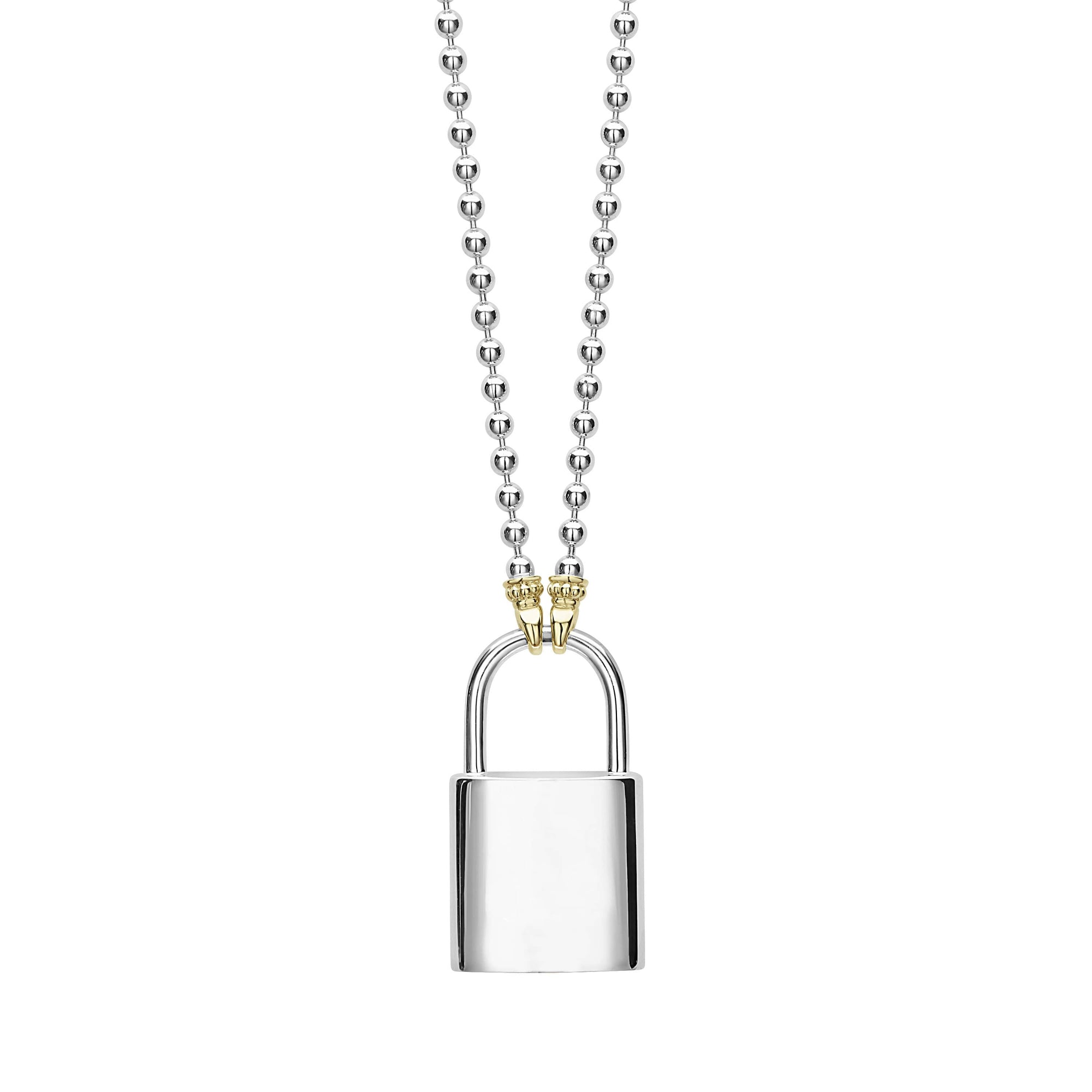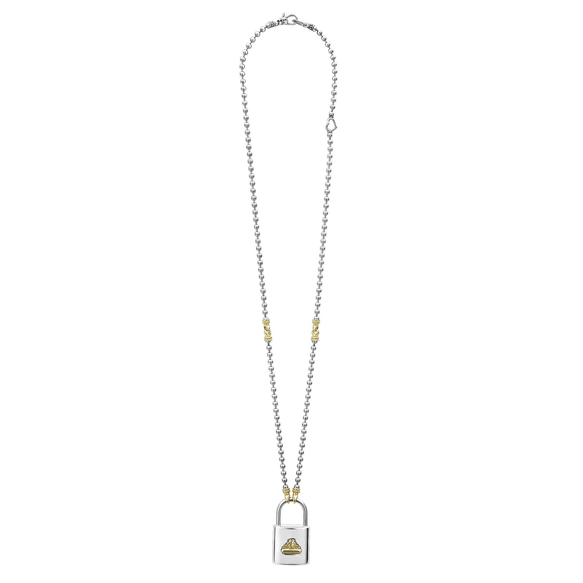 Our signature sterling silver lock with an 18k gold LAGOS crest finished on a sterling silver Caviar beaded chain necklace.
