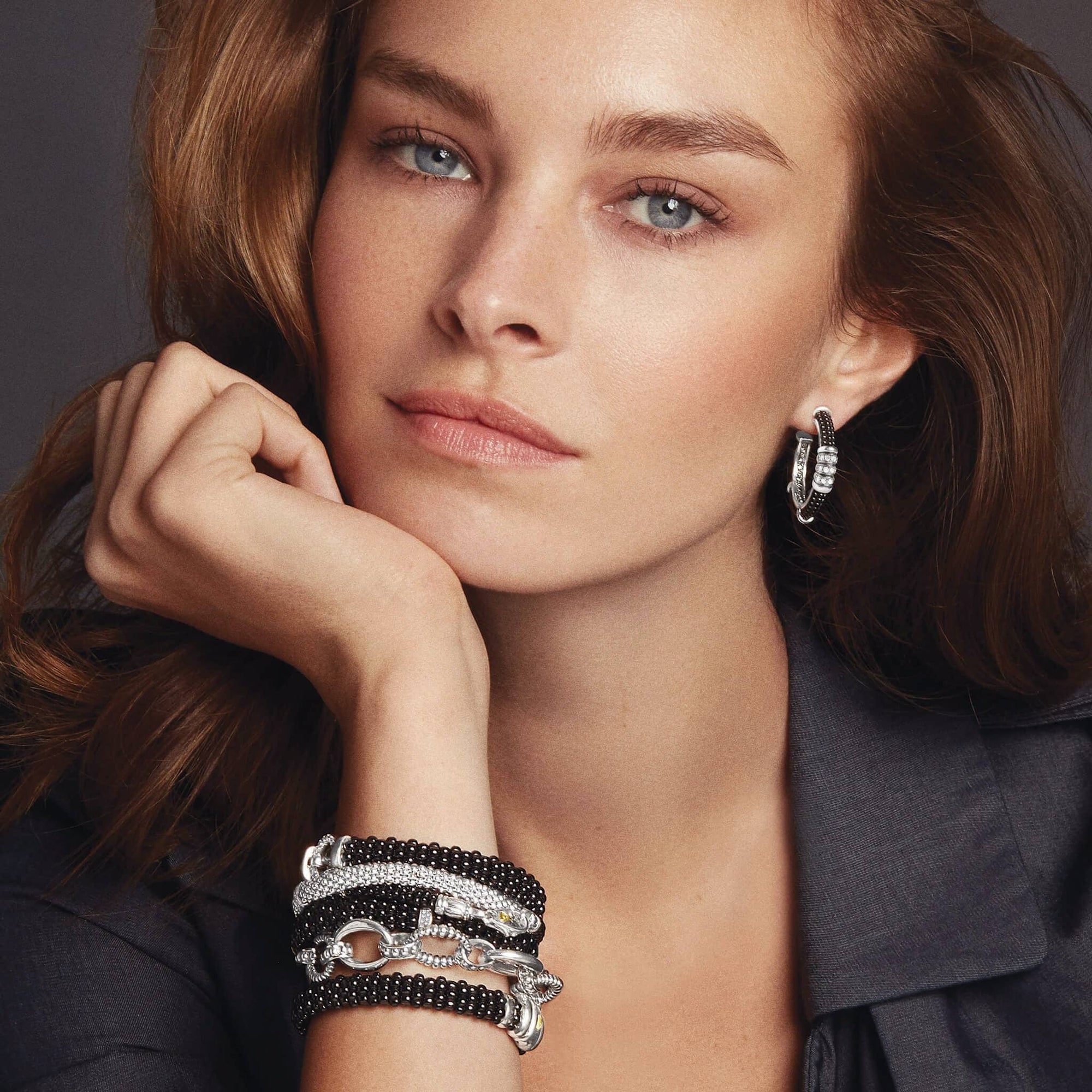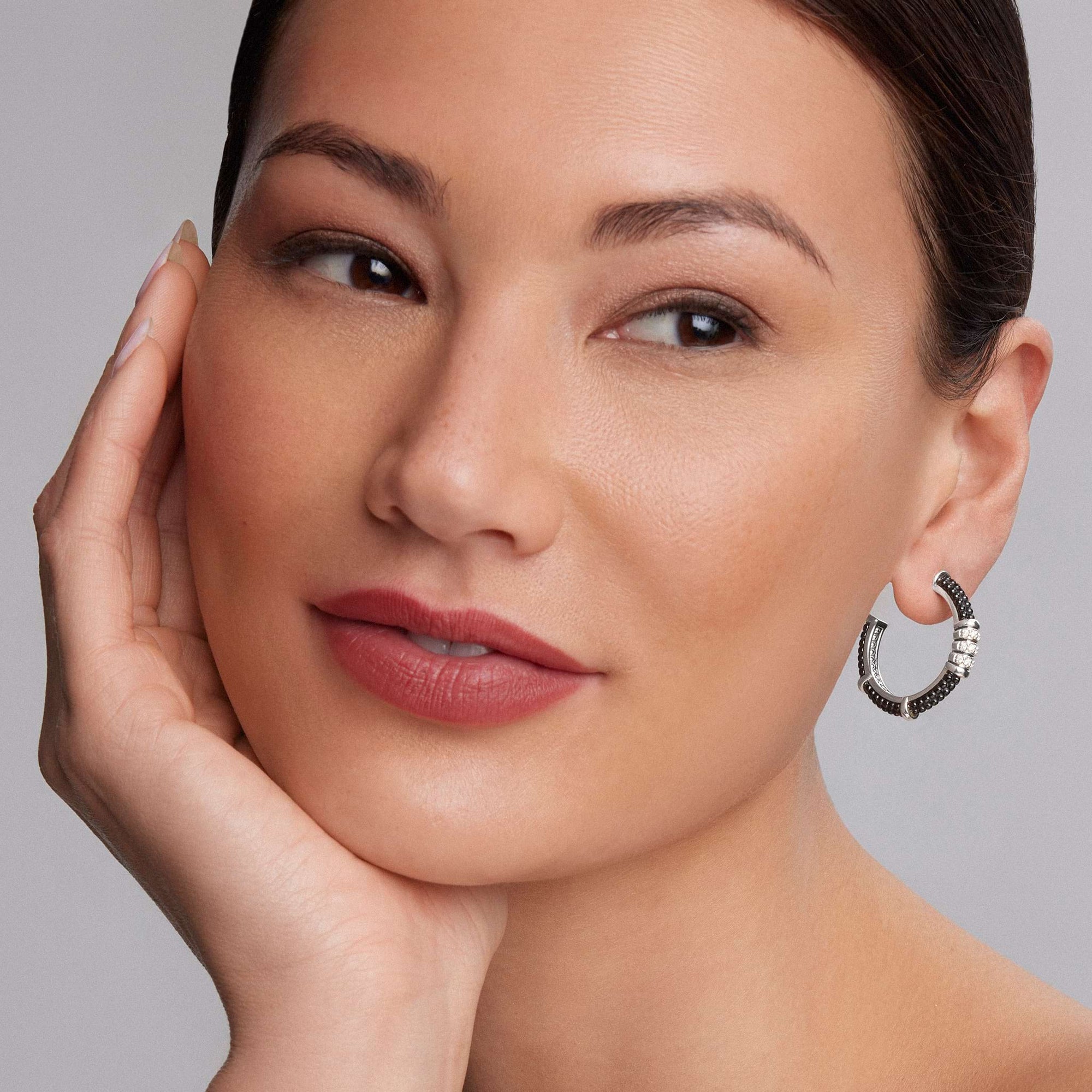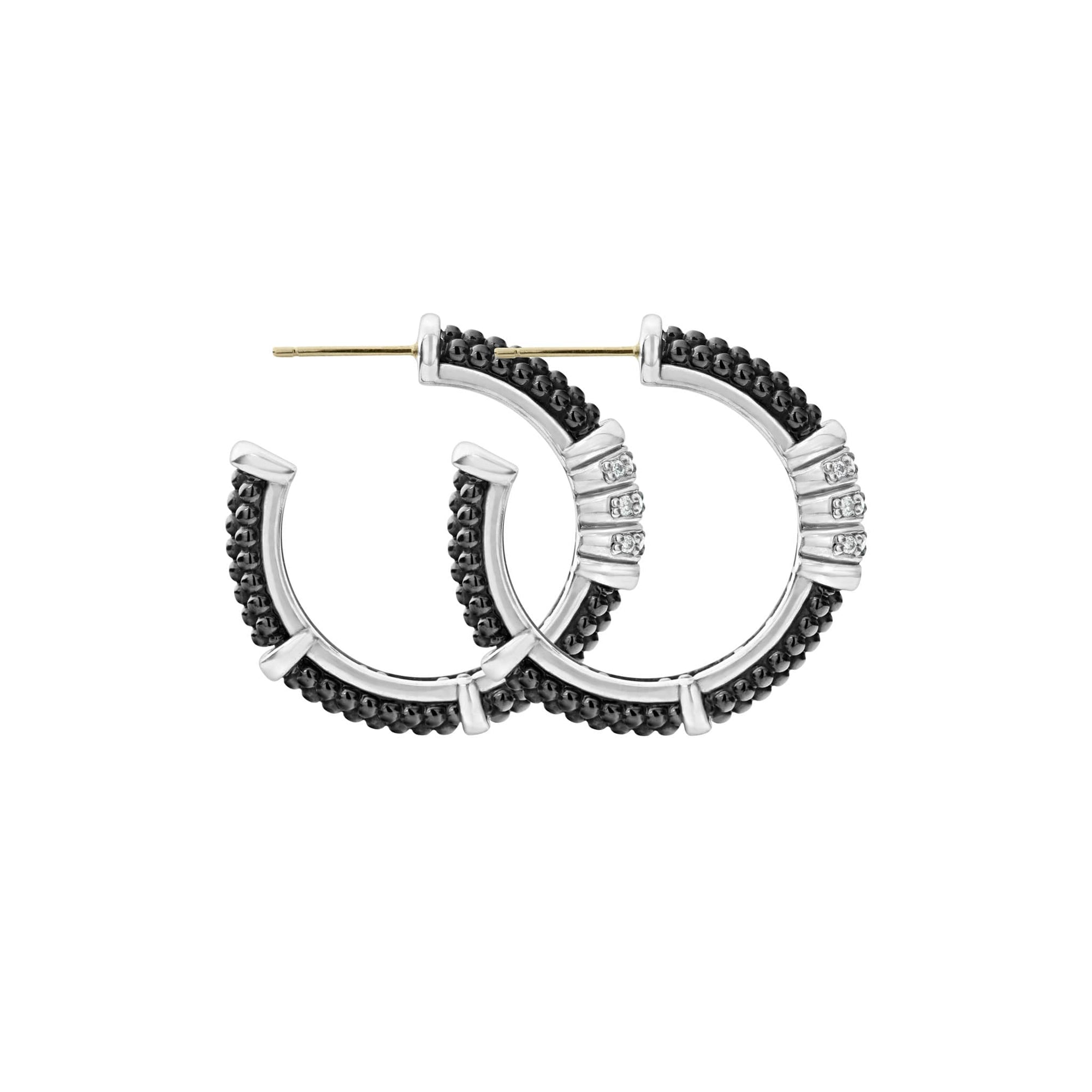 Diamonds, black ceramic beading, and sterling silver form these hoop earrings. LAGOS diamonds are the highest quality natural stones.