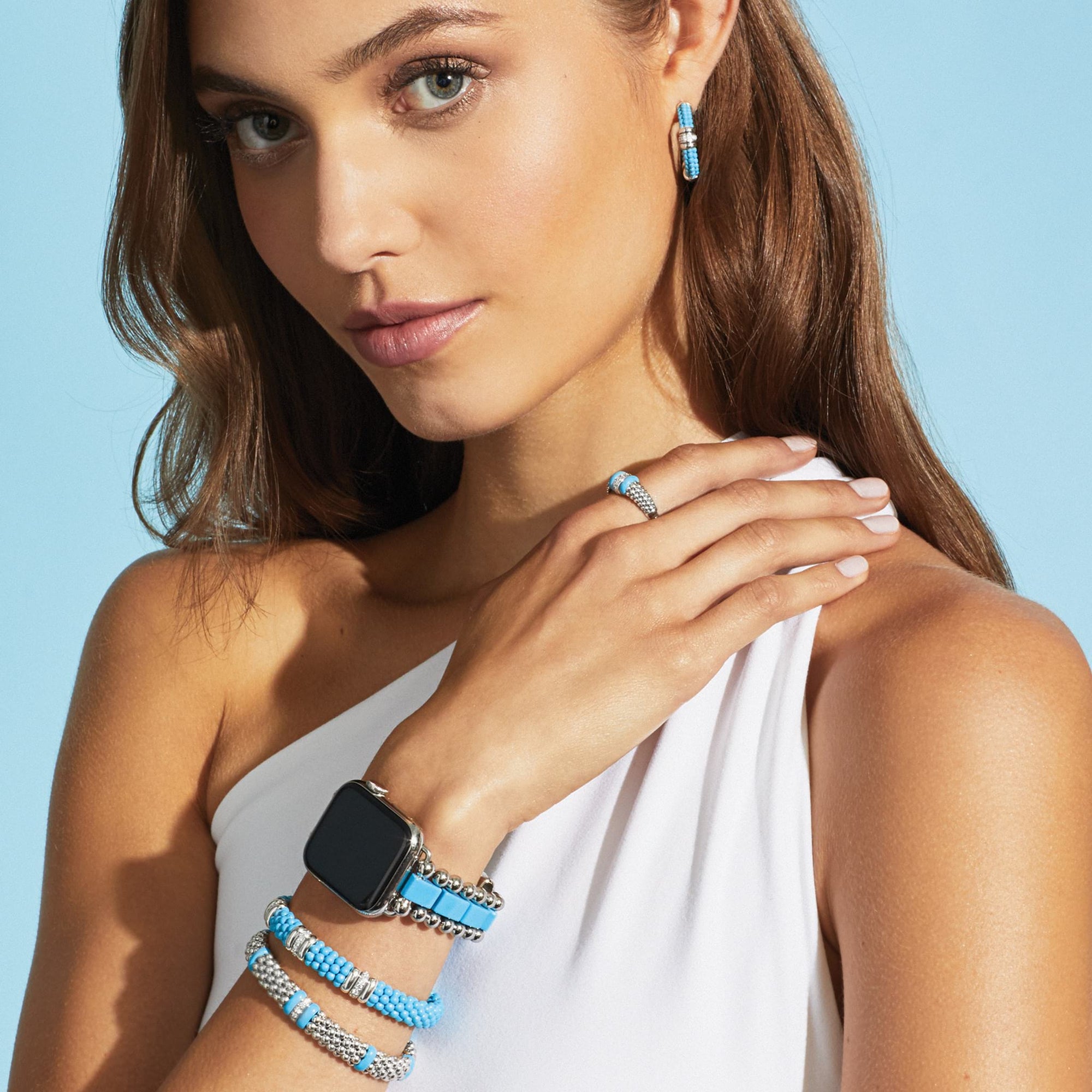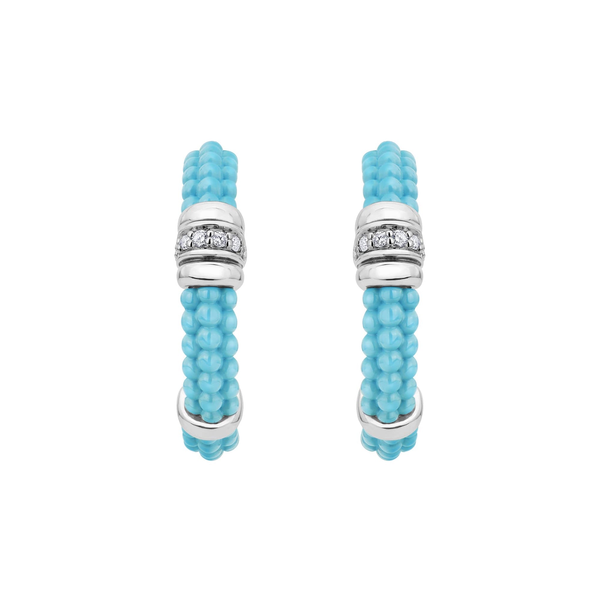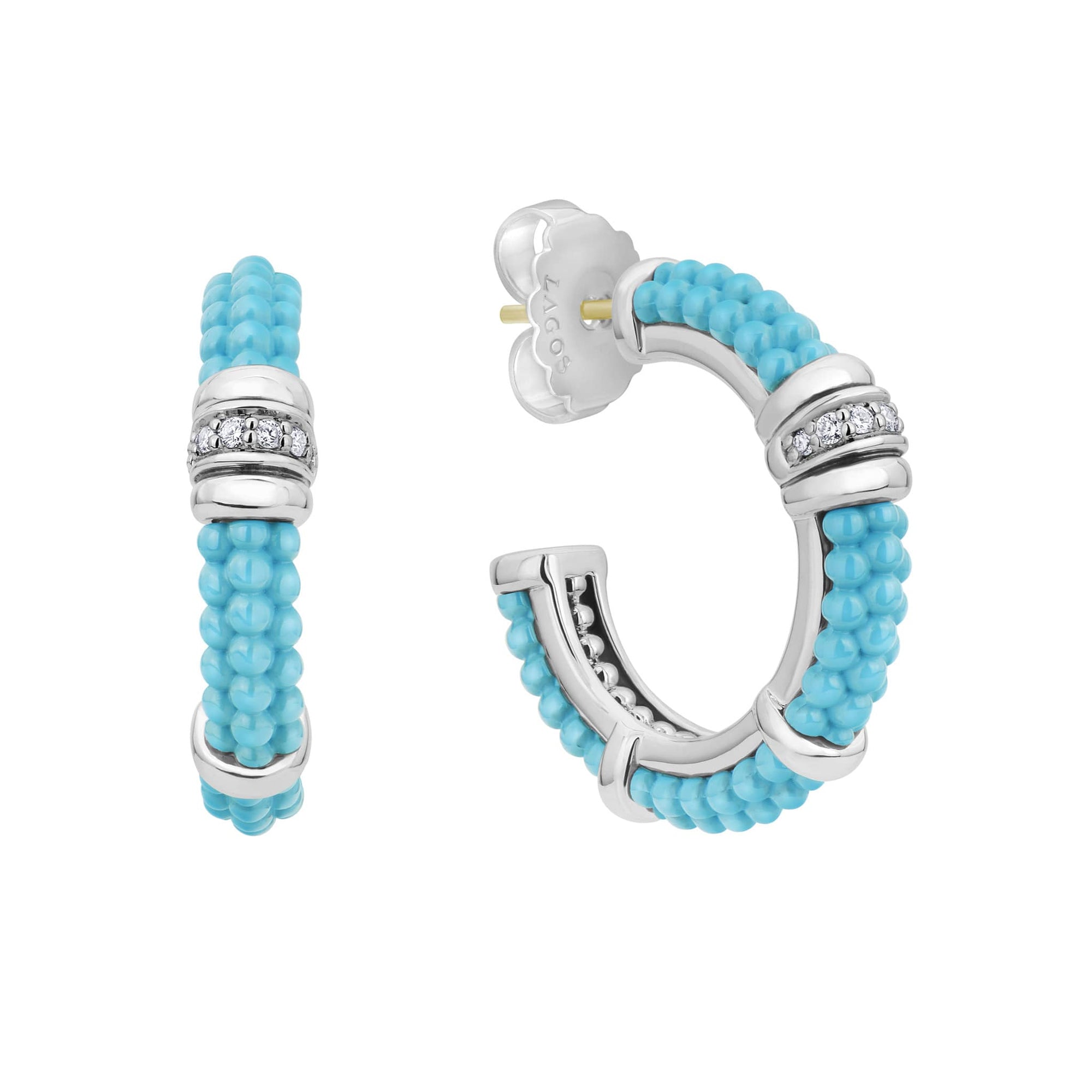 Blue ceramic Caviar beading, sterling silver and diamonds form these hoop earrings. LAGOS diamonds are the highest quality natural stones.