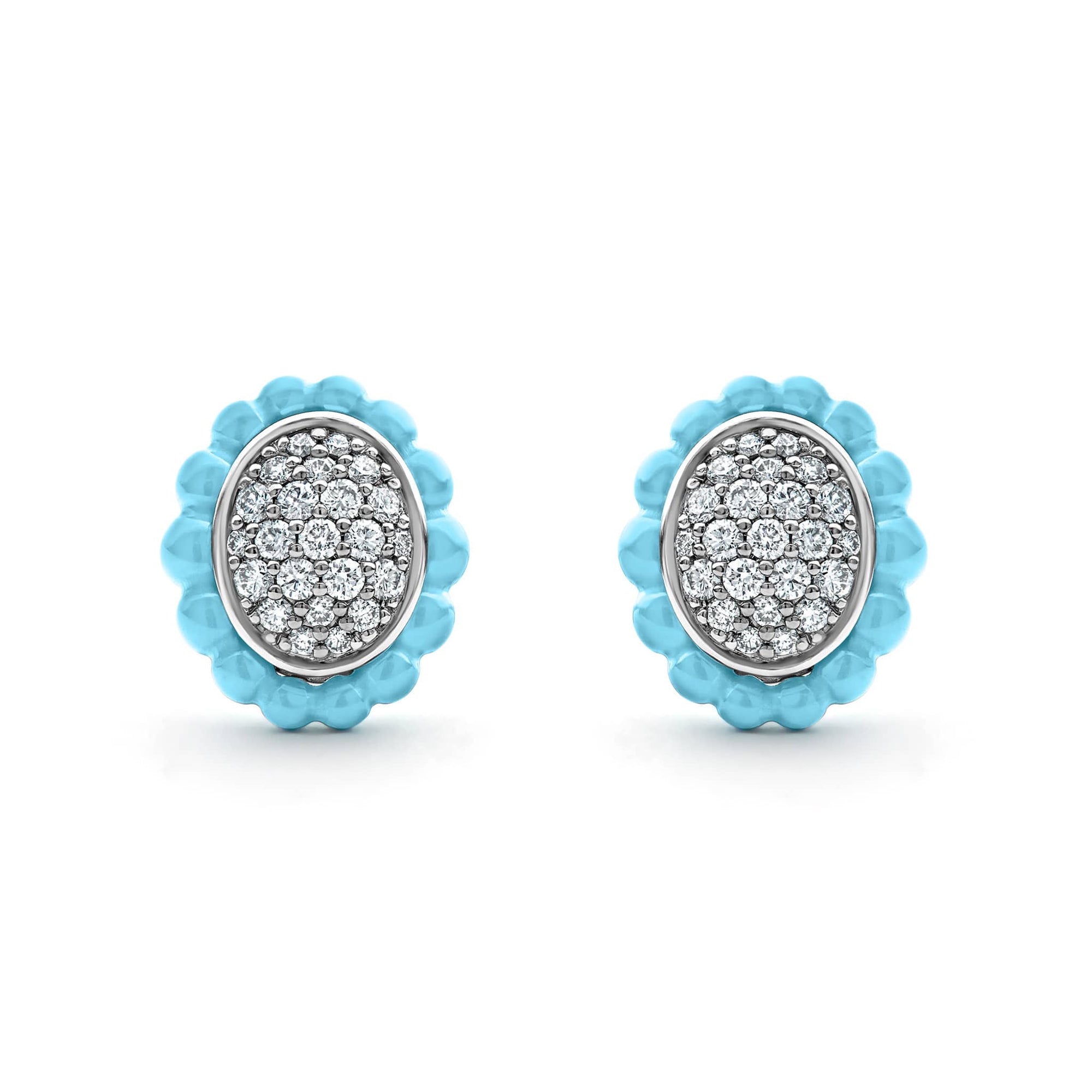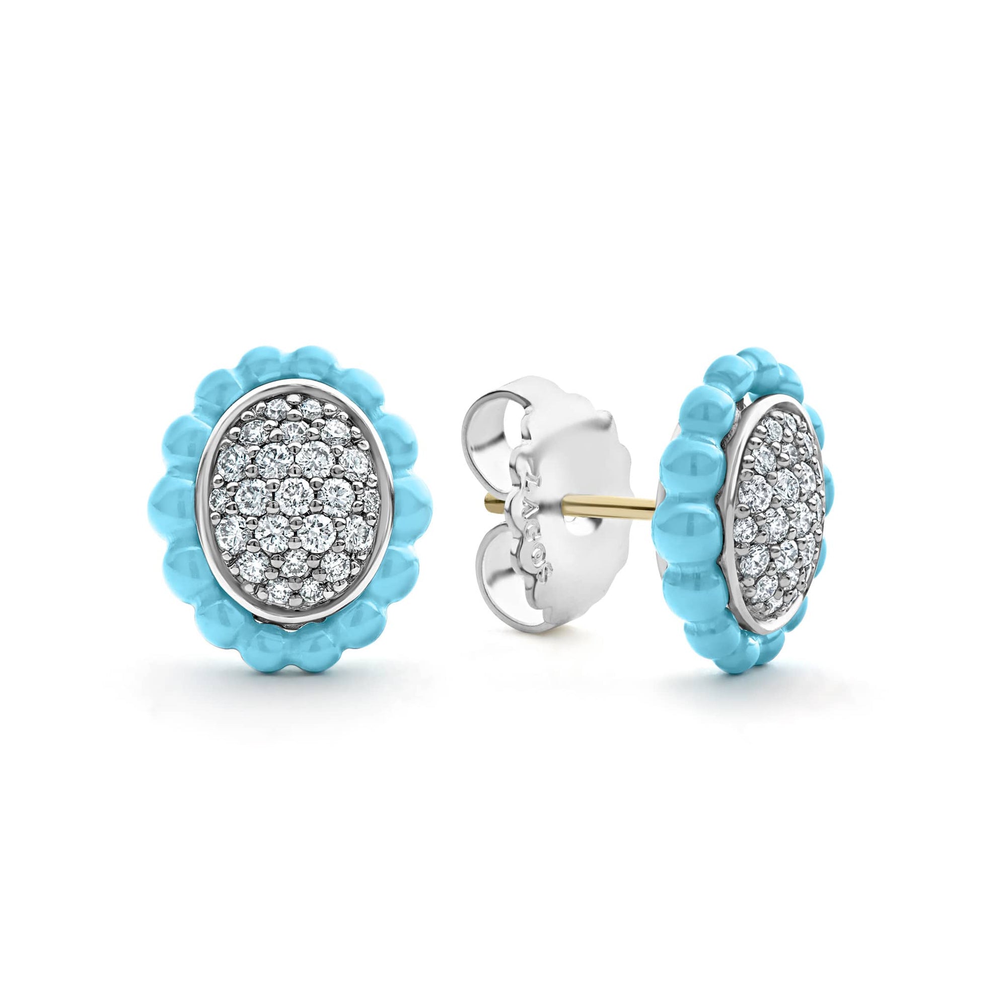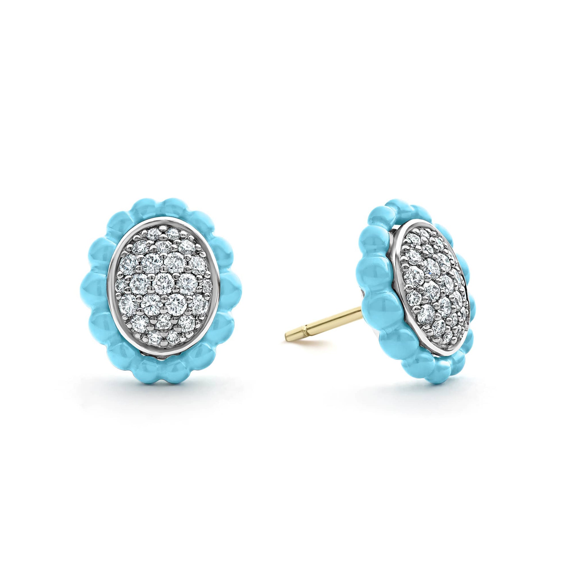 Blue ceramic beading surrounds these diamond stud earrings. LAGOS diamonds are the highest quality natural stones.