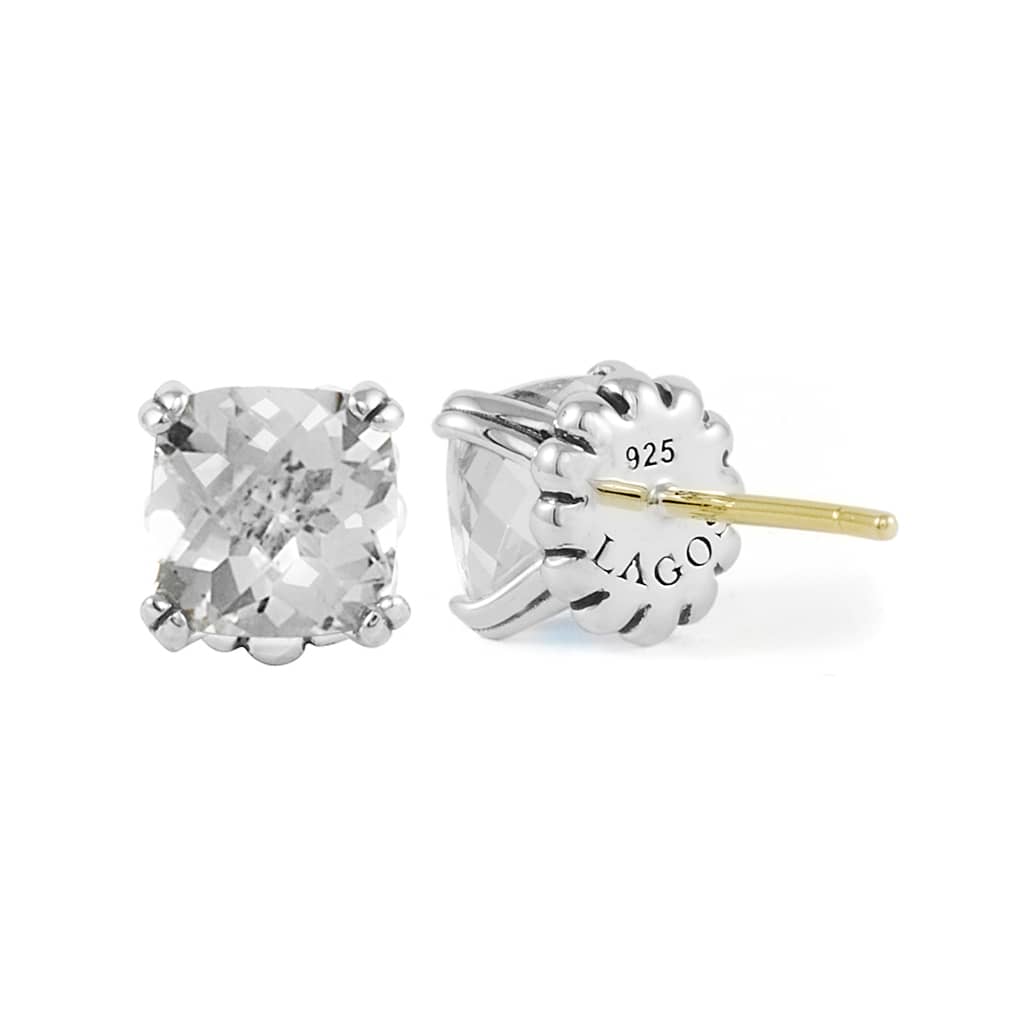 White topaz gemstones form these prong-set, cushion-shape stud earrings with harlequin facets.