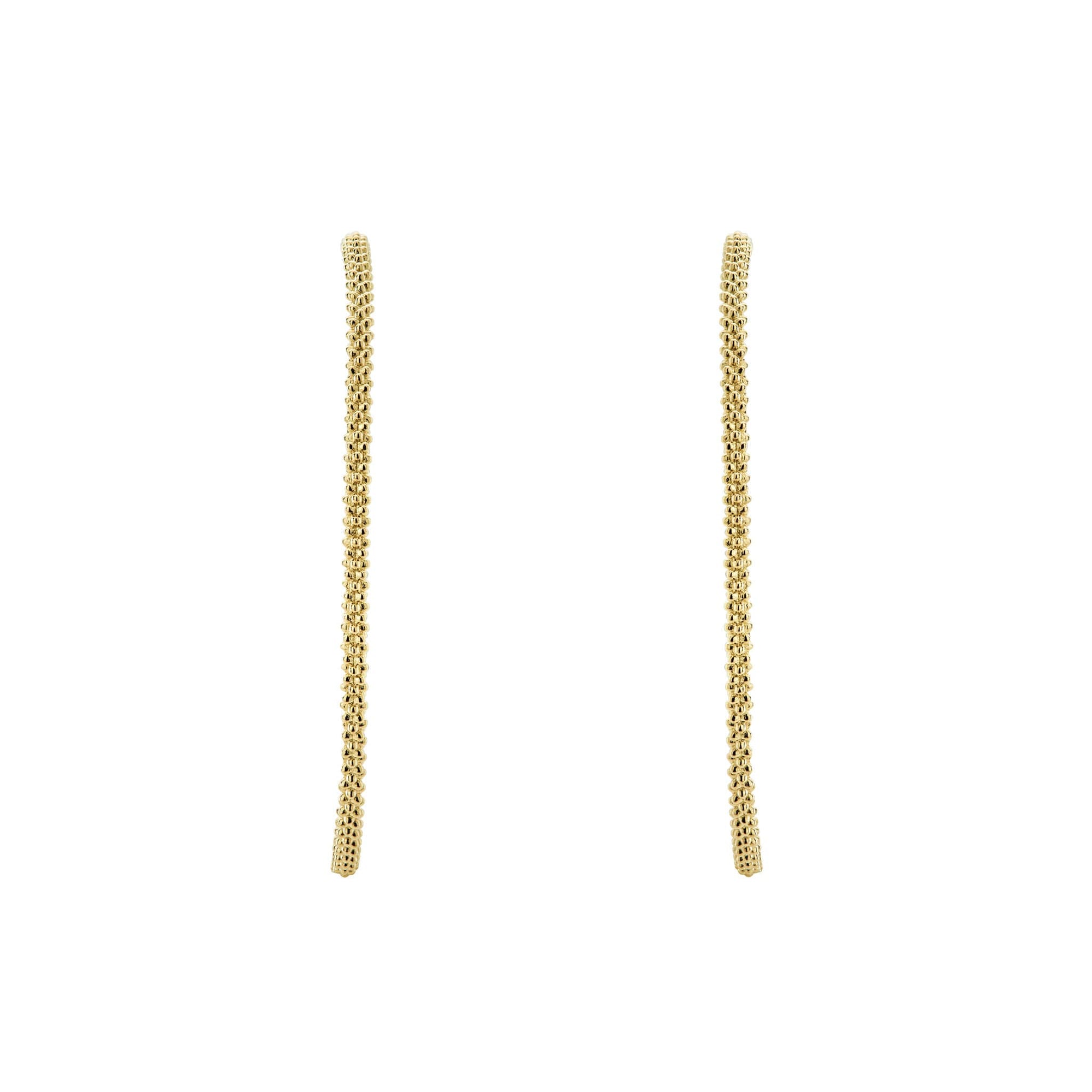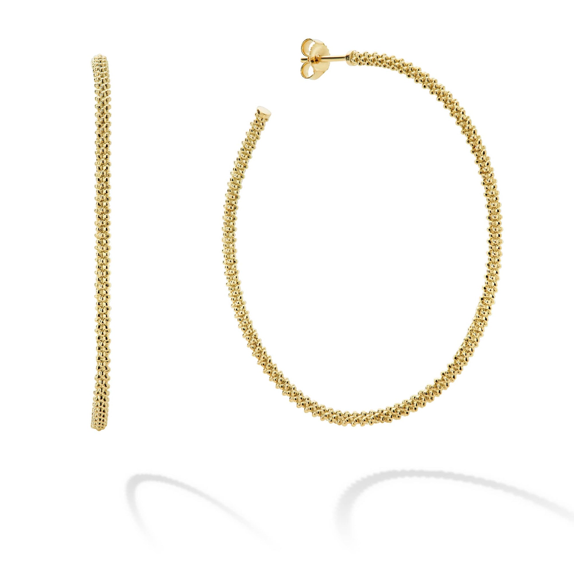 Bold gold hoop earrings formed of 18k gold Caviar beading.