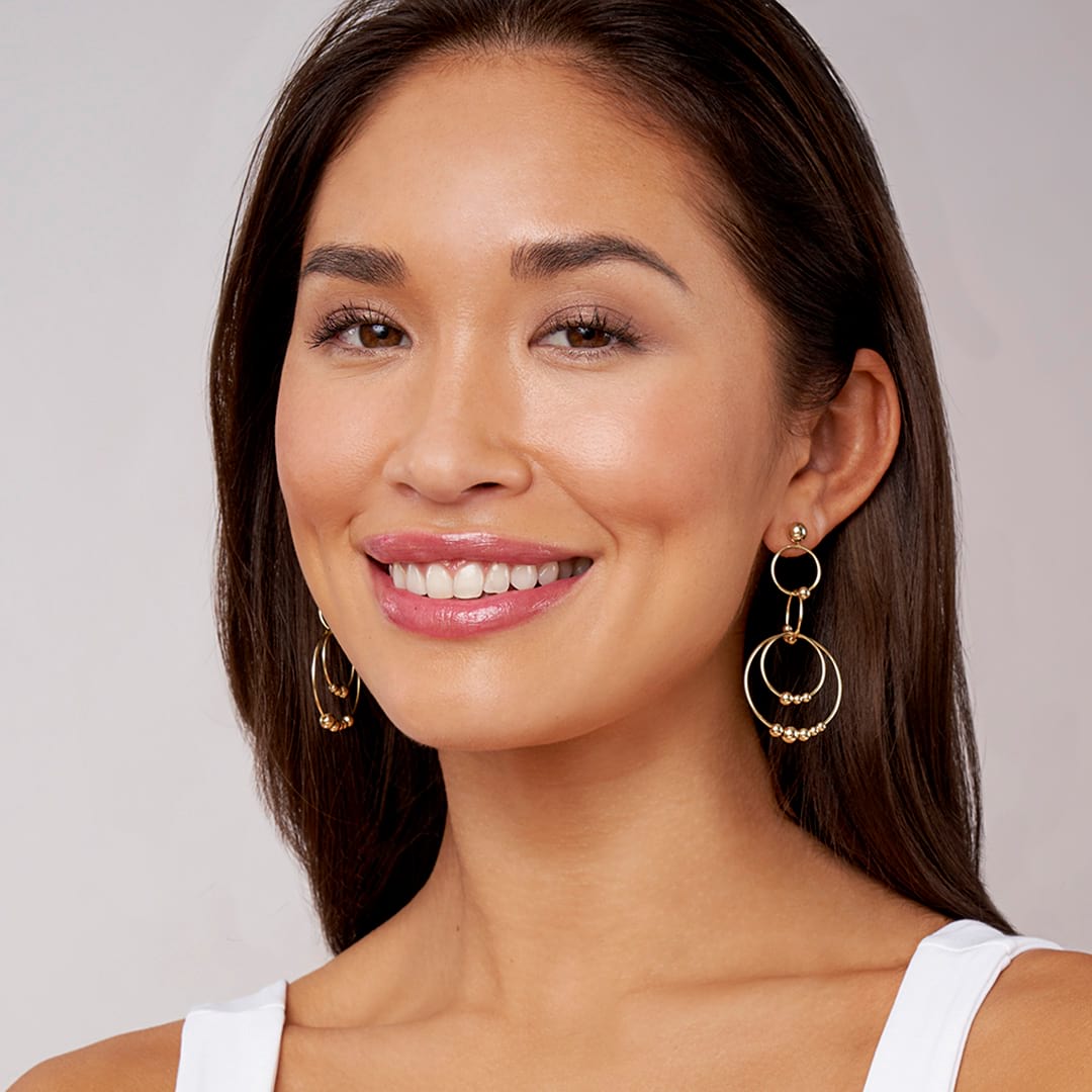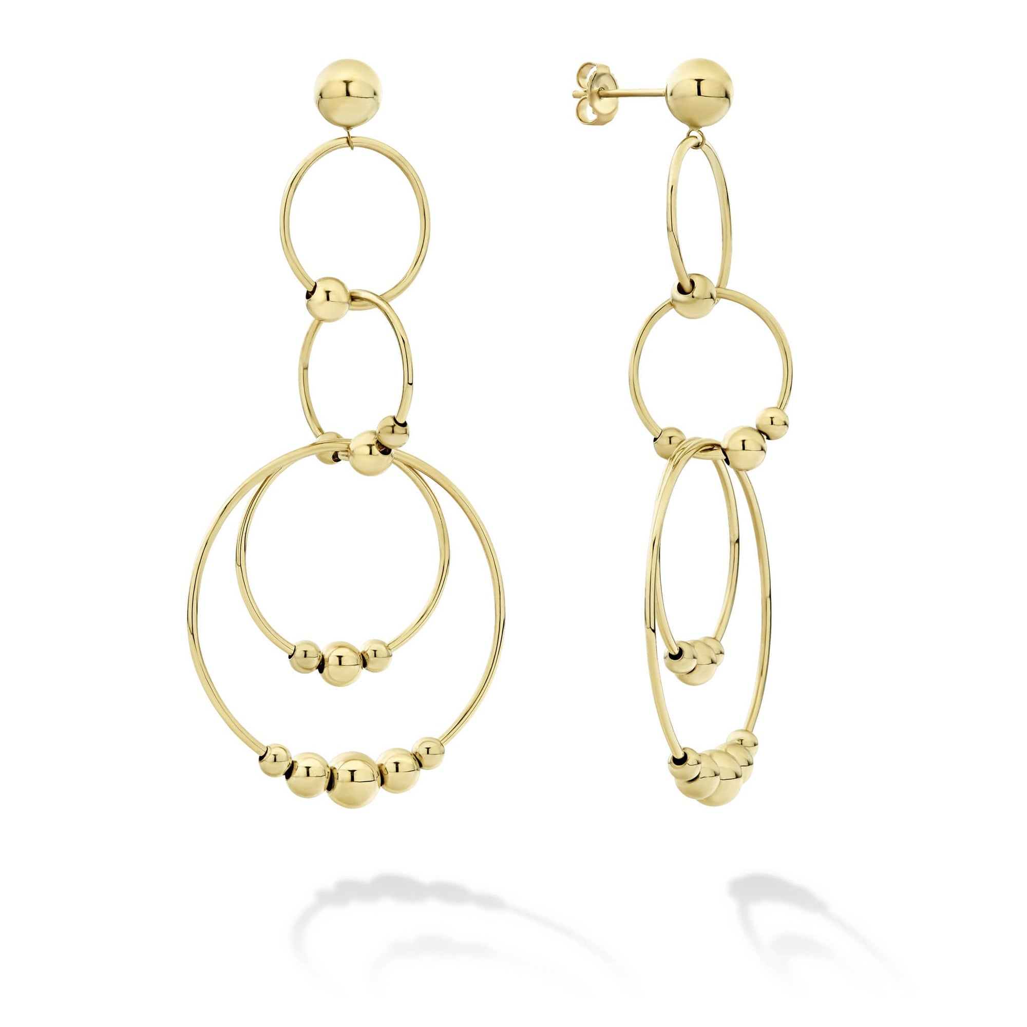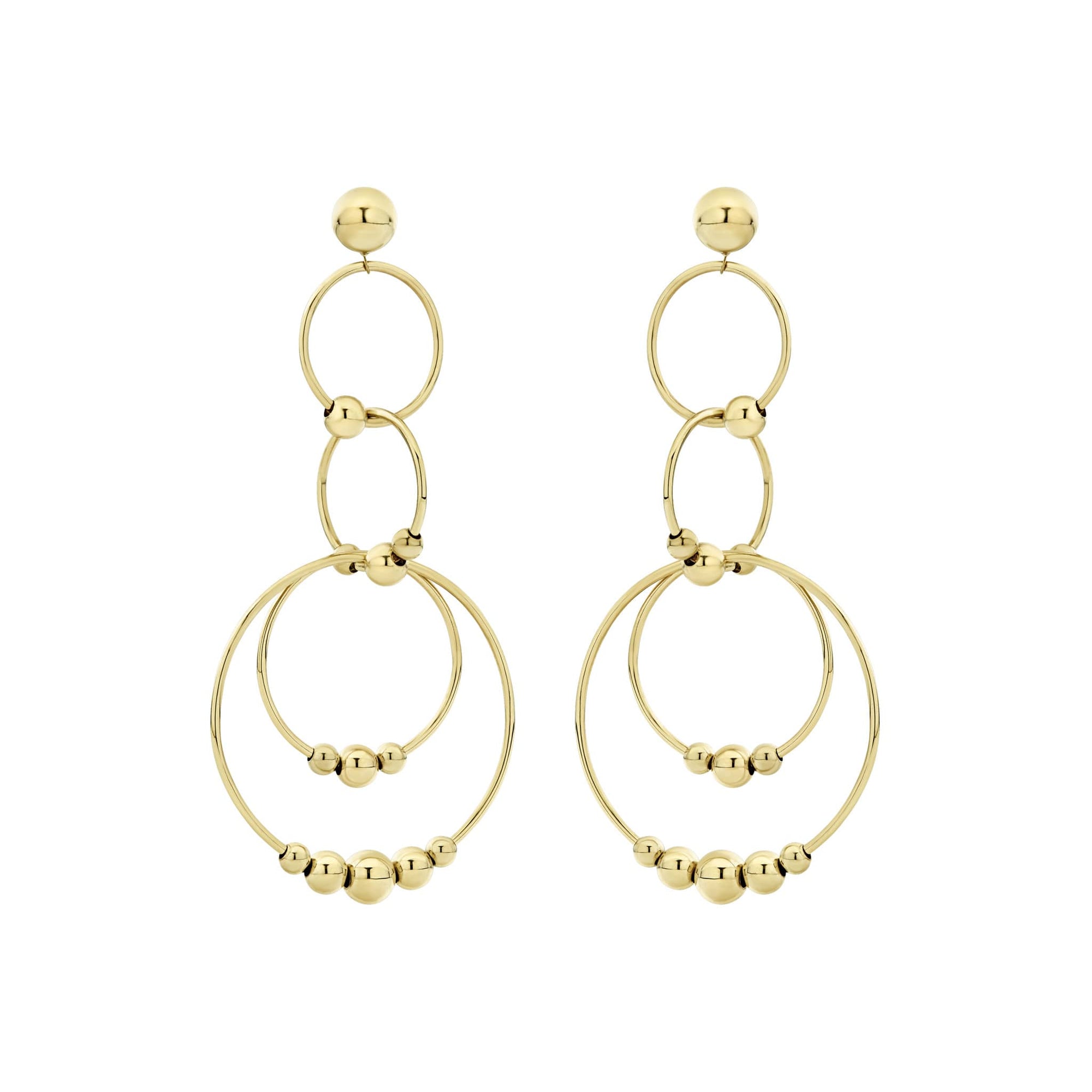 Long 18K gold drop earrings with four circles and Caviar beaded ball details.