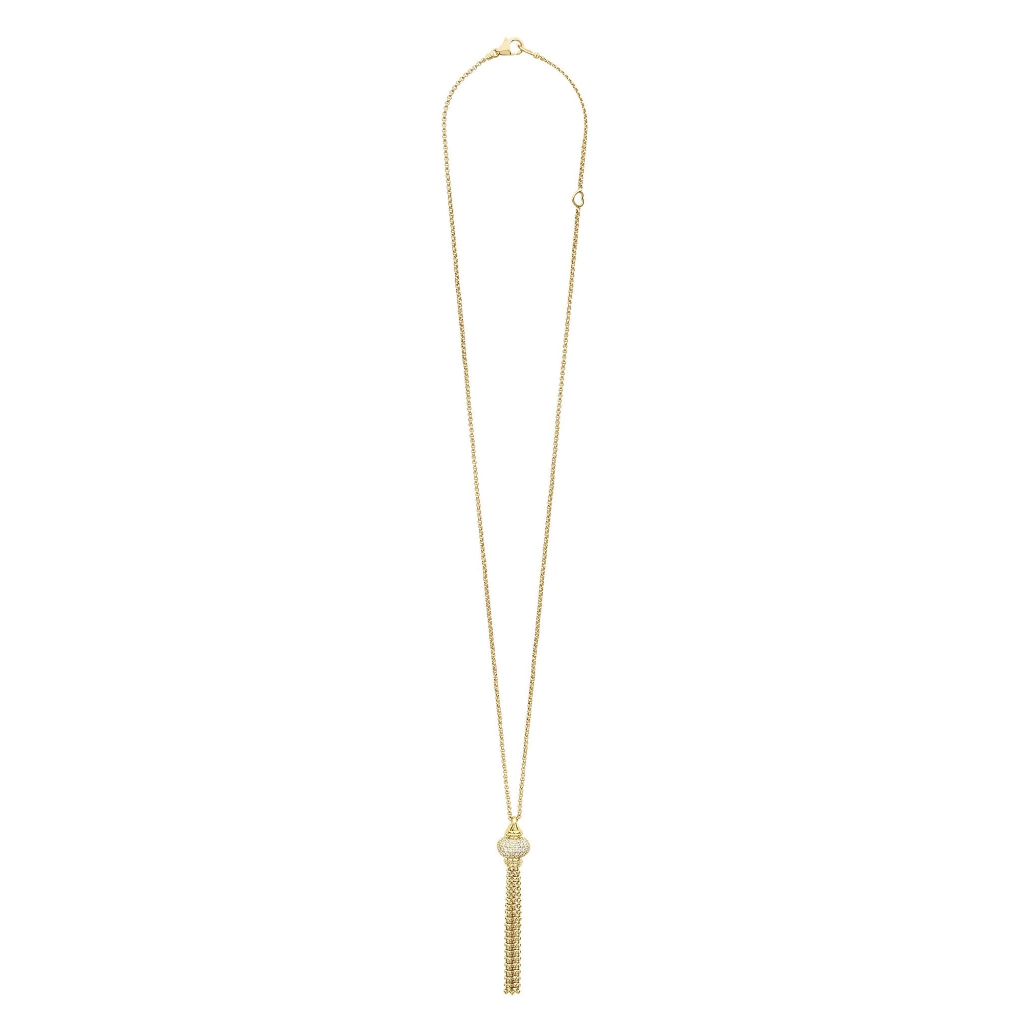 Diamonds accented by 18K gold Caviar details form this tassel necklace. LAGOS diamonds are the highest quality natural stones.