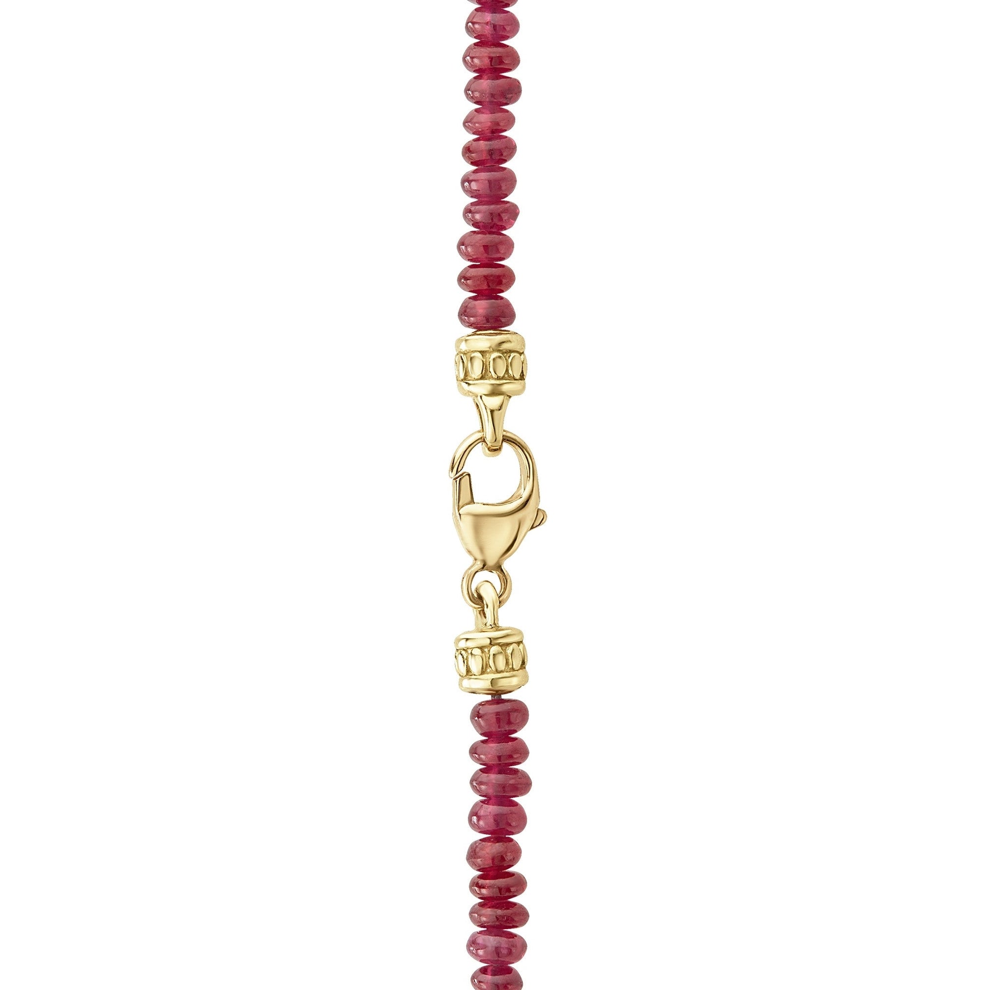 A LAGOS exclusive. A ruby gemstone necklace and ruby gemstone tassel pendant with 18K gold Caviar beading form this pendant necklace.