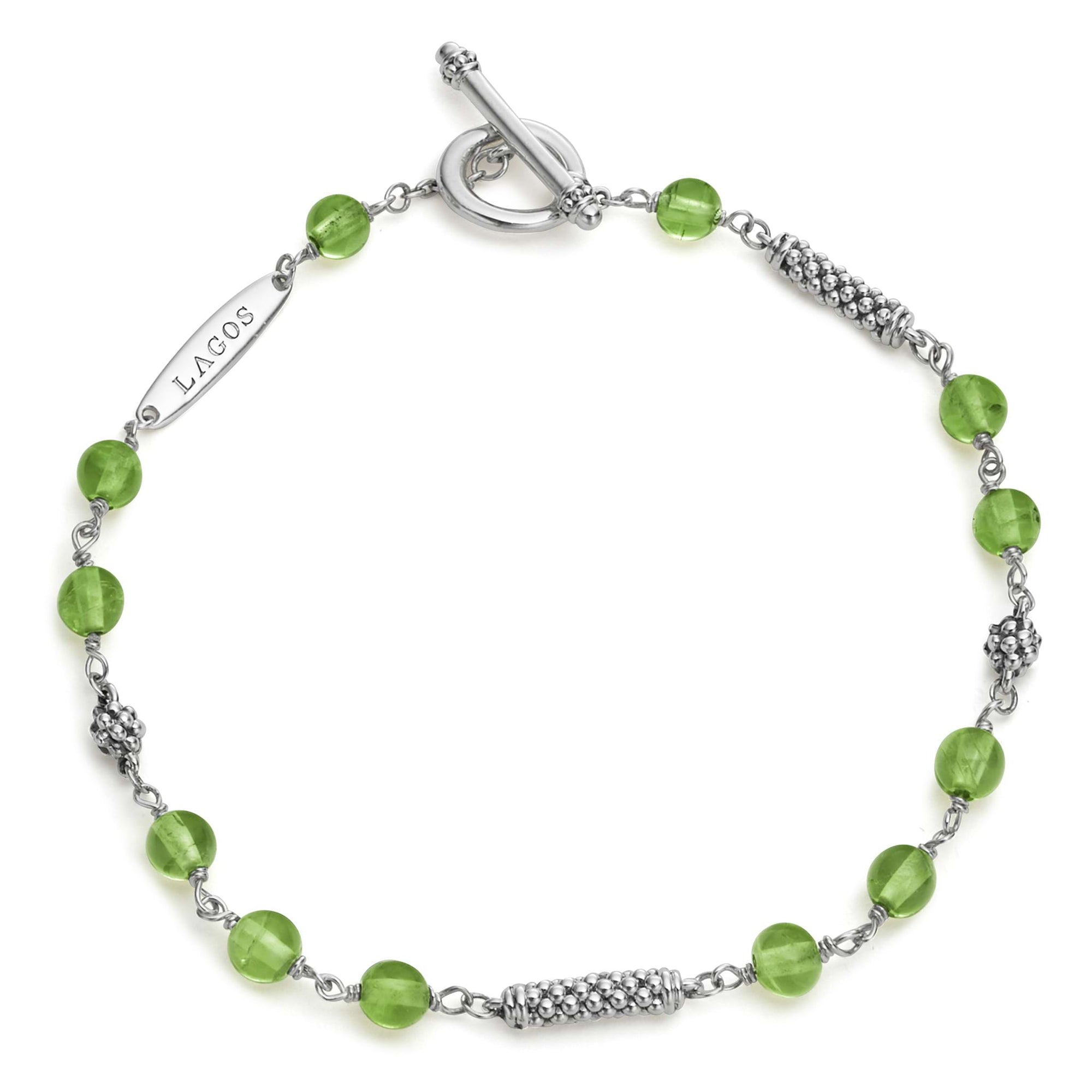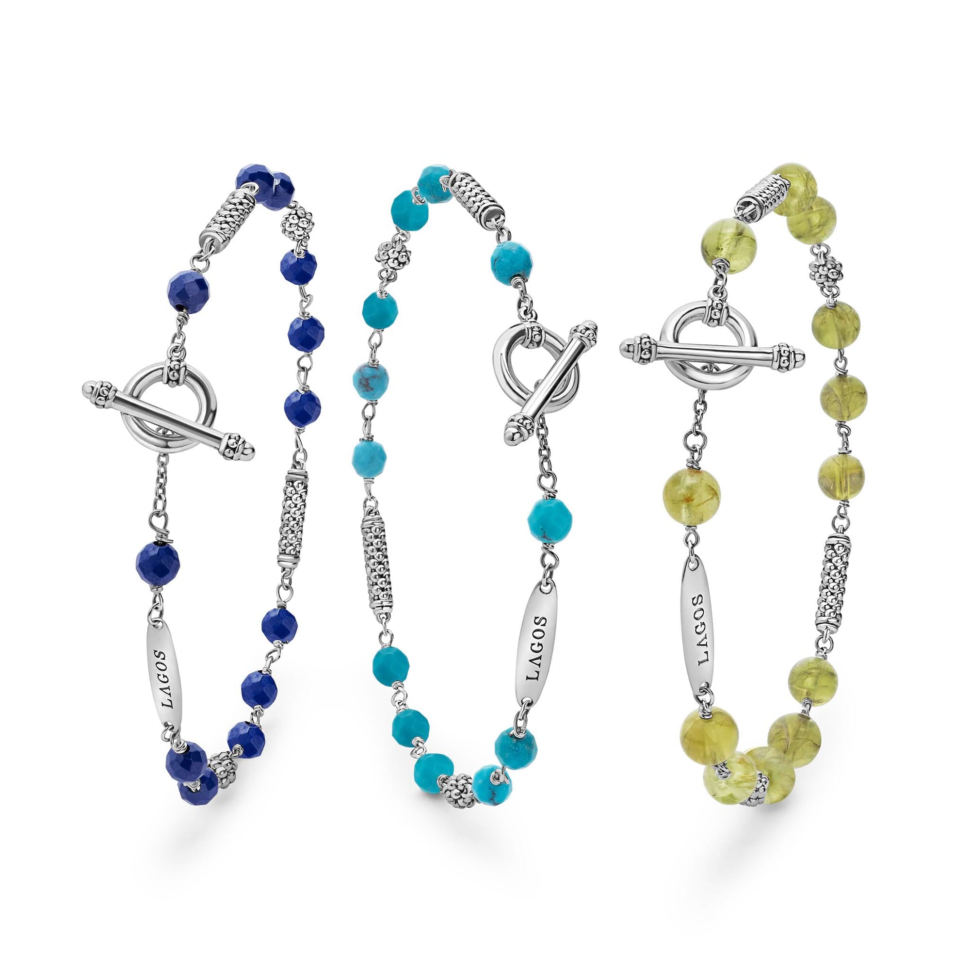 A LAGOS exclusive. Three Caviar Icon gemstone bracelets. One Ultramarine gemstone and sterling silver Caviar beaded bracelet. One Peridot gemstone and sterling silver Caviar beaded bracelet. One Turquoise and sterling silver Caviar beaded bracelet.