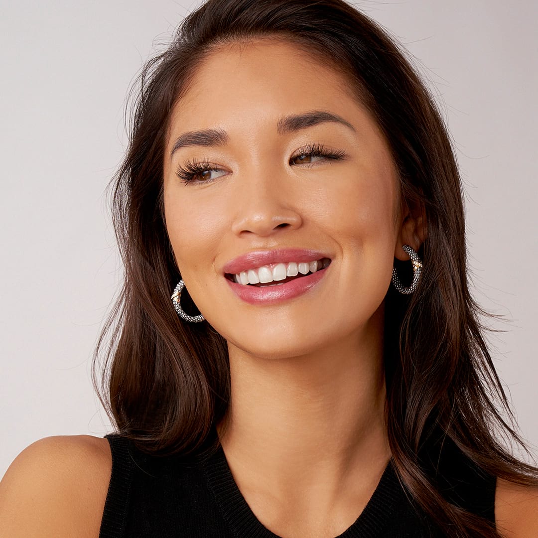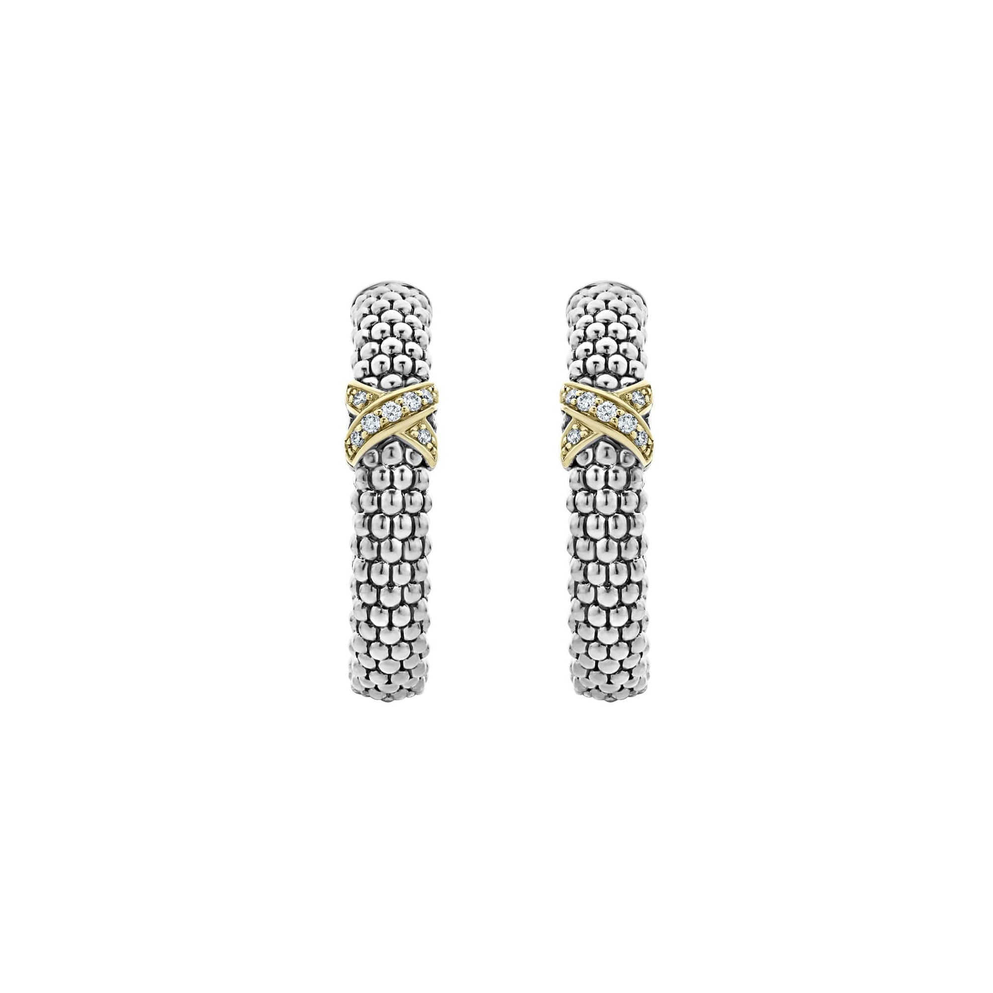 Signature sterling silver Caviar beading accented by a diamond and 18K gold x station on these hoop earrings. LAGOS diamonds are the highest quality natural stones.
