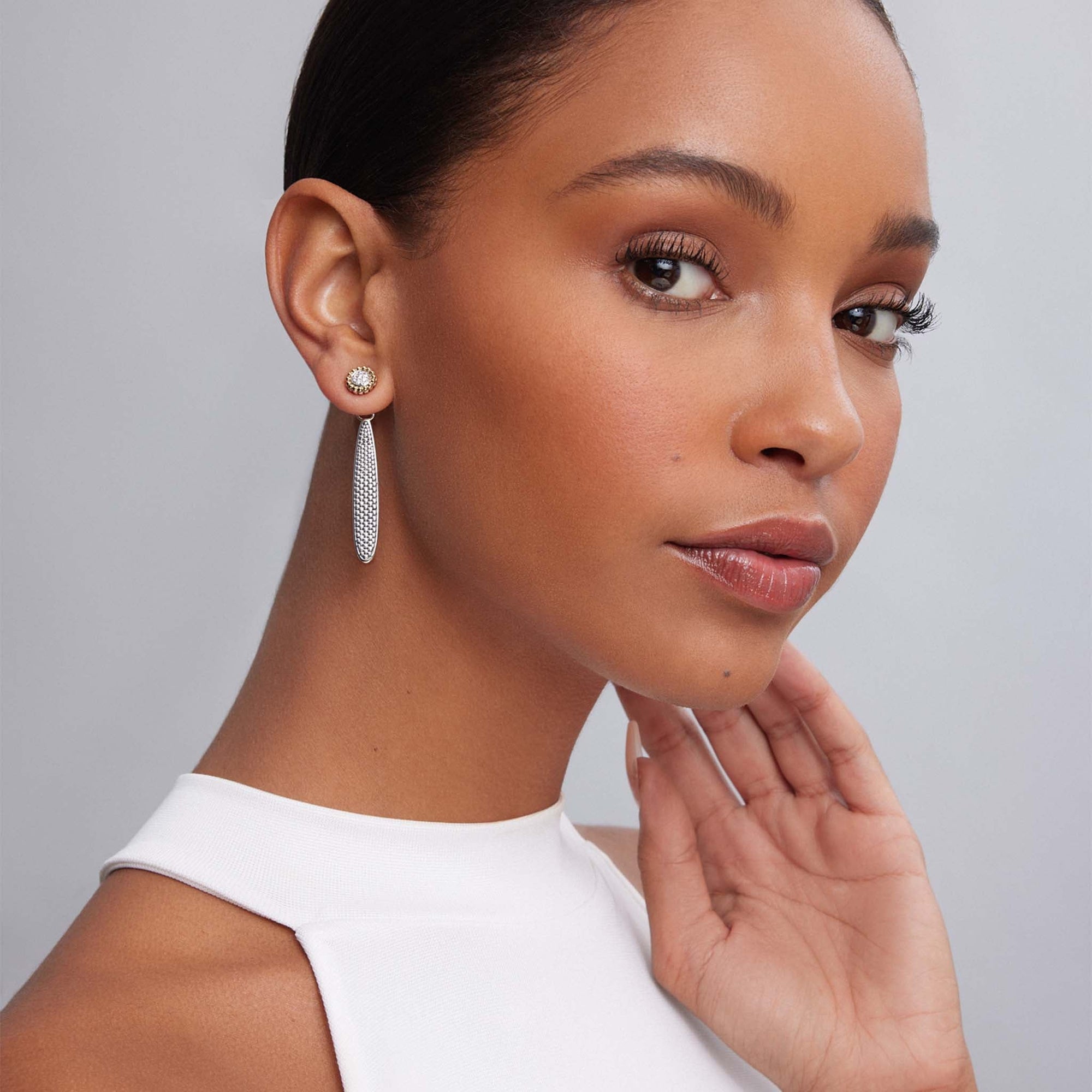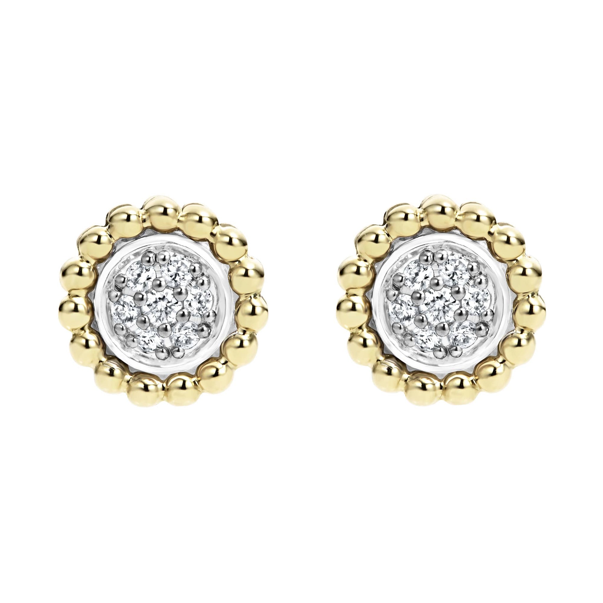 Pavé diamond circle stud earrings framed by 18K gold Caviar beading. LAGOS diamonds are the highest quality natural stones.