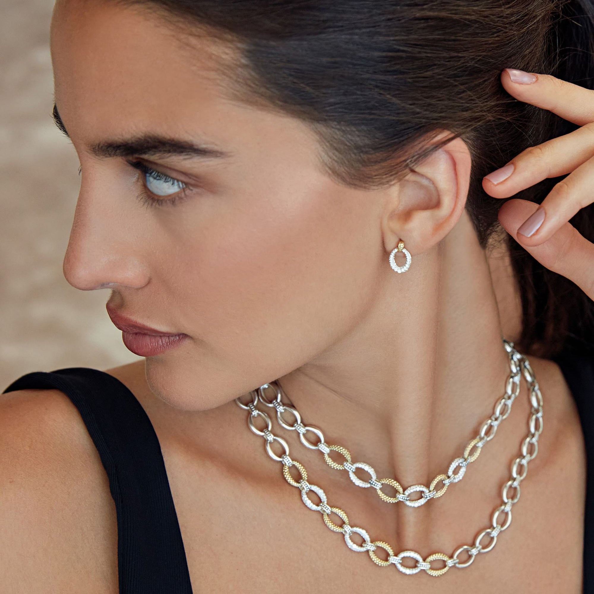 Oval drop diamond earrings highlighted by 18k gold Caviar beading. LAGOS diamonds are the highest quality natural stones.