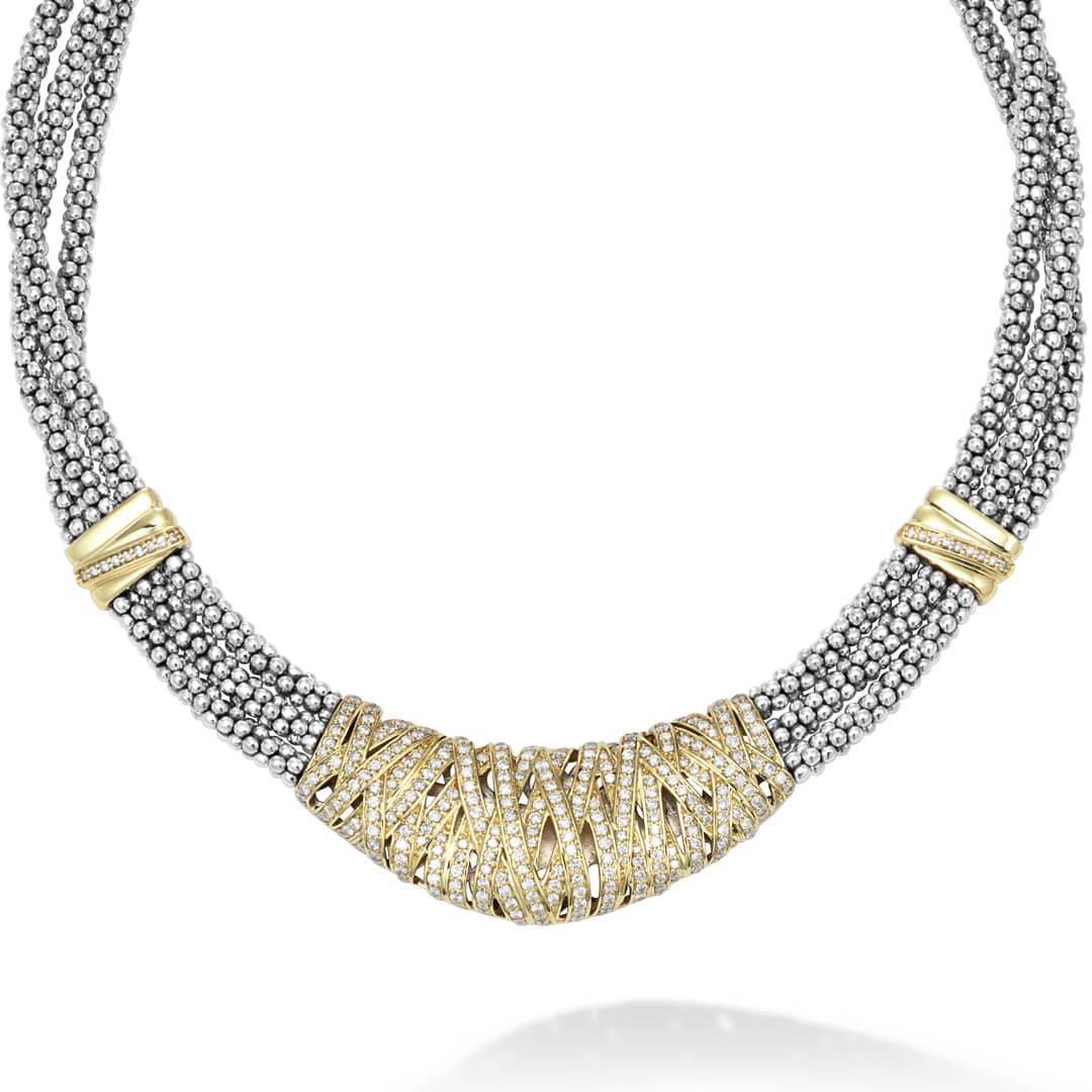 Pavé diamonds in 18K gold wrap around this statement necklace with three strands of sterling silver beading. LAGOS diamonds are the highest quality natural stones.