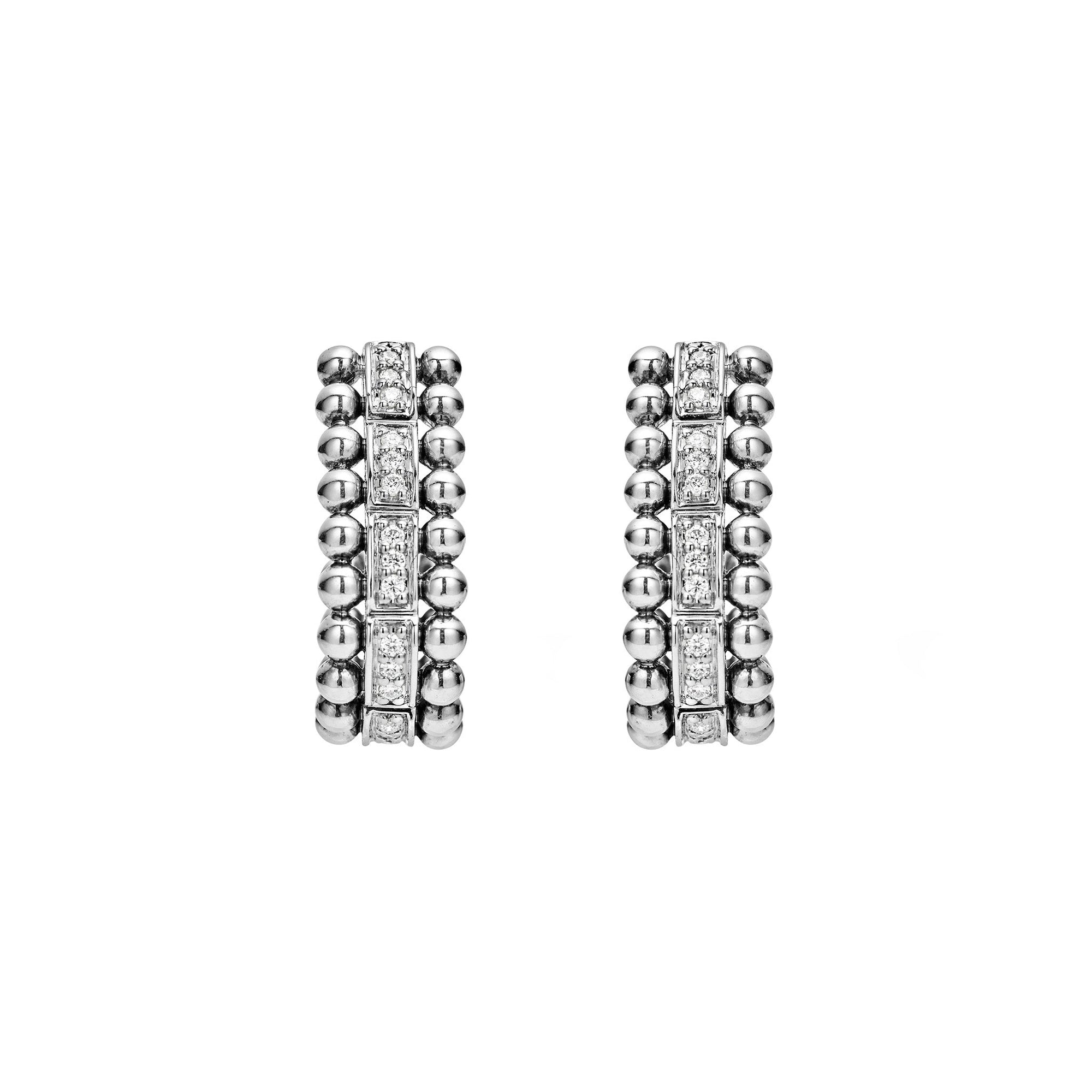Diamond hoop earrings framed by sterling silver Caviar beading. LAGOS diamonds are the highest quality natural stones.