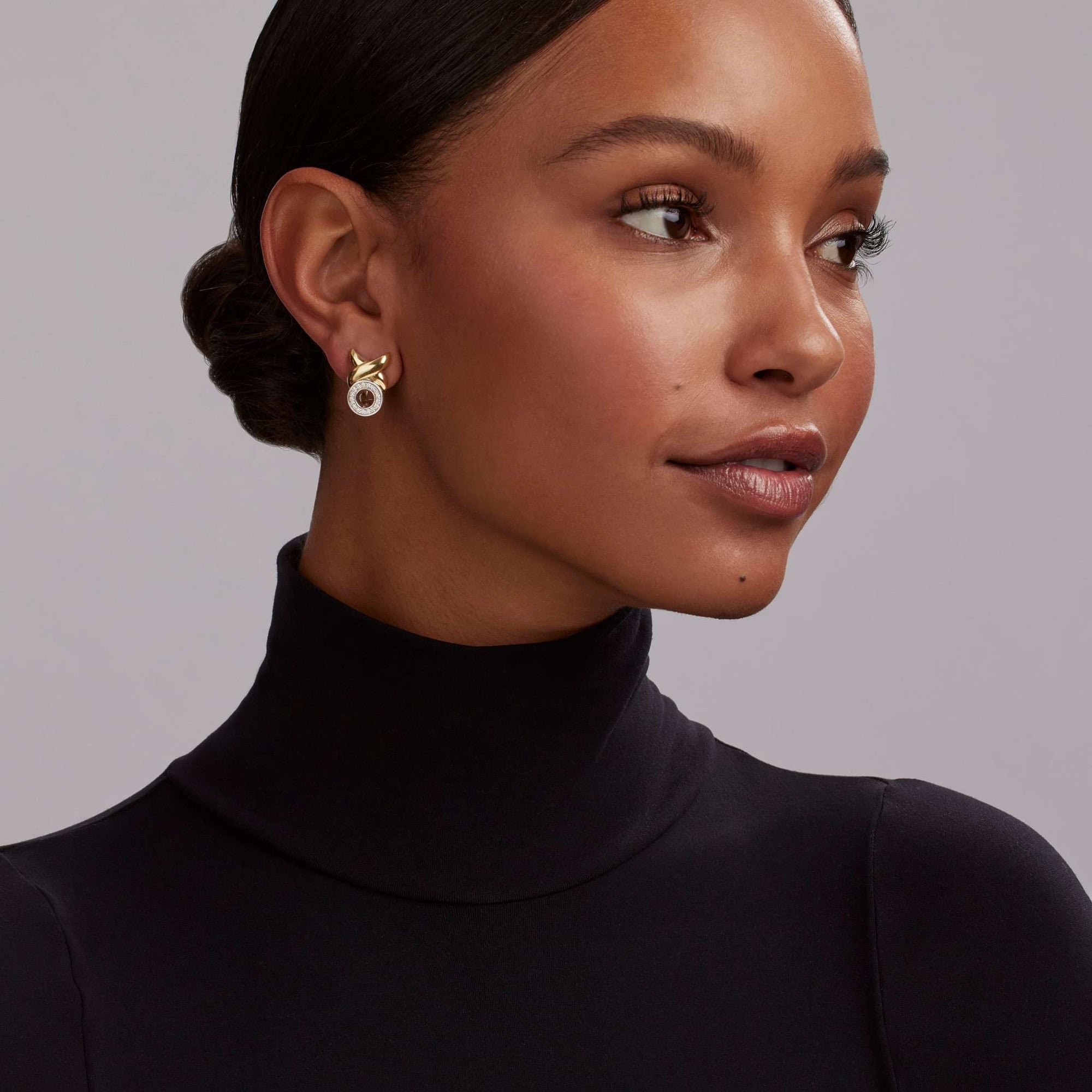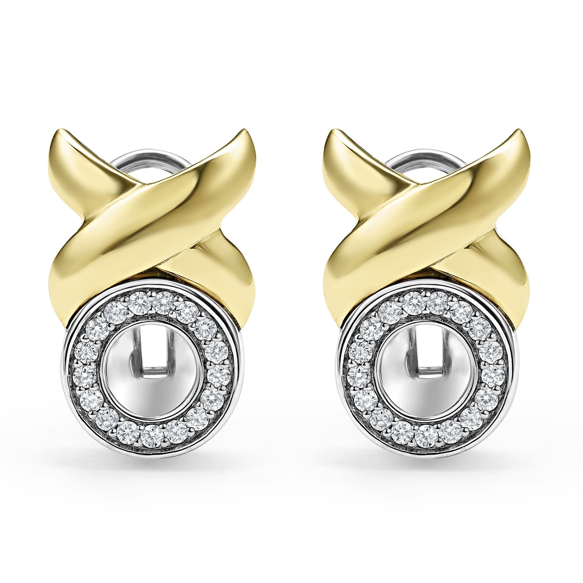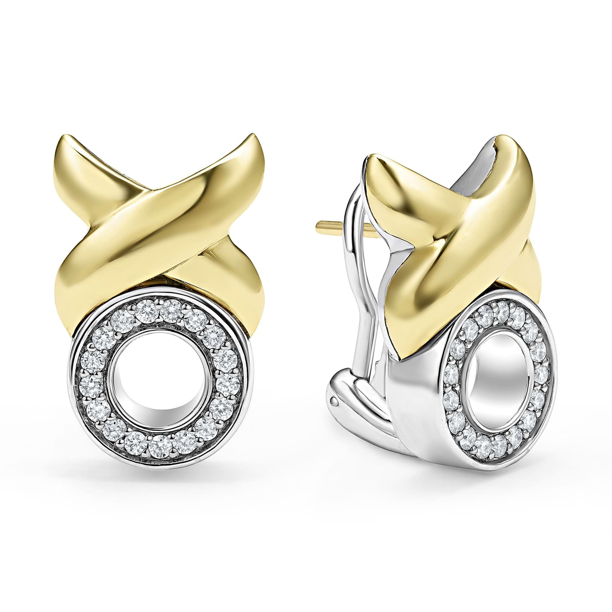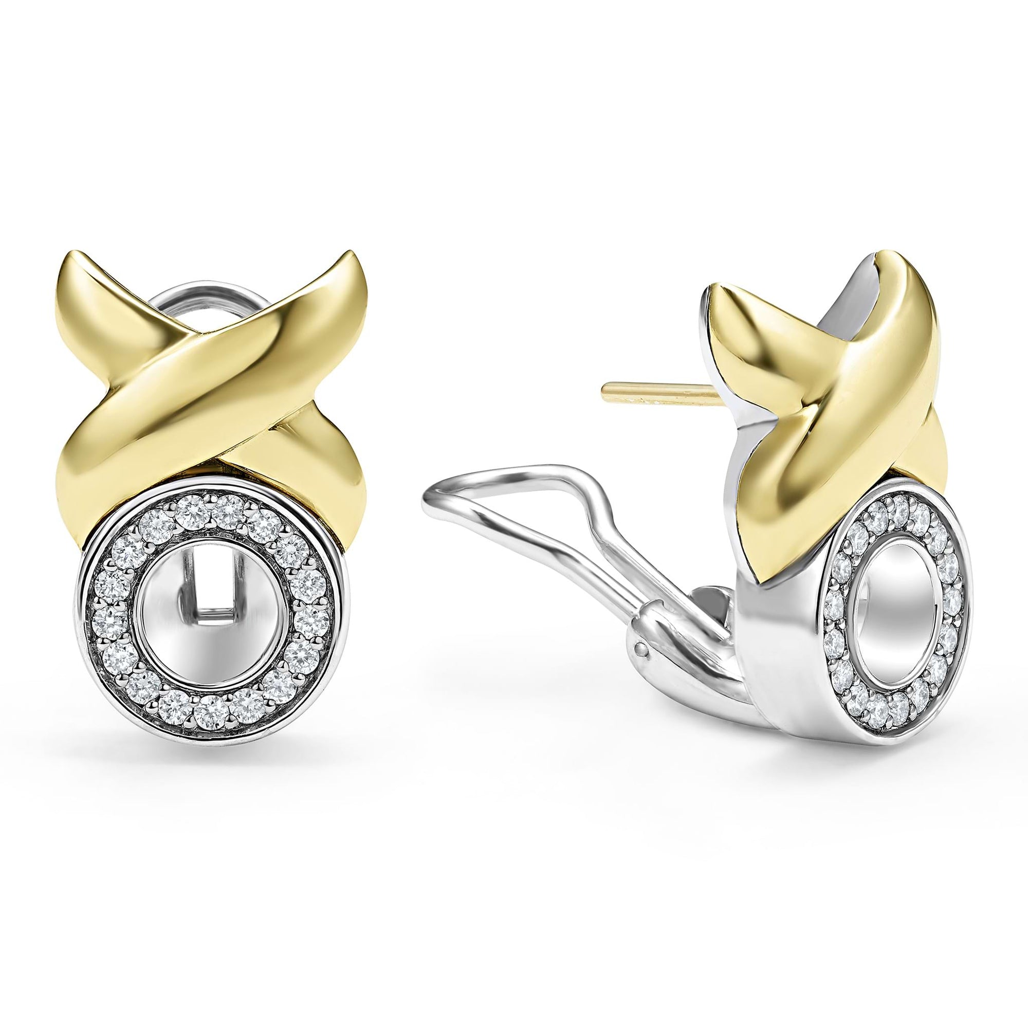 Sterling silver, diamonds and a smooth 18K gold X-motif form these omega clip earrings.