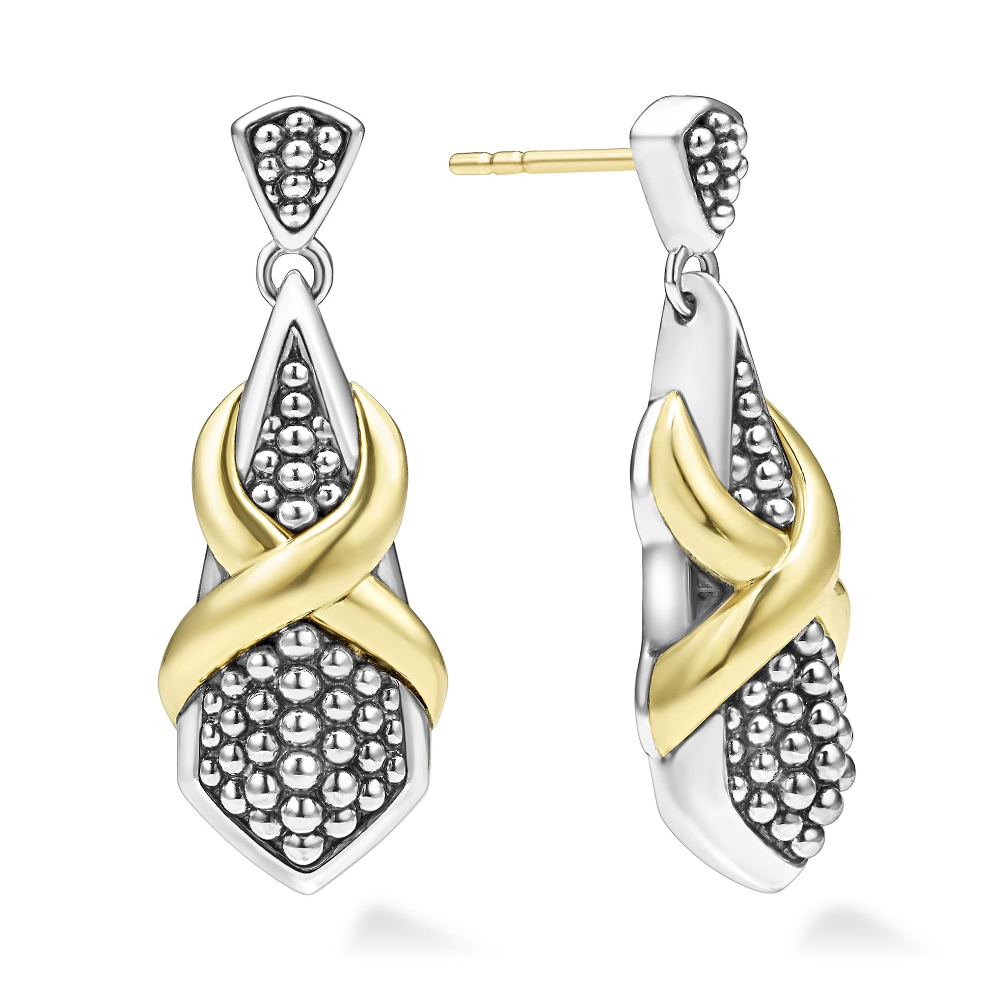 A smooth 18k gold X and sterling silver Caviar beading form these drop earrings.