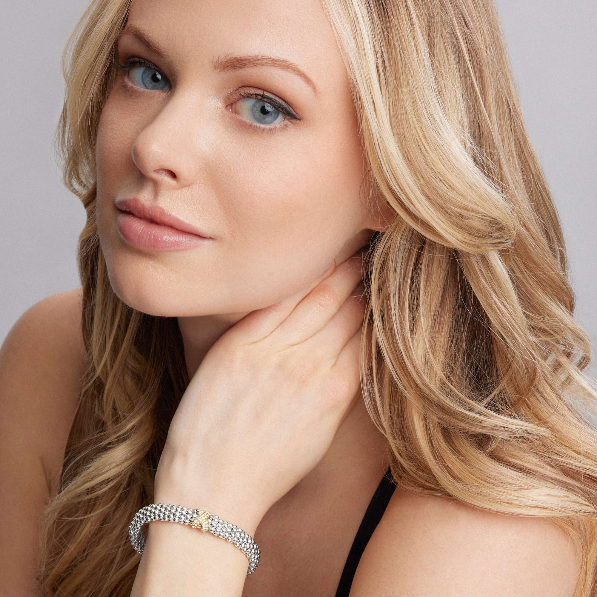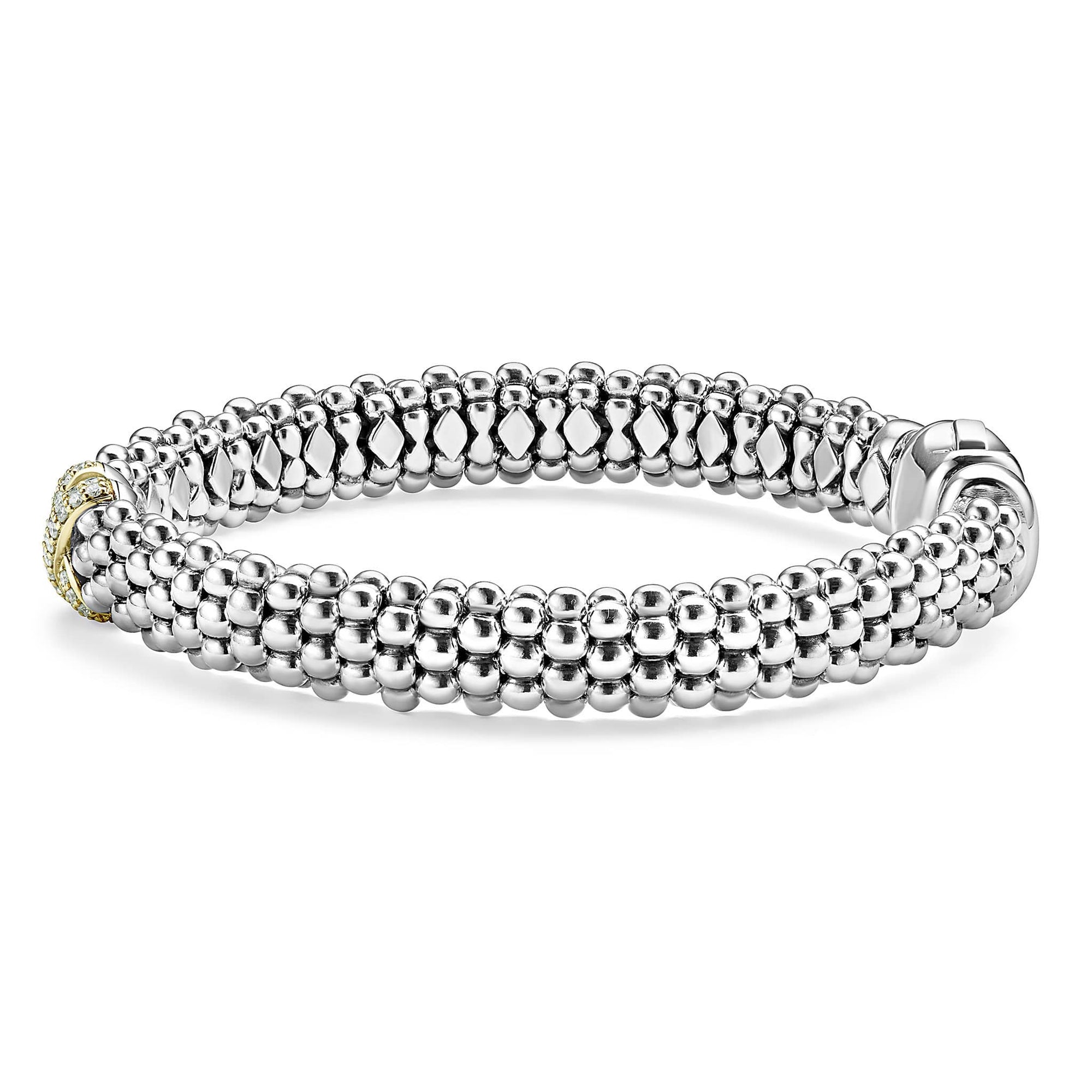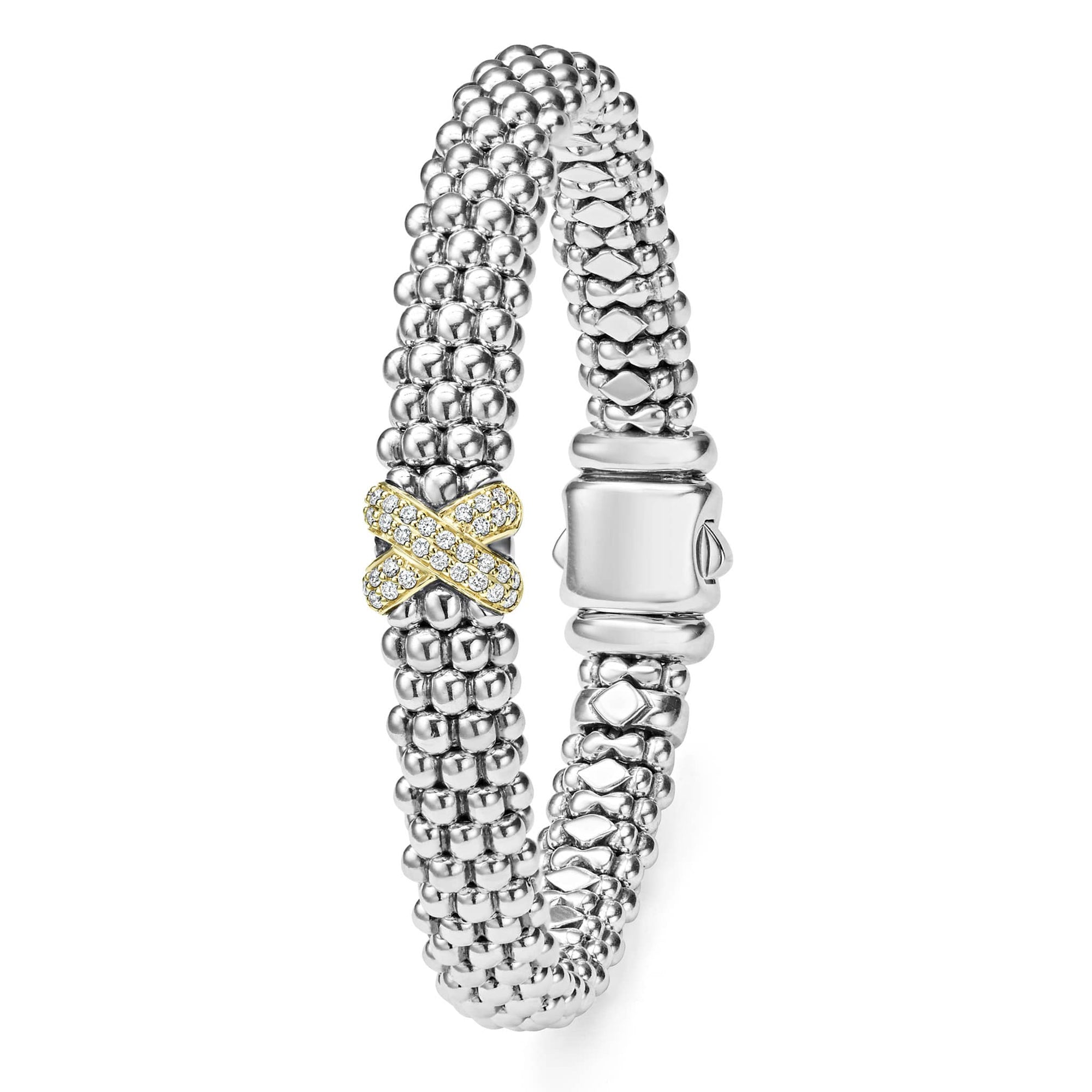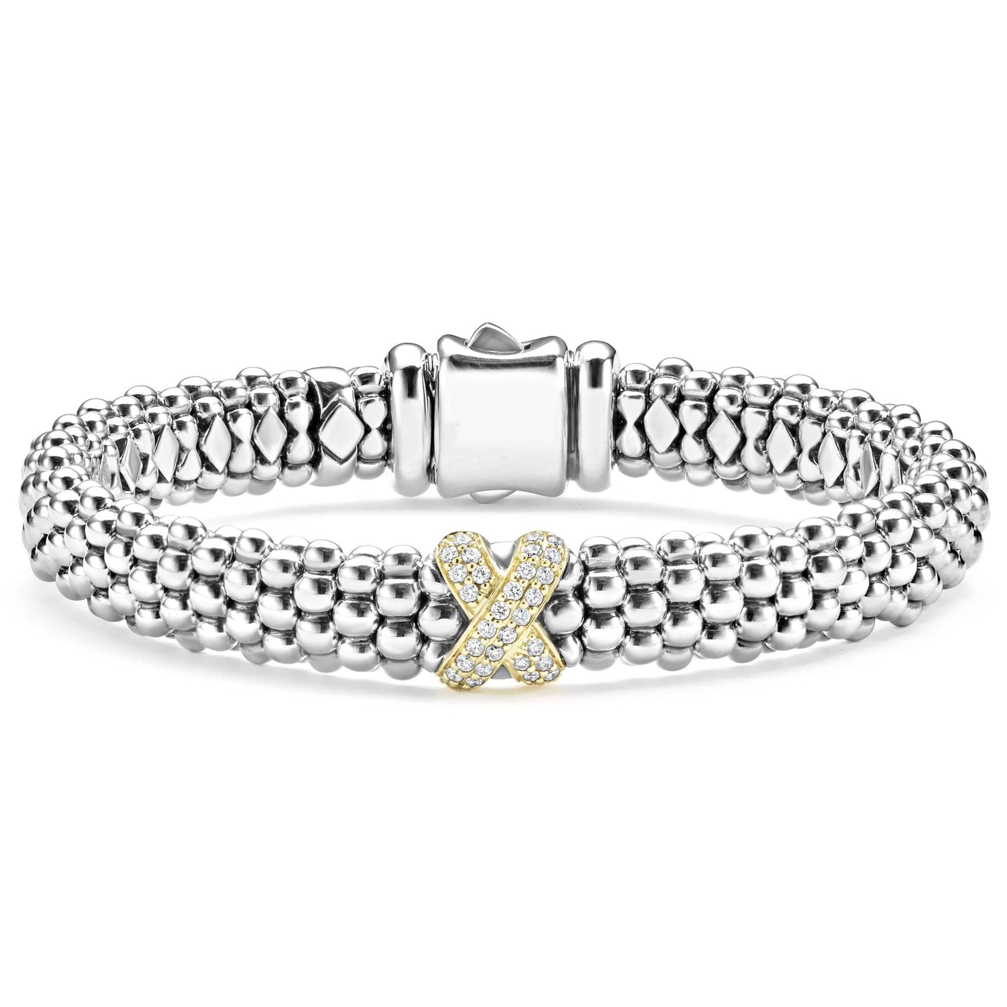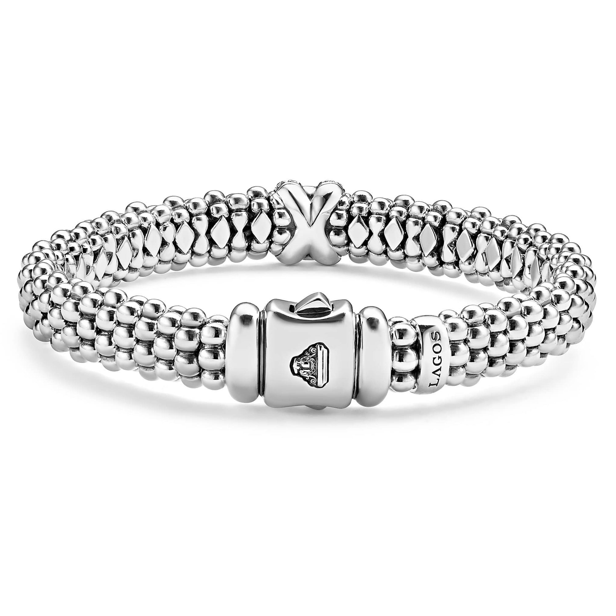 A single diamond x station set in 18K gold wraps this signature sterling silver Caviar beaded bracelet. LAGOS diamonds are the highest quality natural stones.