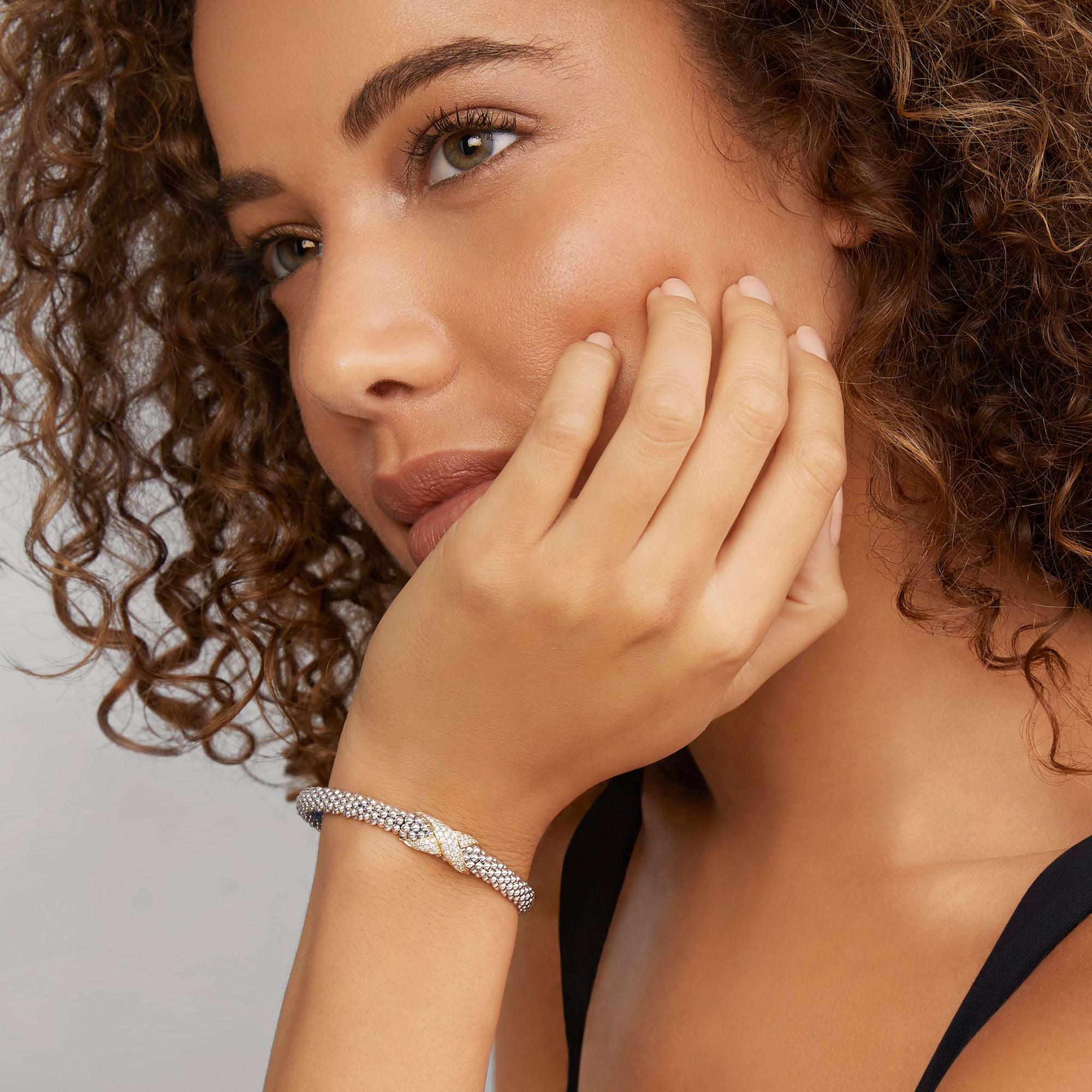 Smooth 18K gold, diamonds, and sterling silver Caviar beading form this X station bracelet. LAGOS diamonds are the highest quality natural stones.