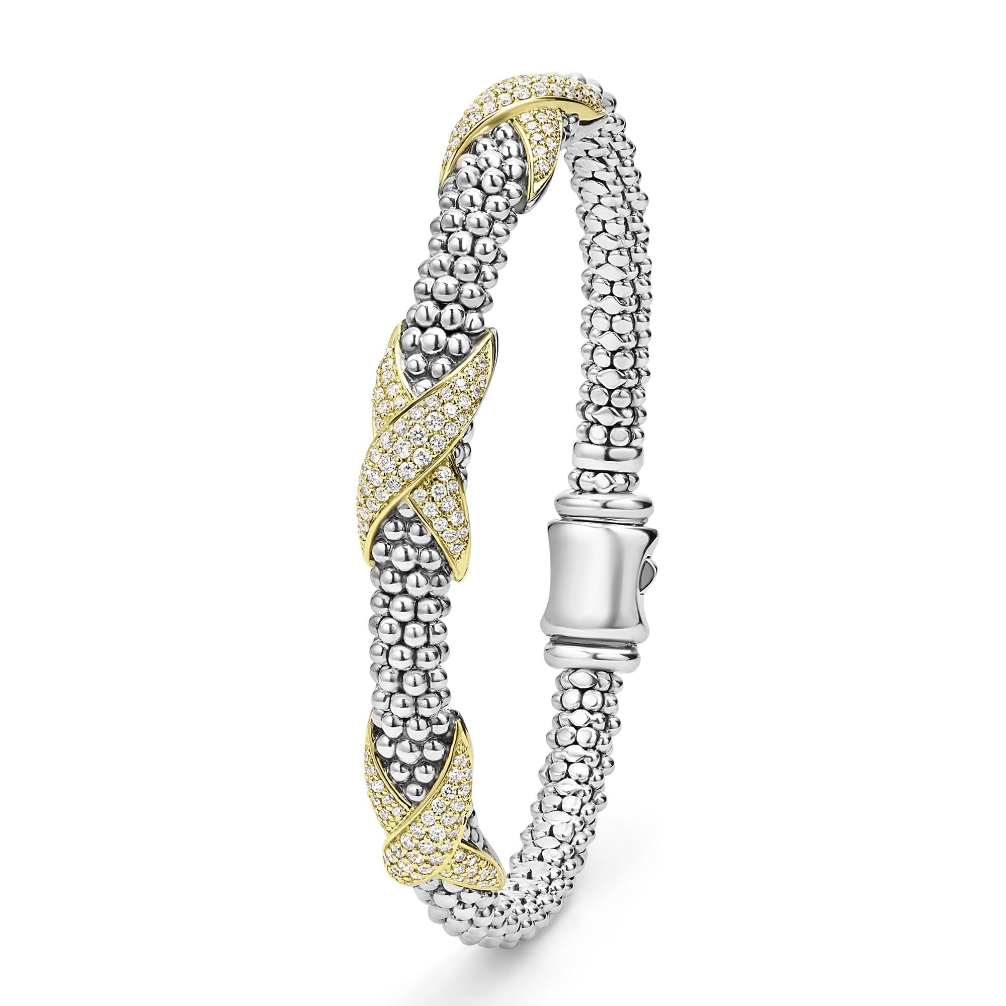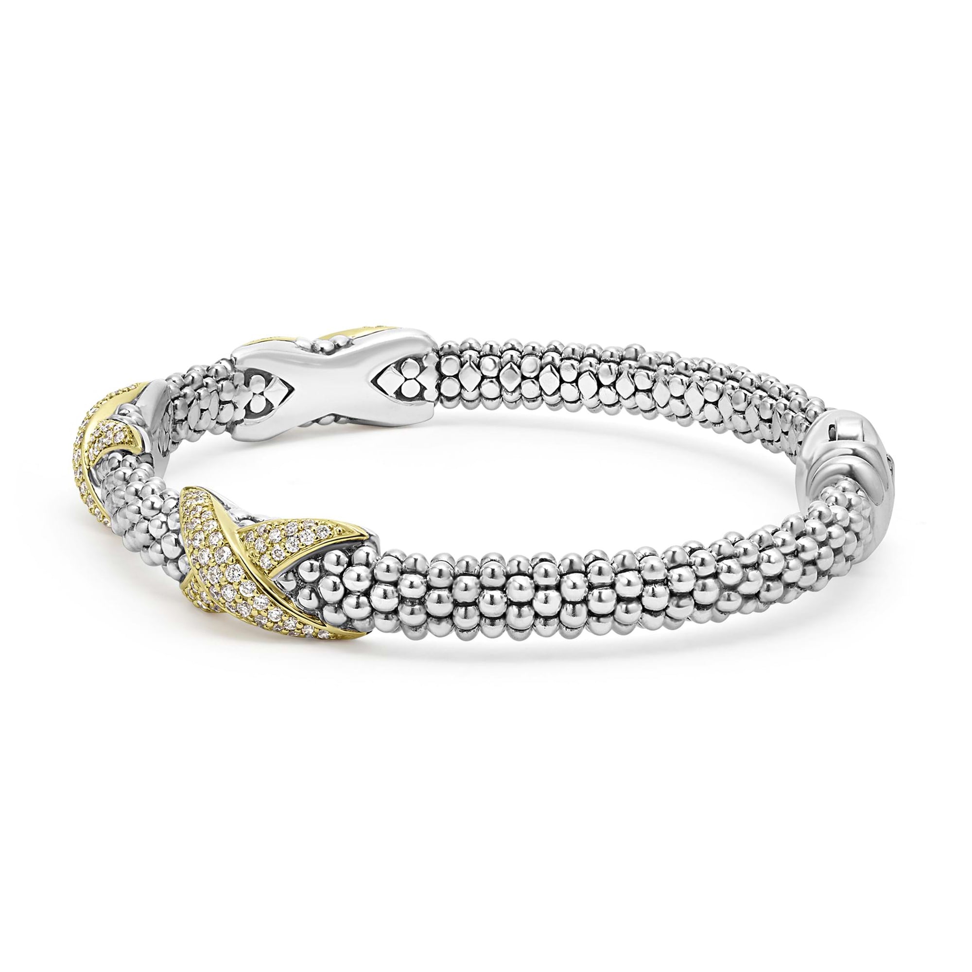 Sterling silver Caviar beading accented by three 18K gold and diamond X stations form this detailed bracelet. LAGOS diamonds are the highest quality natural stones.