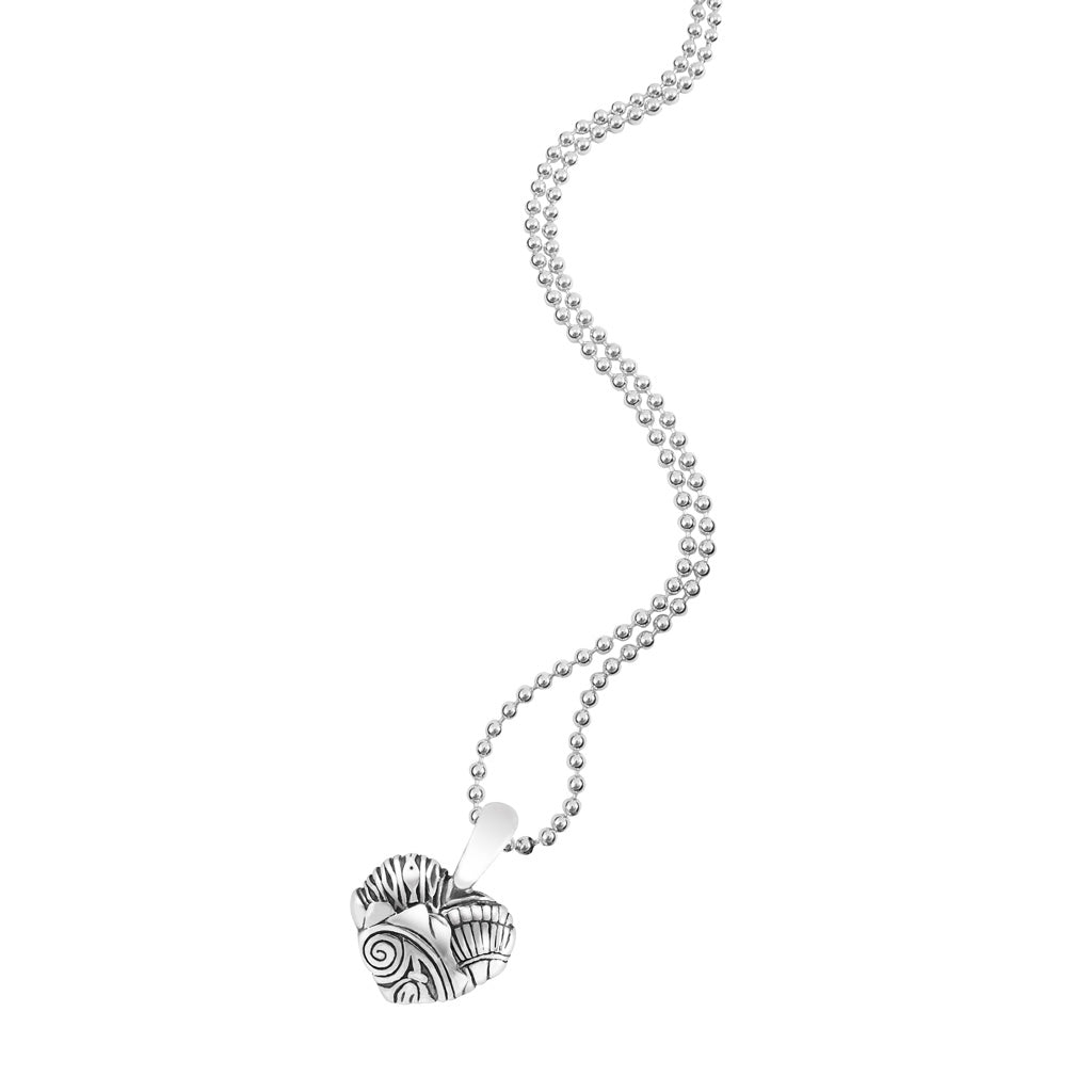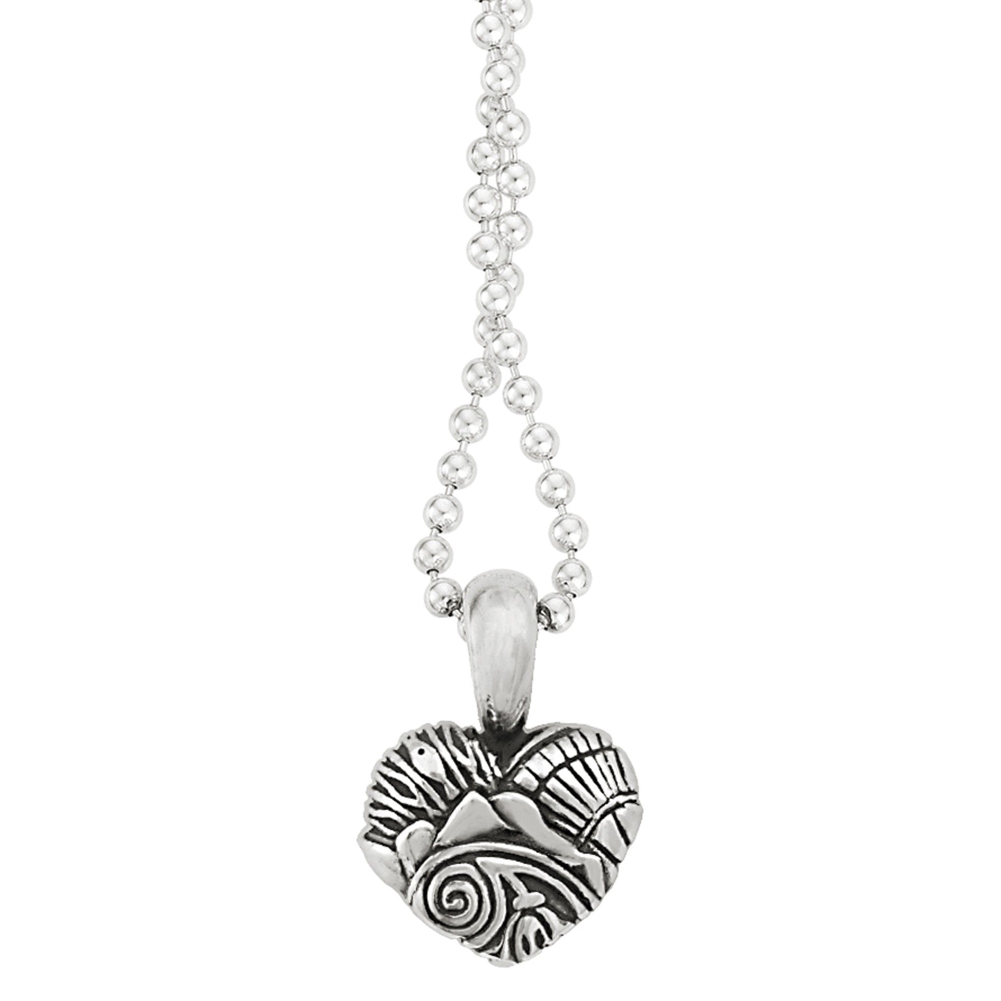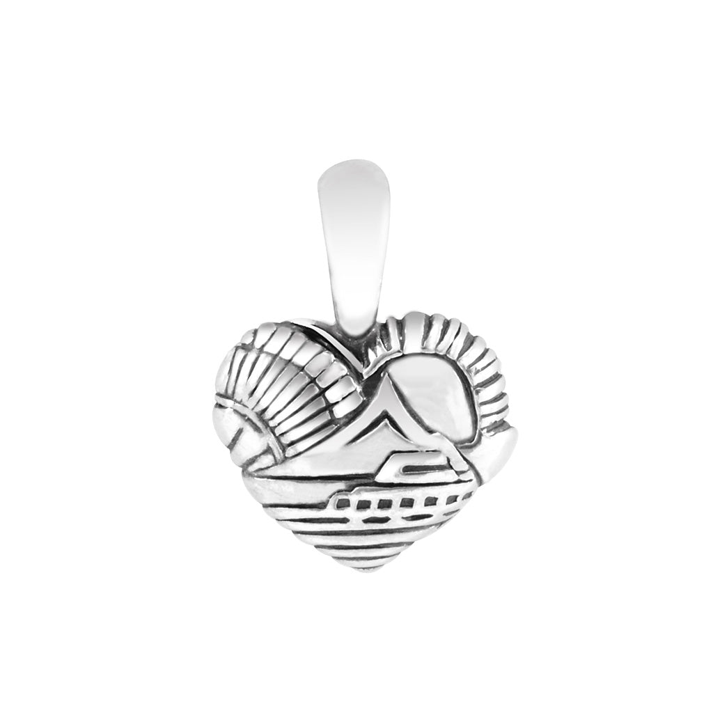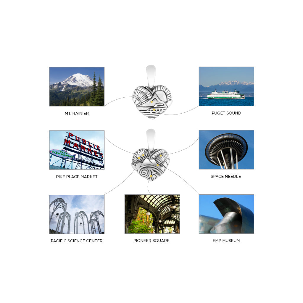 A sterling silver heart pendant detailing architectural and cultural icons of Seattle finished on a sterling silver ball chain.