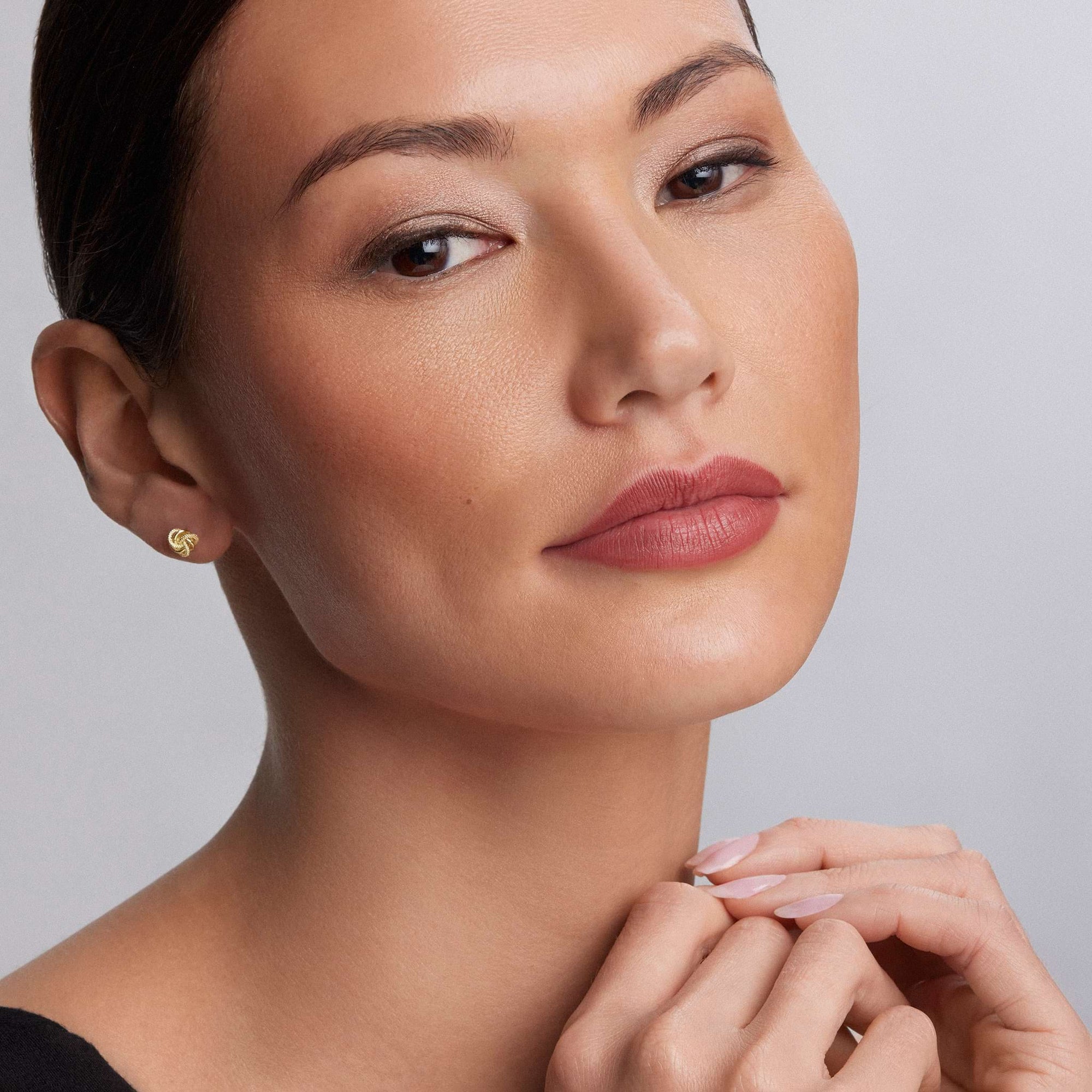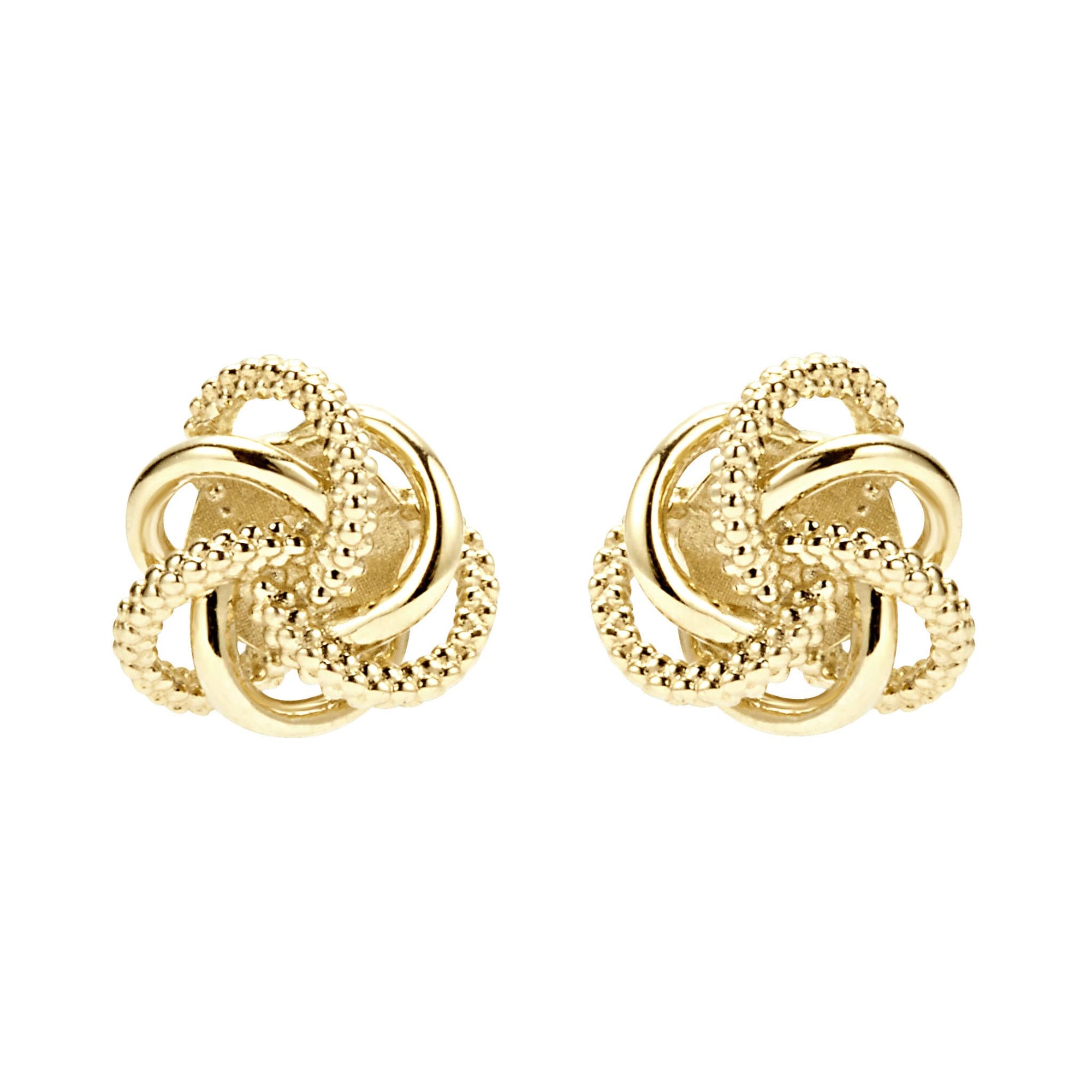 Love knot stud earrings formed of Caviar beaded and highly polished 18K gold bands.