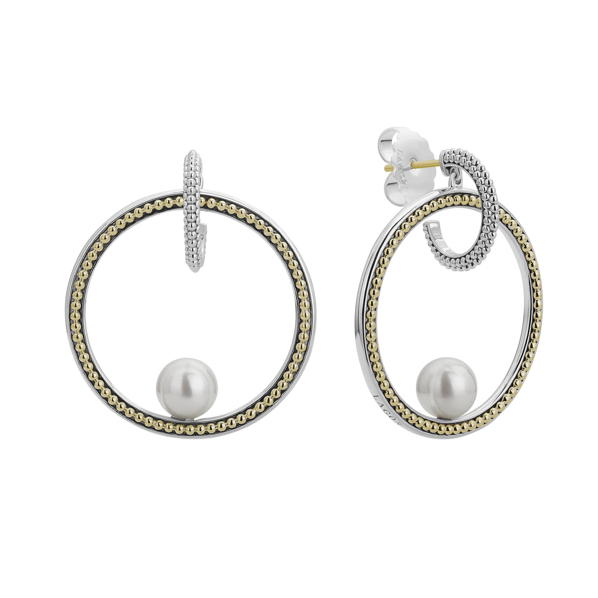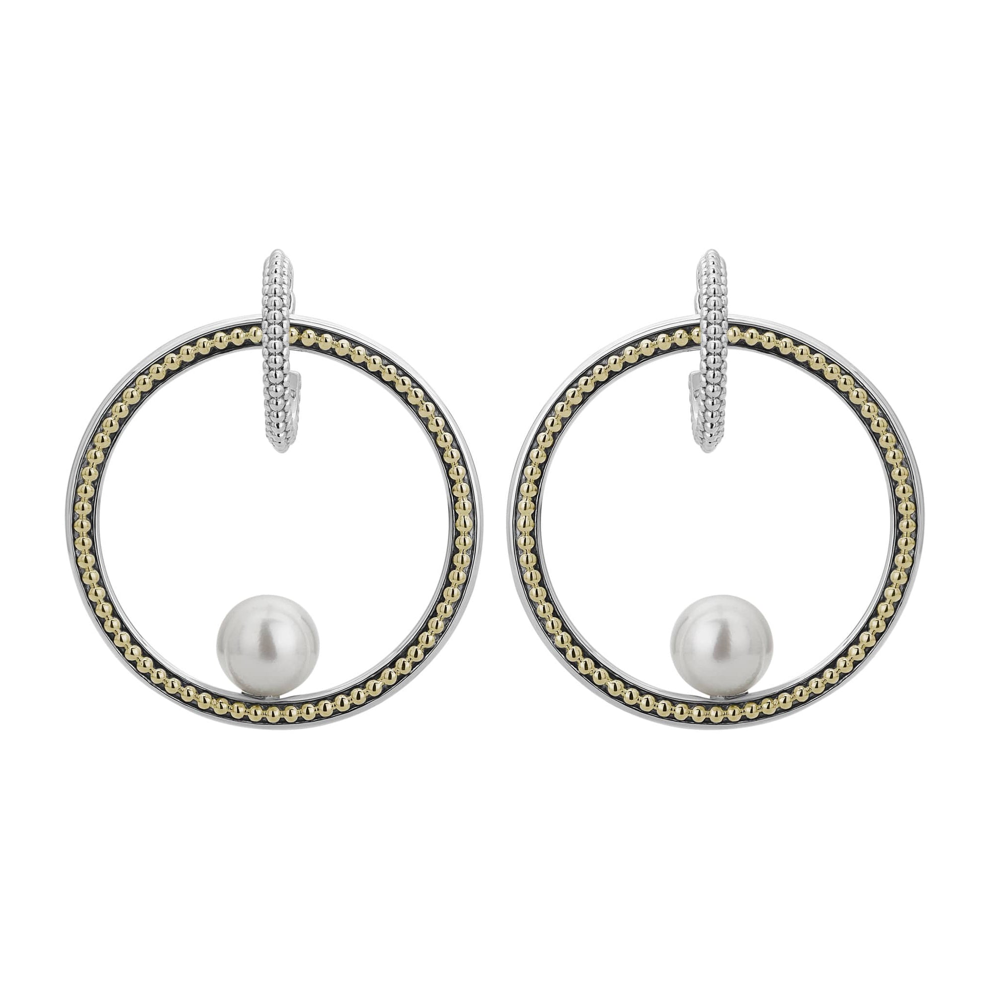Cultured freshwater pearls are the highlight of these hoop drop earrings with Caviar beading in 18K gold and sterling silver.