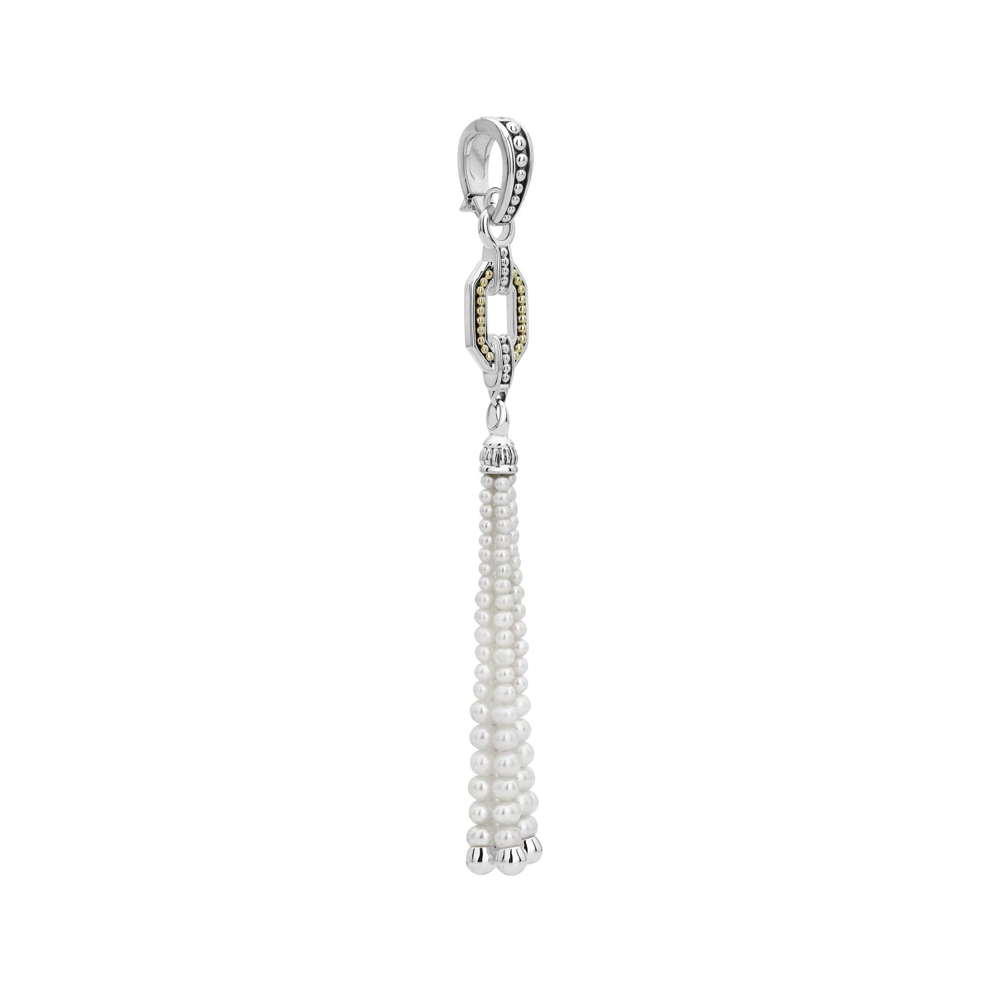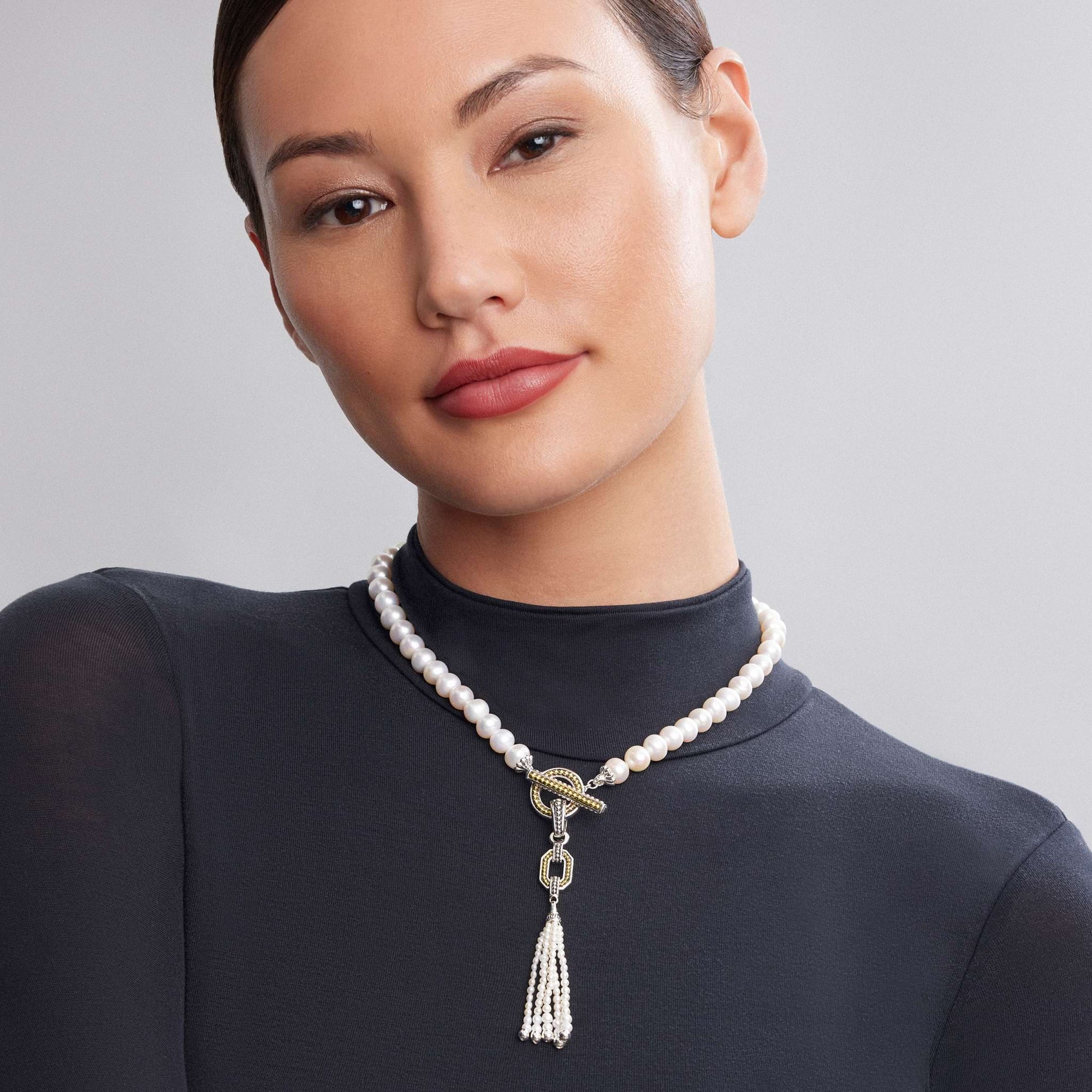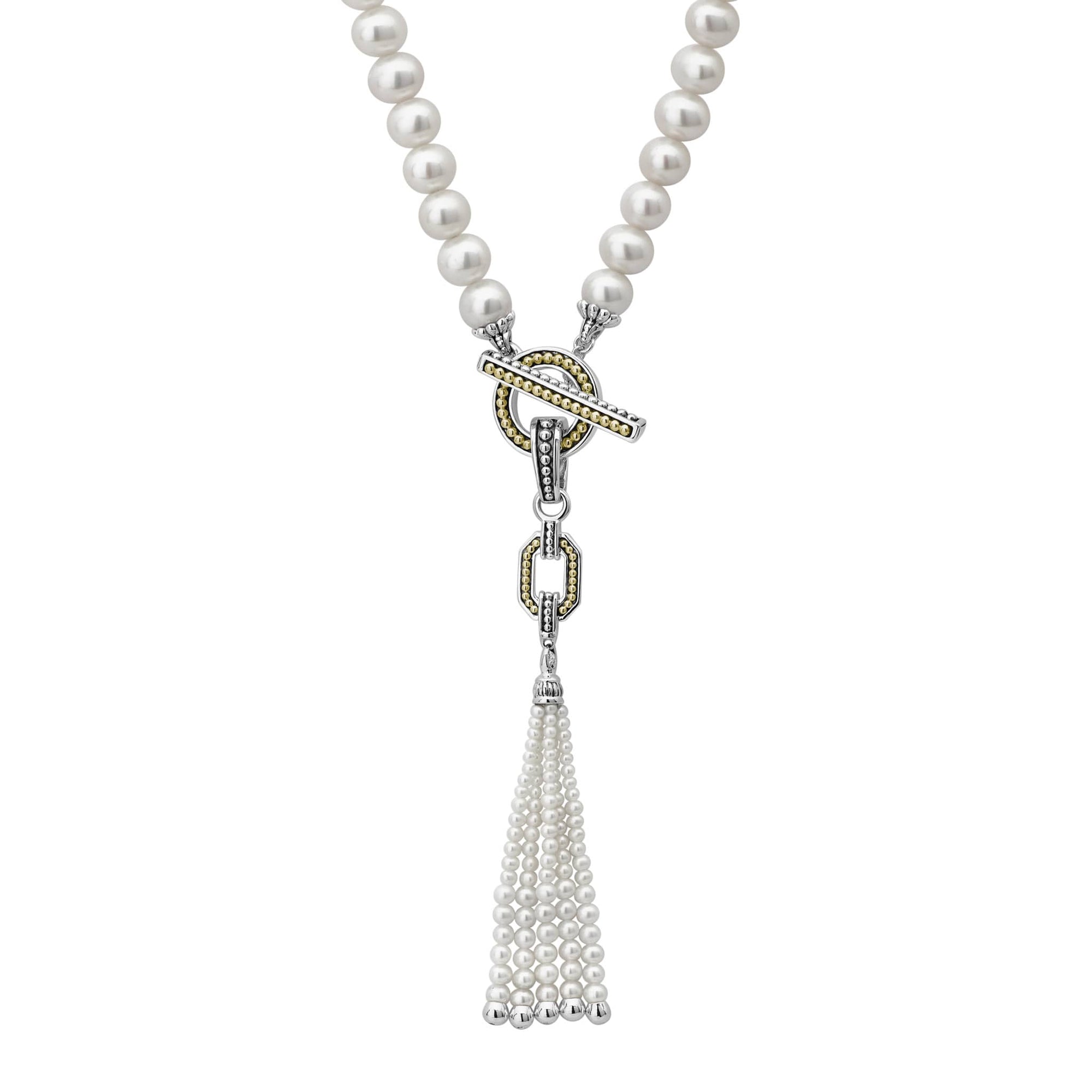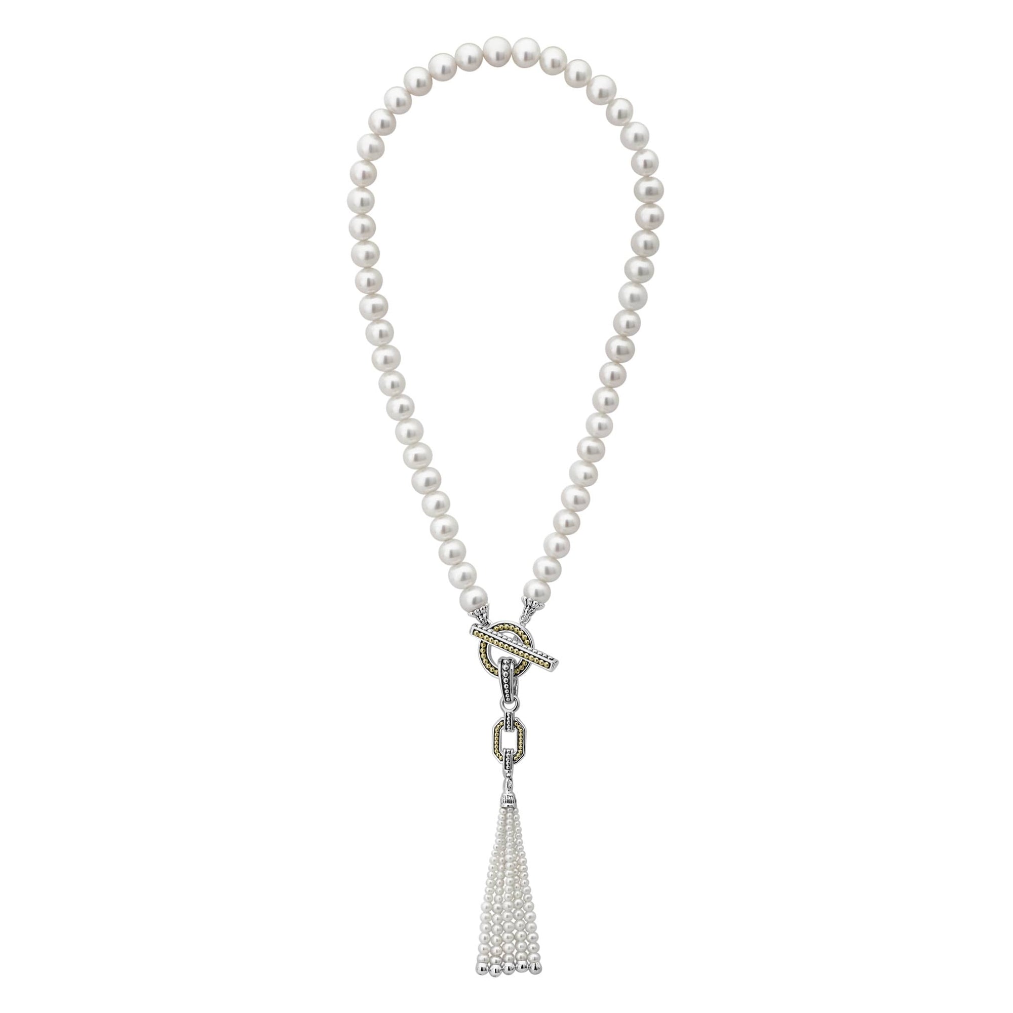 Cultured freshwater pearls form this single strand necklace with a pearl tassel, sterling silver, and 18k gold pendant with a toggle clasp.