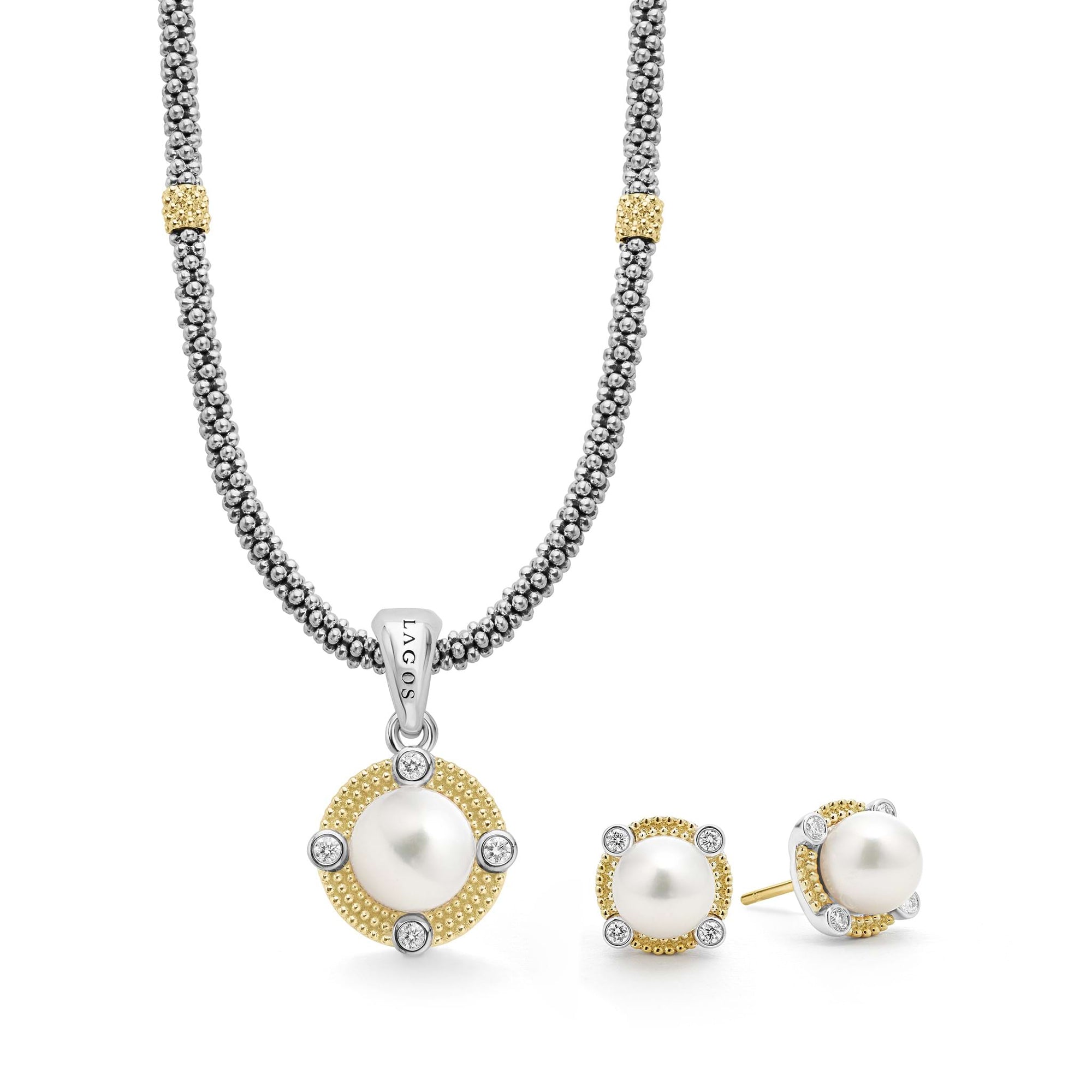 A LAGOS exclusive. One set of 18K gold and diamond cultured freshwater pearl necklace and earrings.