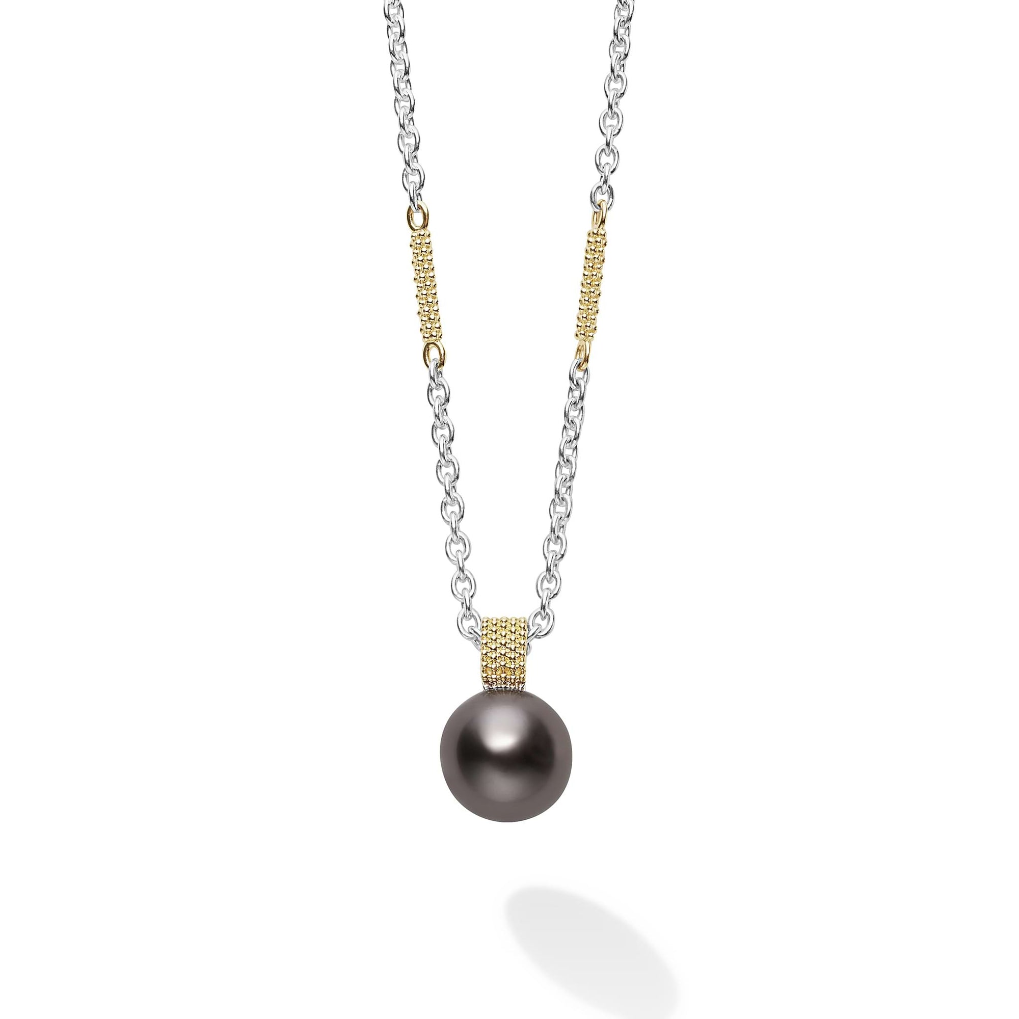 A LAGOS exclusive. One set of 18K gold tahitian black pearl necklace and earrings.