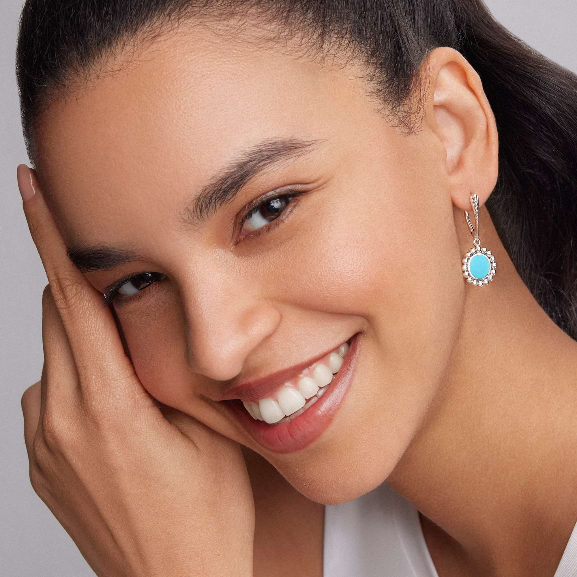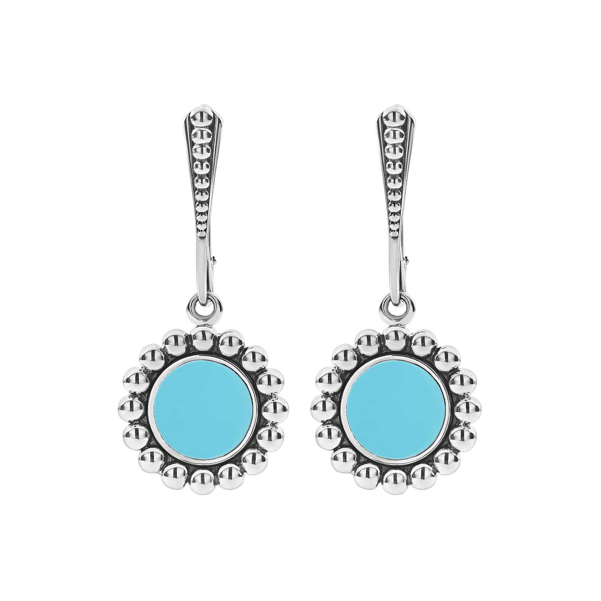 Blue ceramic circle drop earrings framed by sterling silver Caviar beading and finished with a lever back closure.