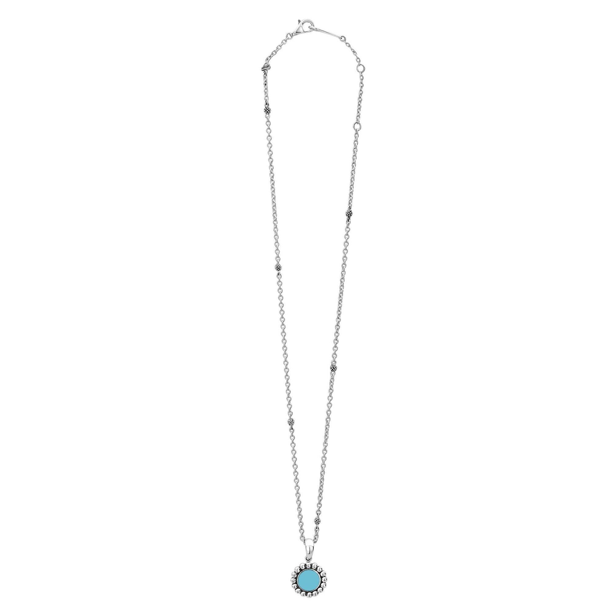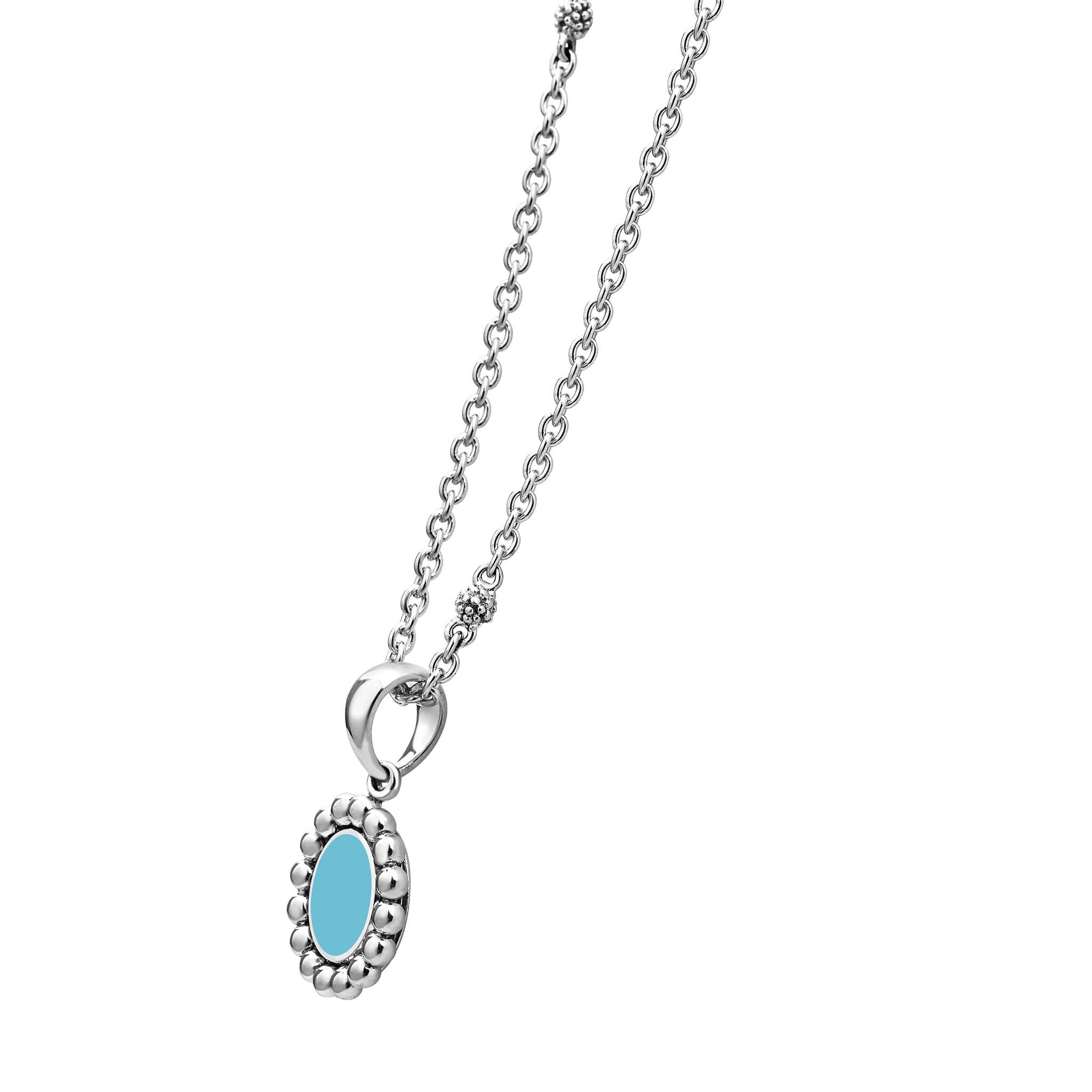 Blue ceramic pendant framed by sterling silver Caviar beading finished on a versatile link necklace with six sterling silver Caviar beaded stations.