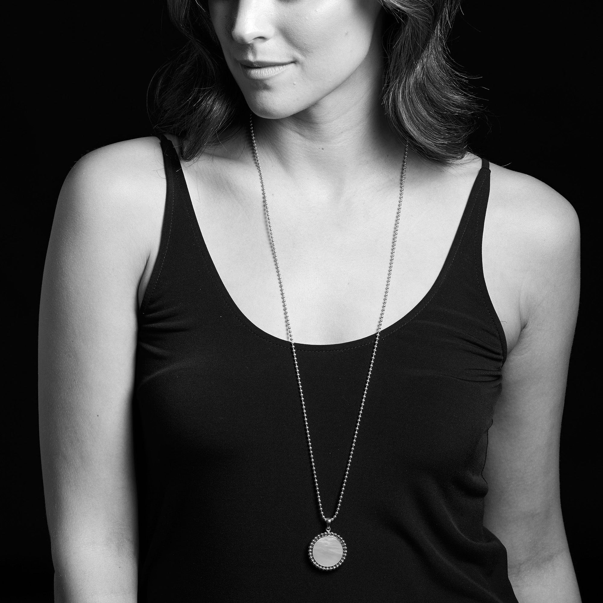 Mother of pearl gemstone pendant framed by sterling silver Caviar beading finished on a sterling silver ball chain necklace.