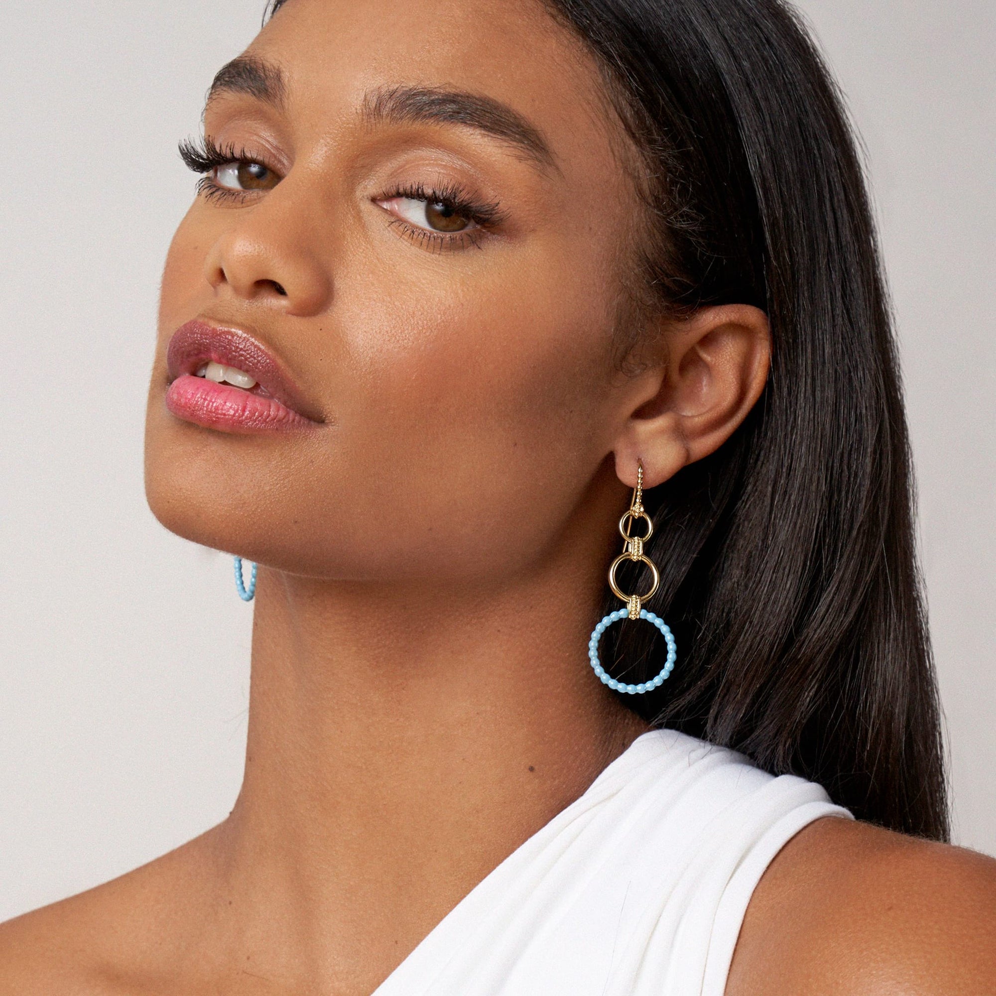Graduated circle drop earrings with smooth 18k gold and blue ceramic.